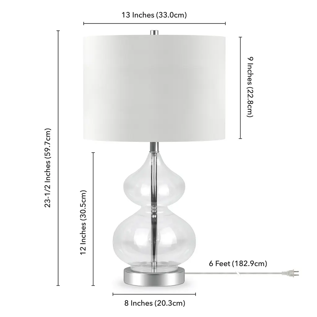 This lamp features the beautiful and iconic double gourd base. This luminary's base is crafted of glass finished in a glossy solid hue while its single bulb is highlighted by a linen French drum shade in a crisp chiffon color. Features: • Premium materials have been used making this lamp: linen in the shade, glass in the frame and base, UL certified wiring components. And the finishes are hand done: glossy navy for an opqaue finish, glossy white to create a shine and nickel, mercury and clear glass to brighten up the room. • The glass base is finished in clear glass making it a light and airy addition to any room. • It is paired with a French Drum shade. • The shade is in a crisp chiffon white color and is made of 100% linen with polystyrene lining for durability. • Rated for one 60W incandescent bulb; 9W LED bulb, 13W fluorescent (CFL) bulb, or 9W self-ballasted LED bulb. E26-base bulb. • Includes a 6 ft. cord. • Clean with a soft, dry cloth; no harsh chemicals or abrasive cleaning materials. Compatibility: • Compatible with smart light bulbs such as Philips Hue, LIFX, IOTTY, Texsens, Flux, Samsung SmartThings, WiZ, and C by GE. Bulb is not included.