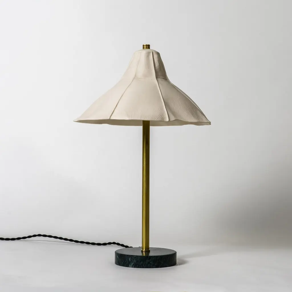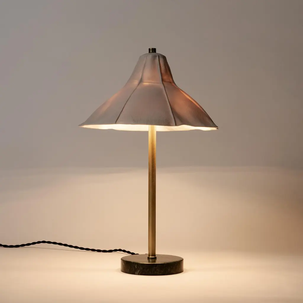 Kawa table lamp 03 by Luft TanakaA plug-in portable table lamp with a leather-cast porcelain diffuser, organic and asymmetrical in form, which casts a warm and comforting glow when lit. The diffuser is supported by a black metal stem and a polished marble base. An unique and striking accent lamp perfect for a living room or a reading room/study. Dimensions :Approximately 12" diameter x 18" height3 x G8 sockets. LED bulbs included.Can be wired for 120v or 220v with appropriate plugs.Standard configuration ships with a black fabric braided cord with an in-line on/off switch. In-line dimming switch available upon request. Handmade. One-of-a-kind.Kawa Series by Luft TanakaThe unusual and painstakingly honed technique used to create the Kawa Series is distinct to Luft Tanaka Studio. Each Kawa piece begins as a sketch on paper. With the assistance of 3-D modeling, we create patterns for a leather mold. After the mold is sewn and prepared for casting, liquid porcelain is poured inside, over time forming a thin wall along the leather surface. The mold is then carefully cut open at the seams and delicately peeled off the porcelain.Kawa Series Background InfoThe Kawa Series was initially conceived in early 2012, when Luft’s thesis project at the Parsons School of Design called for a varied collection of eye-catching objects. Guided as he often is by his wabi-sabi tendencies, Luft became obsessed with devising a new system of production where process dictated form—and where objects created in multiples could still be one-of-a-kind. He experimented with a number of mediums over the course of a few months, but his aha-moment came one afternoon when he stumbled upon a discarded leather couch on a Manhattan curb. (“Kawa” is Japanese for “leather” or “skin.”)Luft had been studying the process of slip-casting, a traditional ceramic technique used to create nearly-identical objects—though typically using solid plaster molds. His technical understanding allowed him to see an opportunity in that curbside leather couch, so he did what any industrial design student would do: He took his utility knife out of his bag, stripped the couch of its leather, and brought his new materials back to the studio for immediate experimentation.By testing many different types of leather, as well as different ways to fabricate the molds, Luft gradually evolved the process from a messy first batch, where many of the pieces didn't survive the kiln, to test pieces that bore the early marks of his signature: both weird and beautiful, hard and soft, expressive, and full of personality.