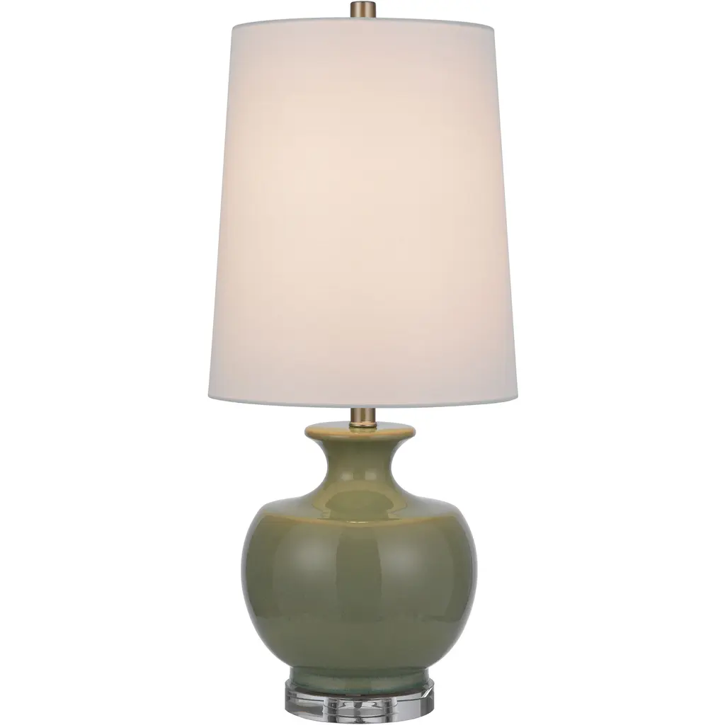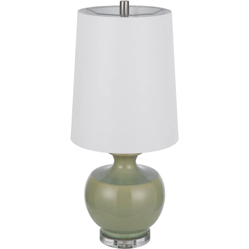 Add a coordinated look to your room with this matching set of glass table lamps. They feature a wide bottom jar design with a mustard green painted finish. The lamps ship together with matching white fabric high top shades.