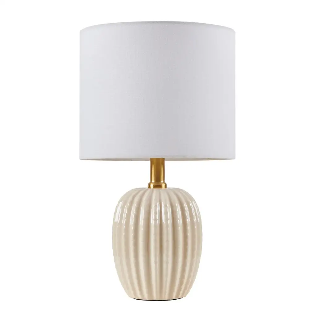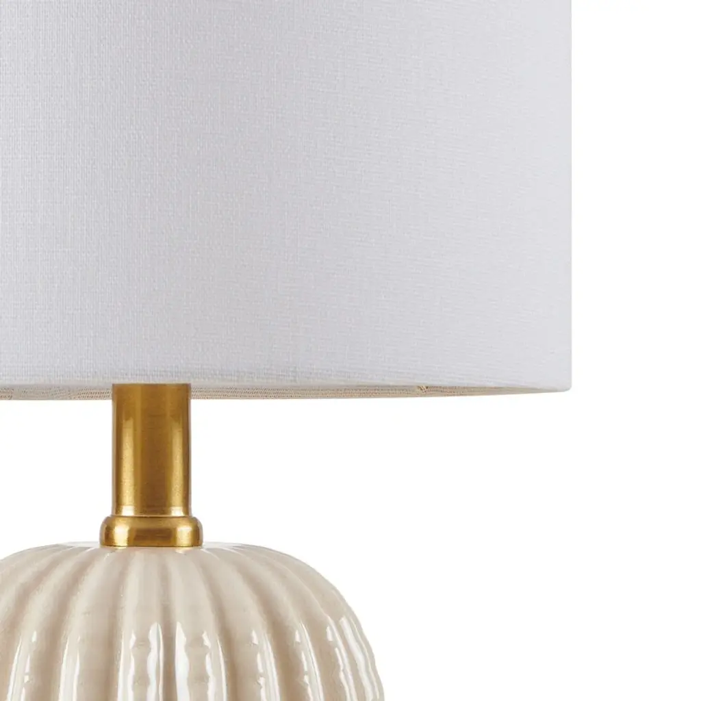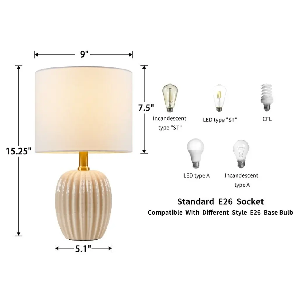 Elevate your space with our 15” bedside lamp, featuring a clean, retro design. This lamp boasts a white drum fabric shade that diffuses soft, warm lighting, creating a cozy ambiance in any room. Its round, ribbed ceramic base offers a timeless appeal, while the antique brass finish socket adds a touch of elegance. Perfect for bedside tables, side tables, or hallway consoles, this small table lamp is ideal for setting the perfect mood.Features: Dimension:Cleaning Note: