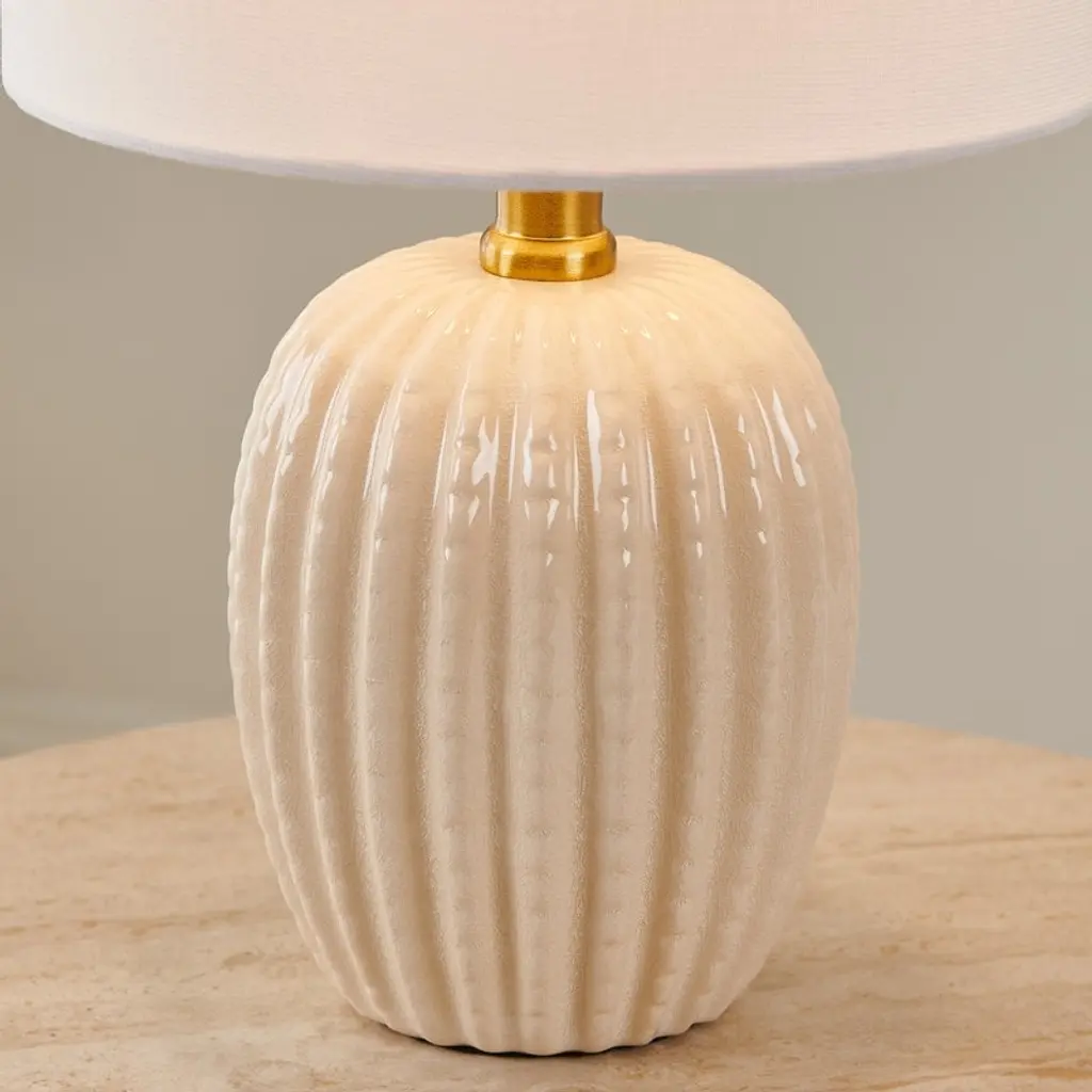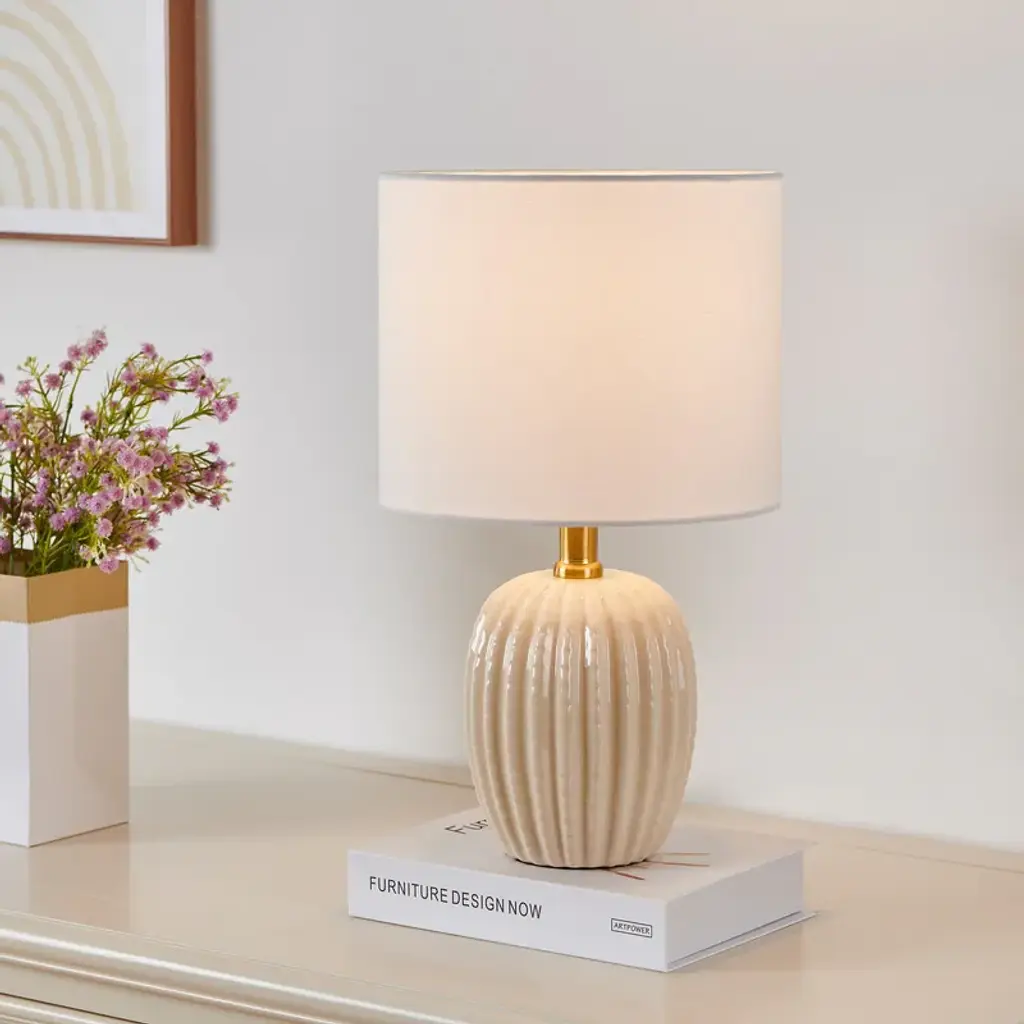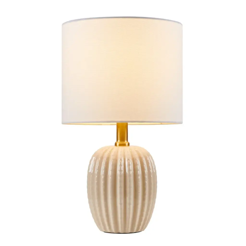 Elevate your space with our 15” bedside lamp, featuring a clean, retro design. This lamp boasts a white drum fabric shade that diffuses soft, warm lighting, creating a cozy ambiance in any room. Its round, ribbed ceramic base offers a timeless appeal, while the antique brass finish socket adds a touch of elegance. Perfect for bedside tables, side tables, or hallway consoles, this small table lamp is ideal for setting the perfect mood.Features: Dimension:Cleaning Note: