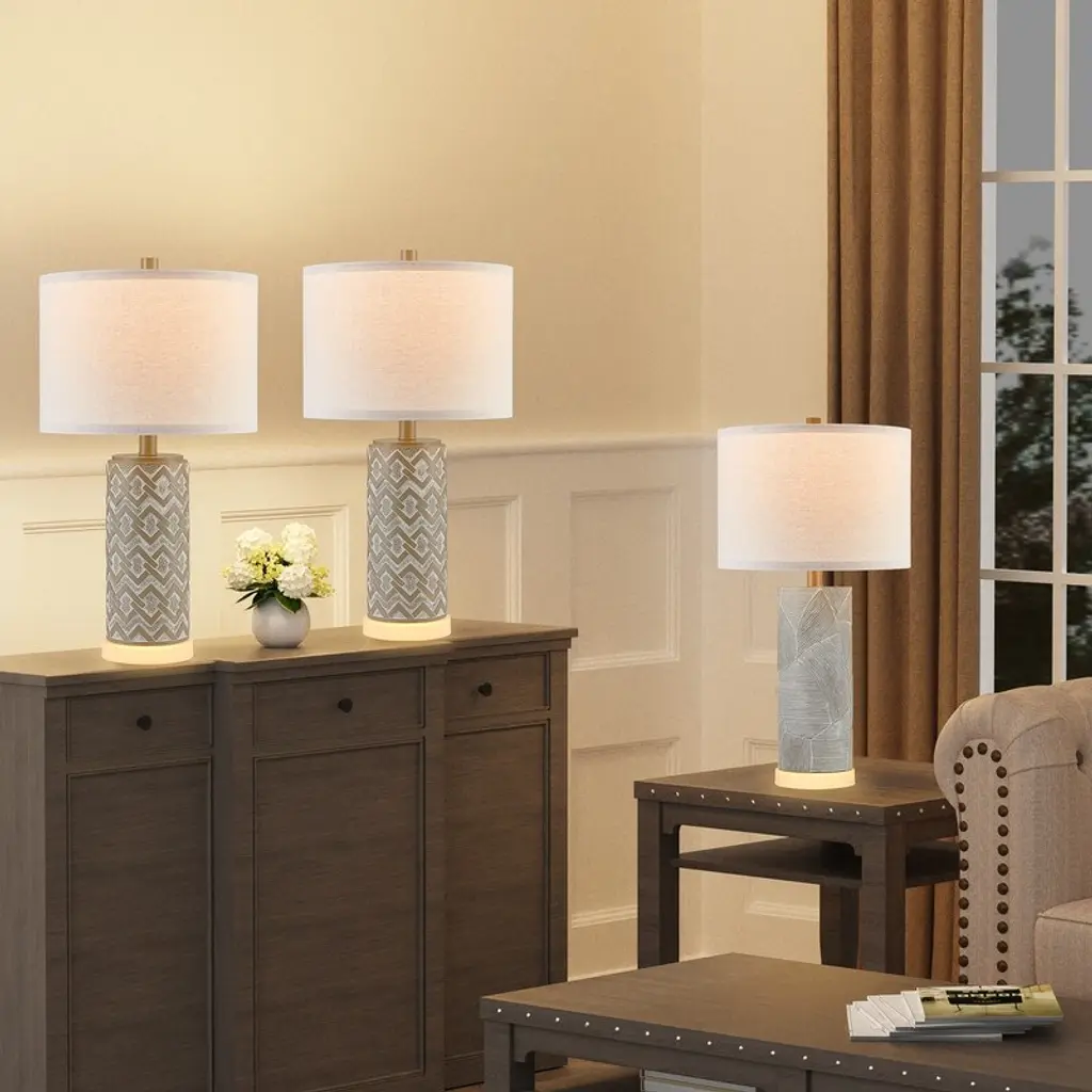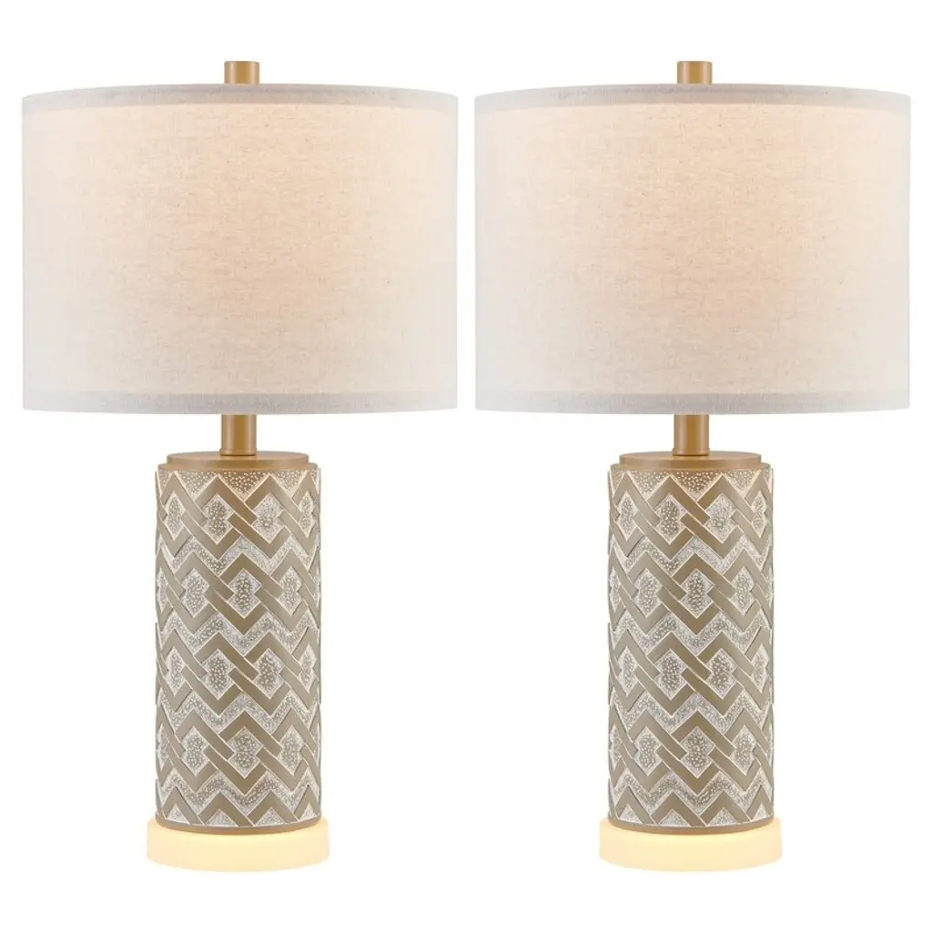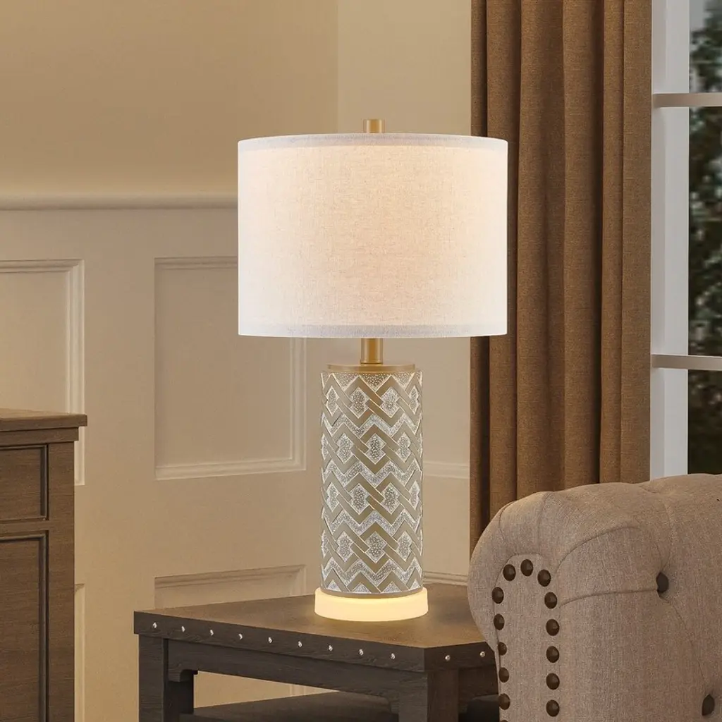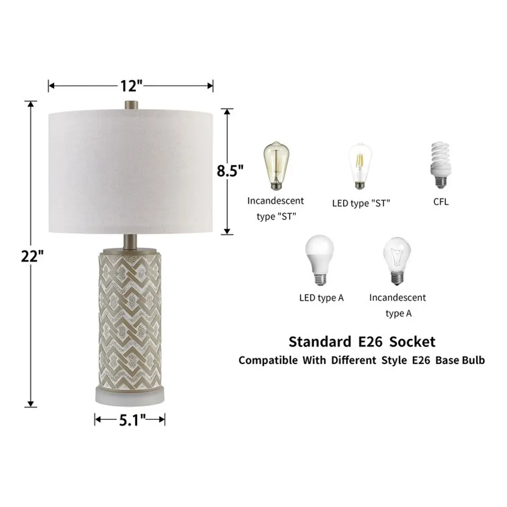 This set of two table lamps features gray resin pillars with a distressed white finish, bringing a touch of farmhouse style to a range of decors. Equipped with a built-in LED night light at the base, these lamps are ideal for bedside tables, side tables, or hallway consoles, adding both style and practicality. The fabric lampshade is compatible with E26 medium base bulbs (LED bulbs included).Features: Dimension:Cleaning Note: