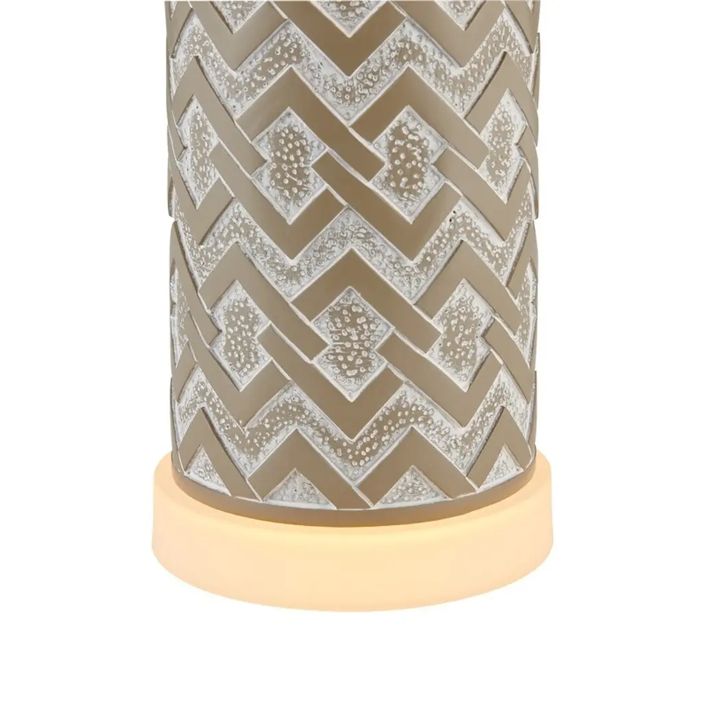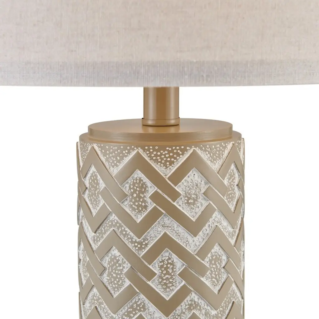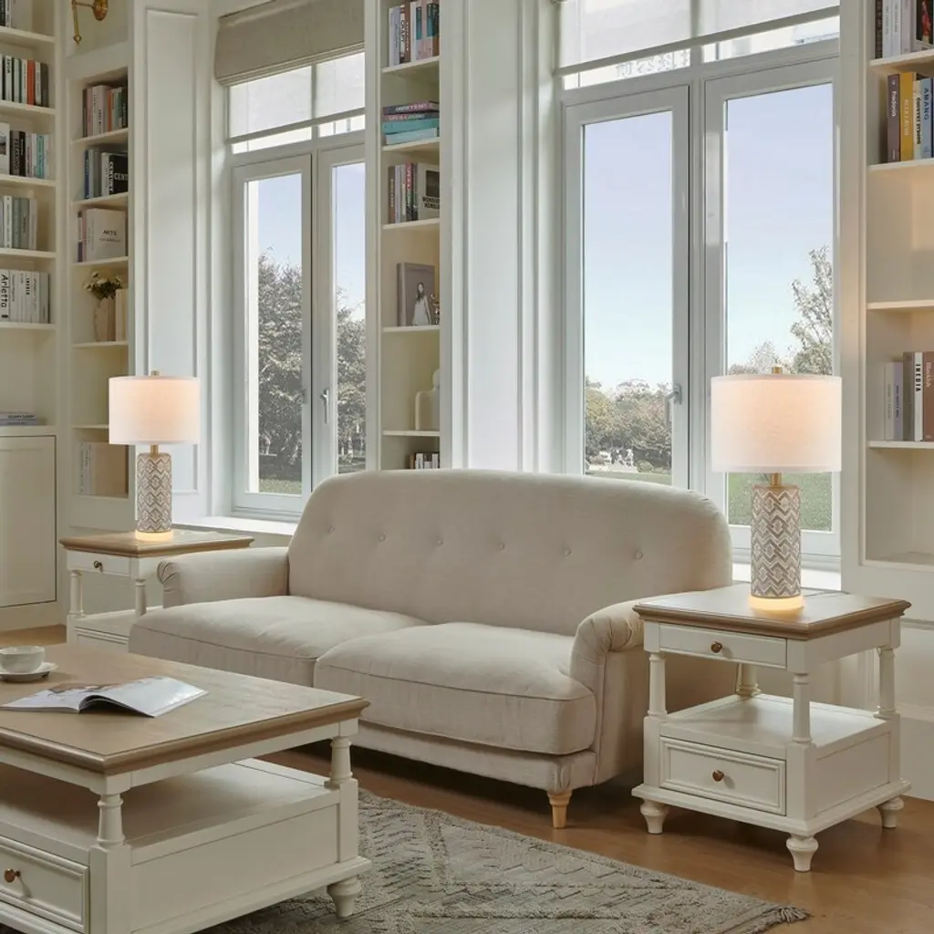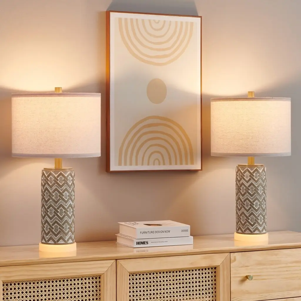 This set of two table lamps features gray resin pillars with a distressed white finish, bringing a touch of farmhouse style to a range of decors. Equipped with a built-in LED night light at the base, these lamps are ideal for bedside tables, side tables, or hallway consoles, adding both style and practicality. The fabric lampshade is compatible with E26 medium base bulbs (LED bulbs included).Features: Dimension:Cleaning Note: