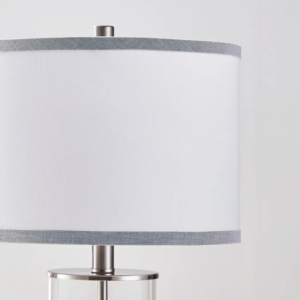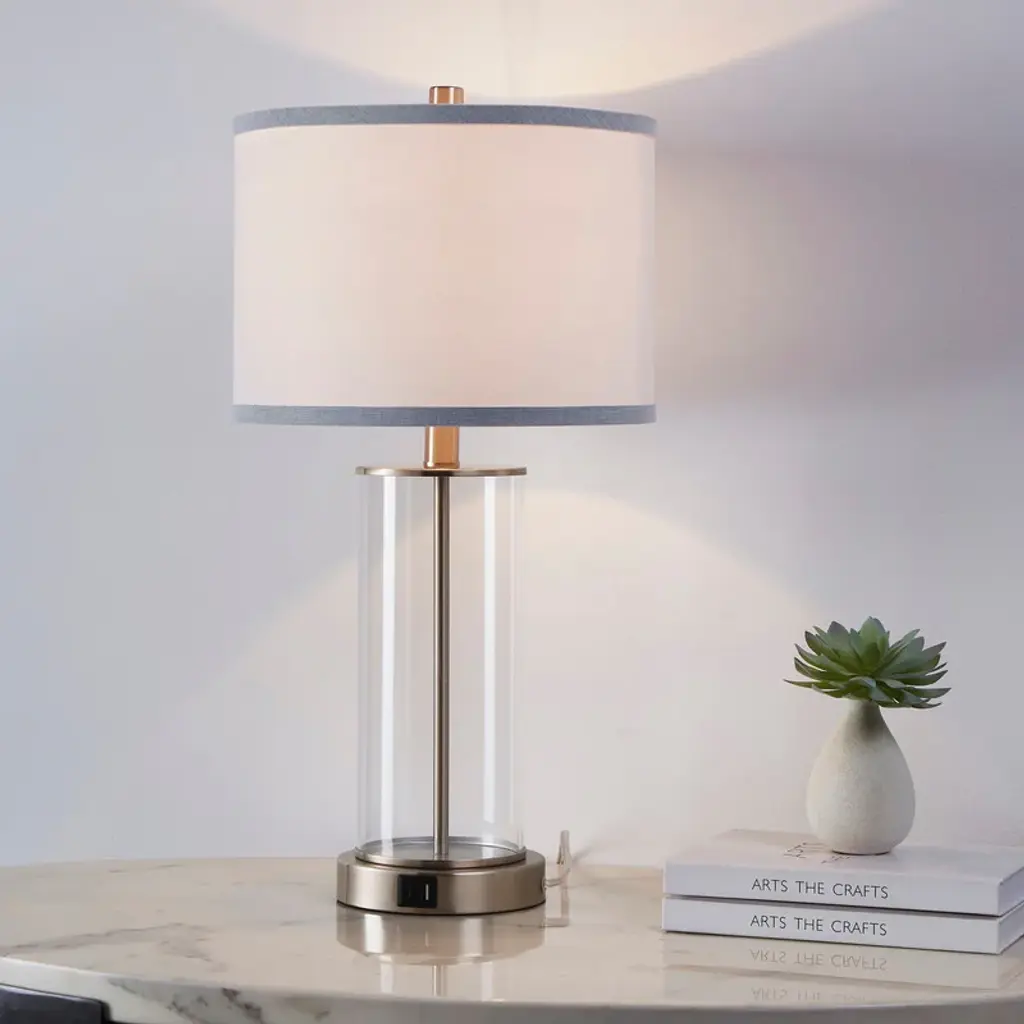 The striking silhouette is expertly handcrafted of clear glass, its large cylinder revealing a sleek stem. A cream-colored linen shade provides a tonal beauty, and the sleek metal neck, and base beautifully set off the clear glass and lend a note of glamour. It's easy to turn it on/off or adjust the brightness via touch control. Equipped with a dual USB port and one AC outlet to keep your smartphones, laptops, pads and other devices charging even if the light is off. Come with two lamps.Features: Dimension:Cleaning Note: