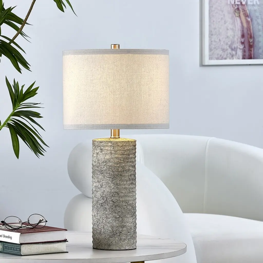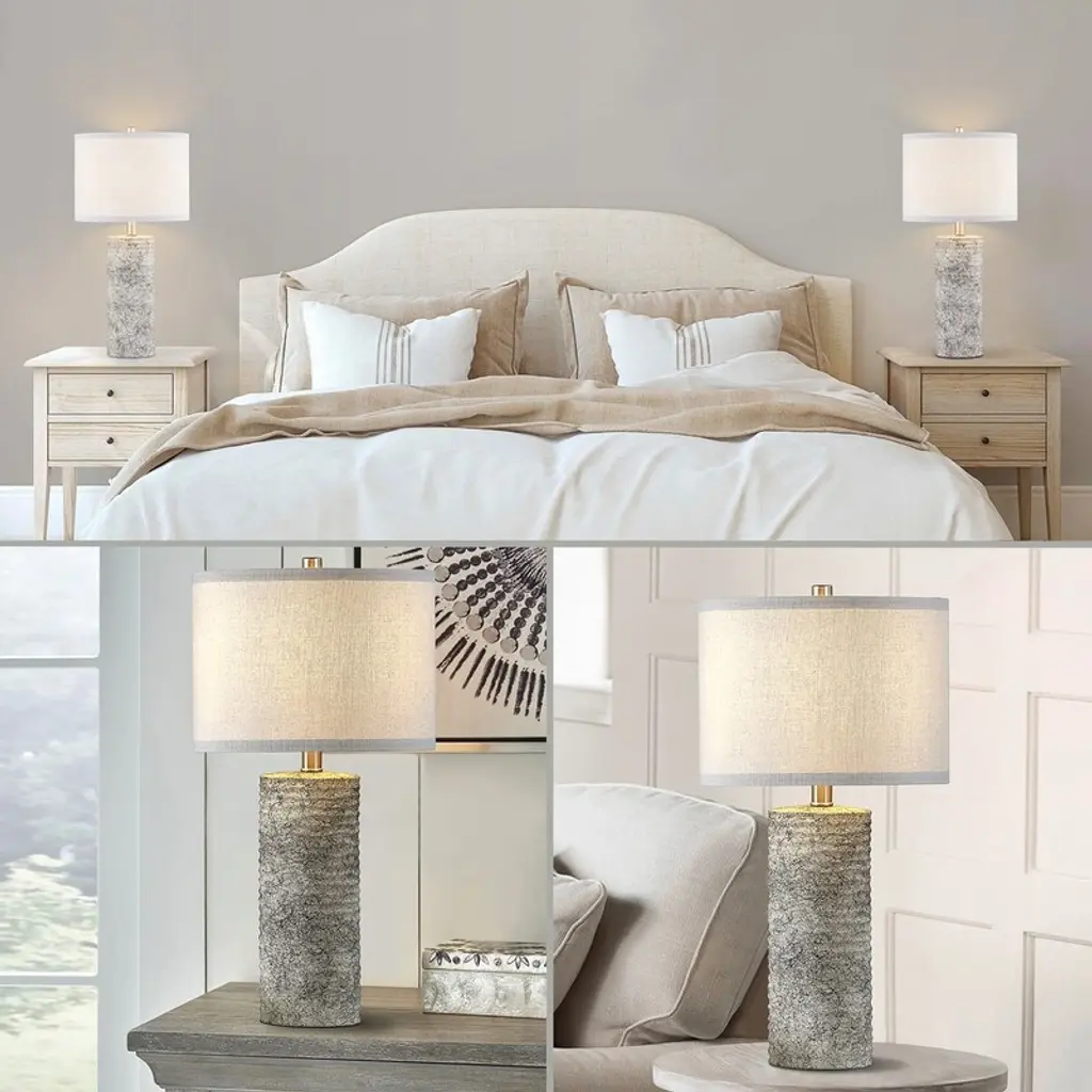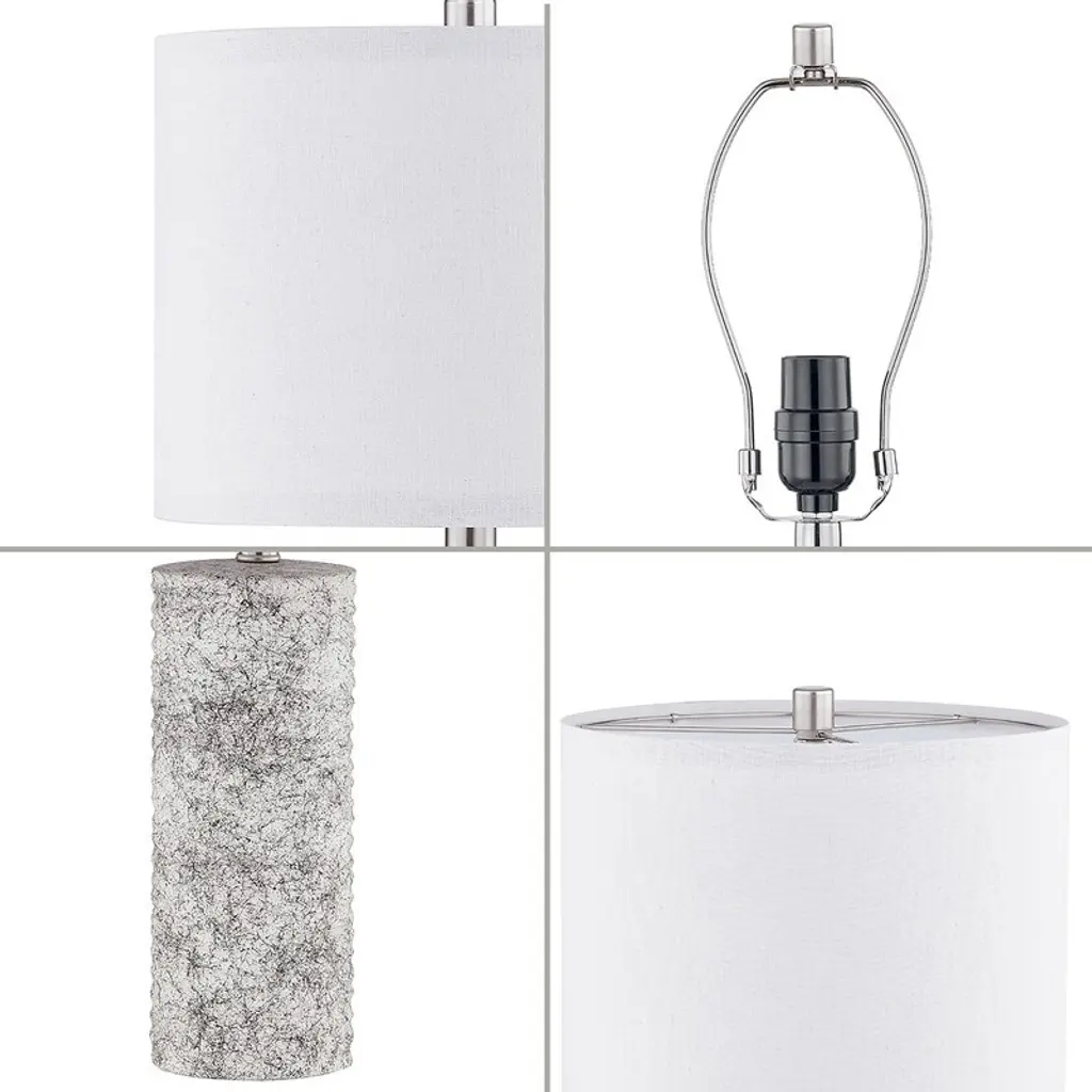 Exquisite in every way, from its fluted patterning to splash-ink glazed effect, this ceramic table lamp set serves as a grace note in any room. The silver finish metal parts give it a soft luster, and the linen shade diffuses the light for a soft glow. This lamp set is a serene choice for the bedroom or living room. On/off switch located on lamp socket.Features: Dimension:Cleaning Note: