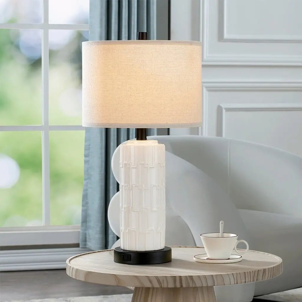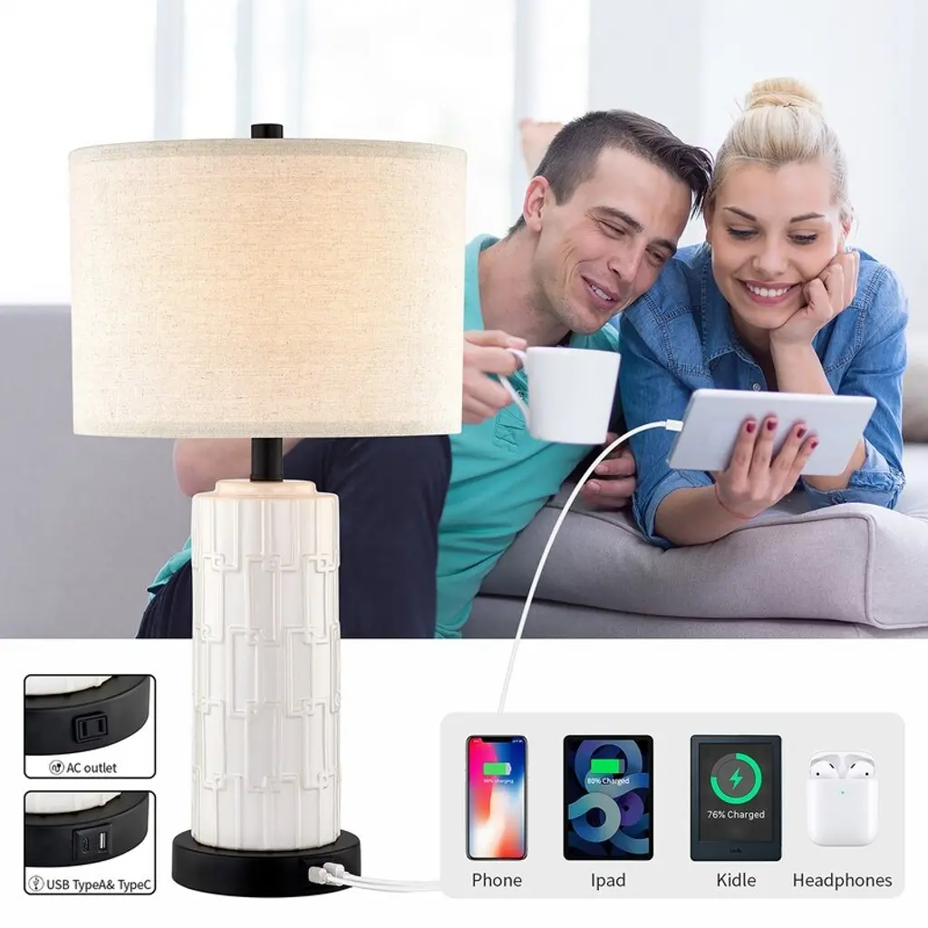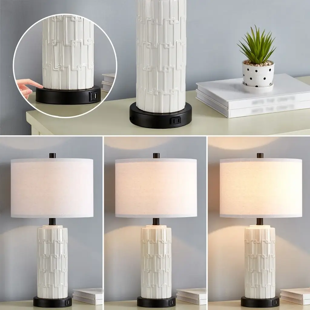 Crafted of ceramic and glazed to accentuate its diamond carved motif and its reactive glaze technique for depth of color with just-like-vintage distressing. A cream-colored linen shade provides a tonal beauty, and the water-based black finial, neck, and base bring an air of elegance. Touch anywhere on the metal base to adjust the brightness of the light up to three levels. Equipped with one dual USB port, and one AC outlet to make sure your smartphones, laptops, pads, and other electronic devices stay charged even the light is off.Features: Dimension:Cleaning Note: