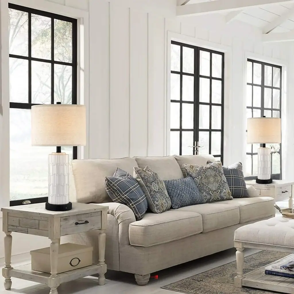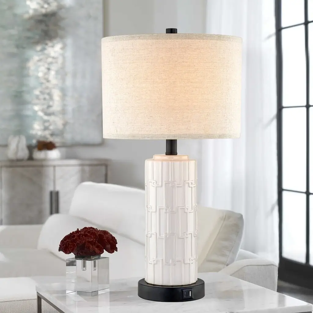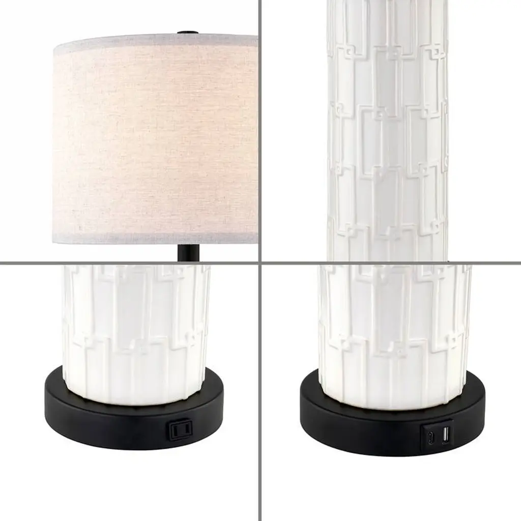 Crafted of ceramic and glazed to accentuate its diamond carved motif and its reactive glaze technique for depth of color with just-like-vintage distressing. A cream-colored linen shade provides a tonal beauty, and the water-based black finial, neck, and base bring an air of elegance. Touch anywhere on the metal base to adjust the brightness of the light up to three levels. Equipped with one dual USB port, and one AC outlet to make sure your smartphones, laptops, pads, and other electronic devices stay charged even the light is off.Features: Dimension:Cleaning Note: