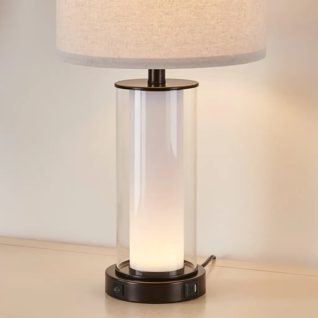Stylish yet simple, classic clear glass and bronze combination works in today’s home decor. This table lamp comes with a night light providing a comfortable light via a white acrylic cylindrical-shaped base. It’s suitable for the bedside at the mid-night and dawn. Fabric lampshade matches the rustic style and brings much light. With a rotary switch on the socket and a rocker switch on the base, you can turn the main light on, or night light on, or both on, or both off. Features: Dimension:Cleaning Note: