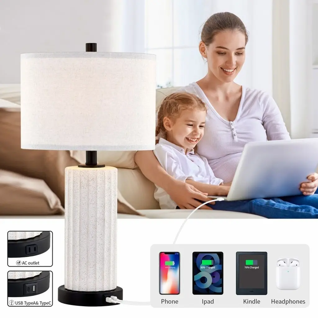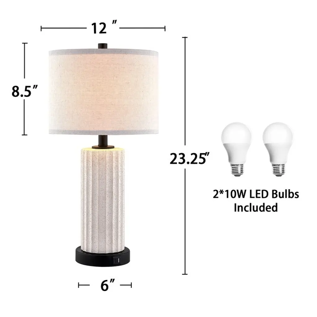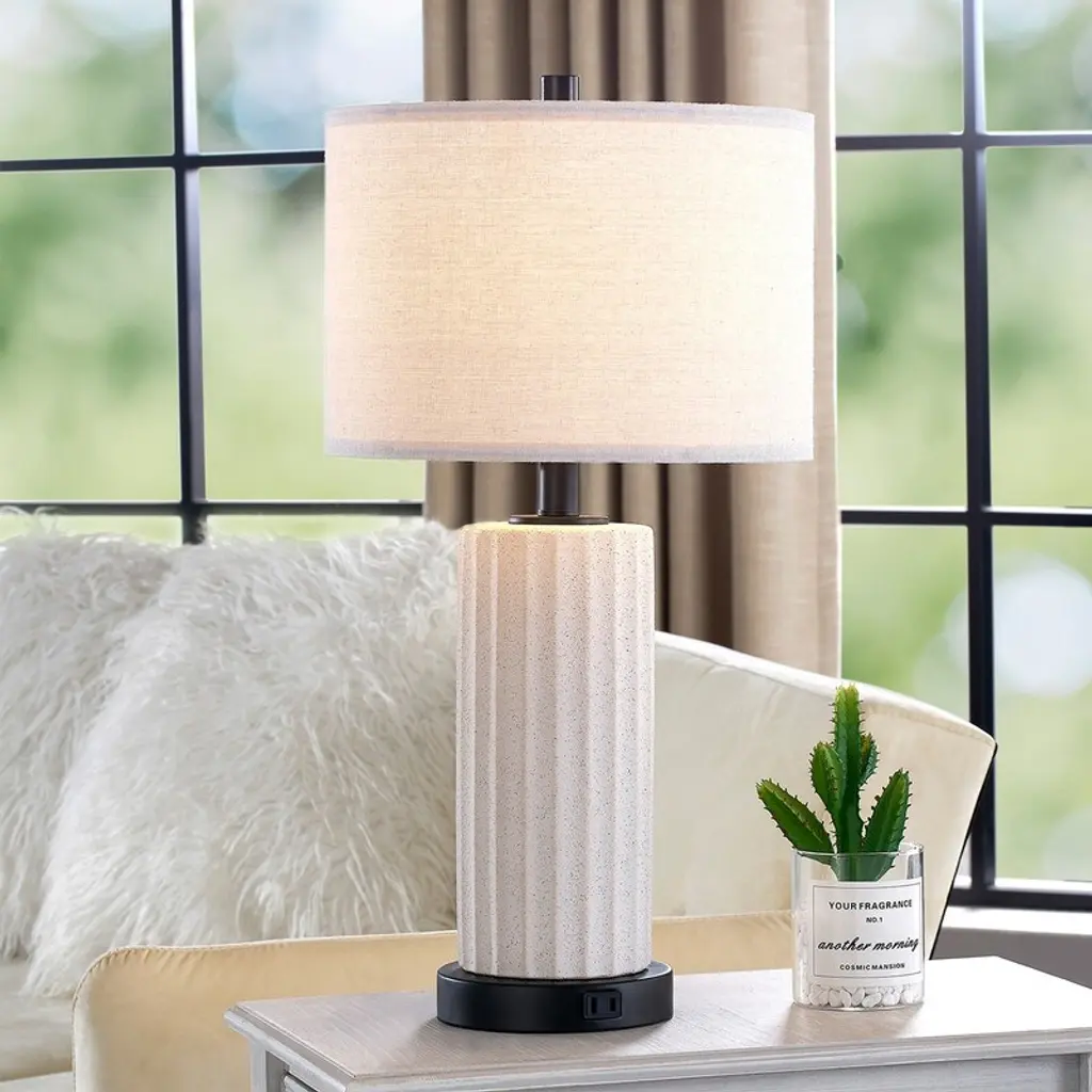 Ceramics column offers the rough-hewn texture of hand-sculpted clay, its regular ridges lending dimension to the distressed white finish. A cream-colored linen shade provides a tonal beauty , and the water-based black finial, neck, and base bring an air of elegance. Touch the anywhere of the metal base to adjust the brightness of the light up to three levels. Equipped with one dual USB port, and one AC outlet to make sure your smart phones, laptops, pads and other electronic devices stay charged even the light is off.Features:Cleaning Note: