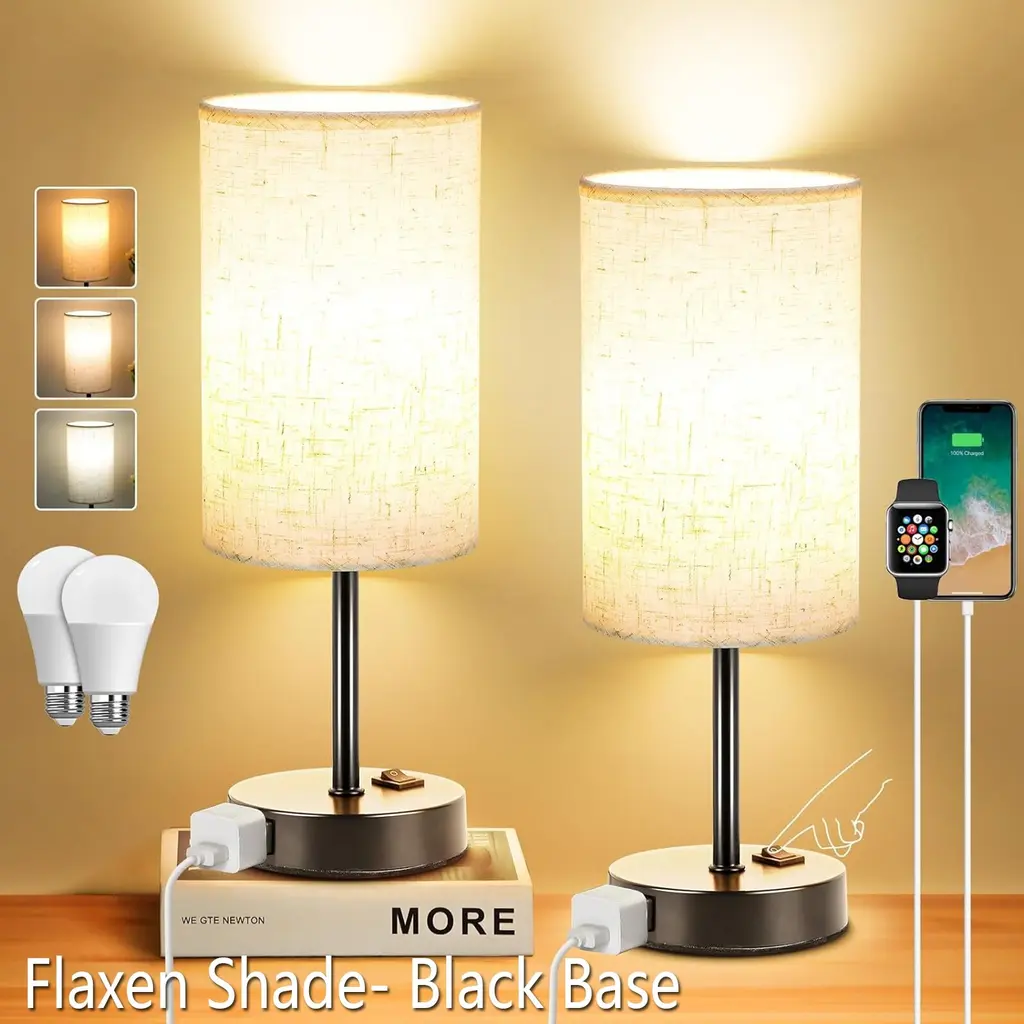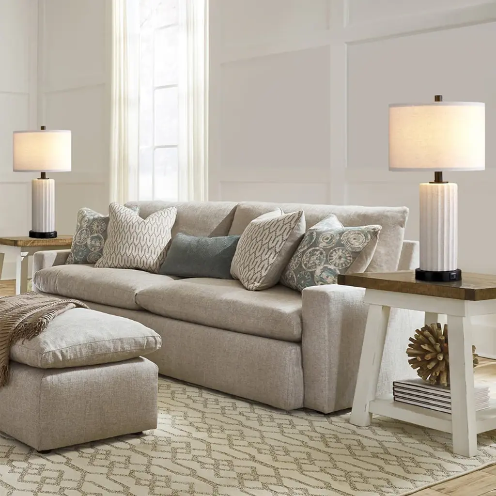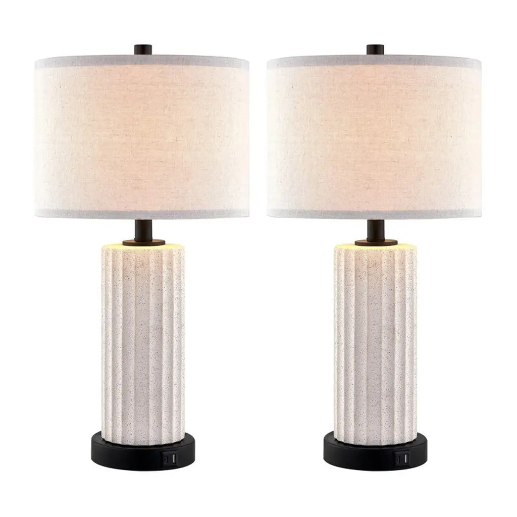 Ceramics column offers the rough-hewn texture of hand-sculpted clay, its regular ridges lending dimension to the distressed white finish. A cream-colored linen shade provides a tonal beauty , and the water-based black finial, neck, and base bring an air of elegance. Touch the anywhere of the metal base to adjust the brightness of the light up to three levels. Equipped with one dual USB port, and one AC outlet to make sure your smart phones, laptops, pads and other electronic devices stay charged even the light is off.Features:Cleaning Note: