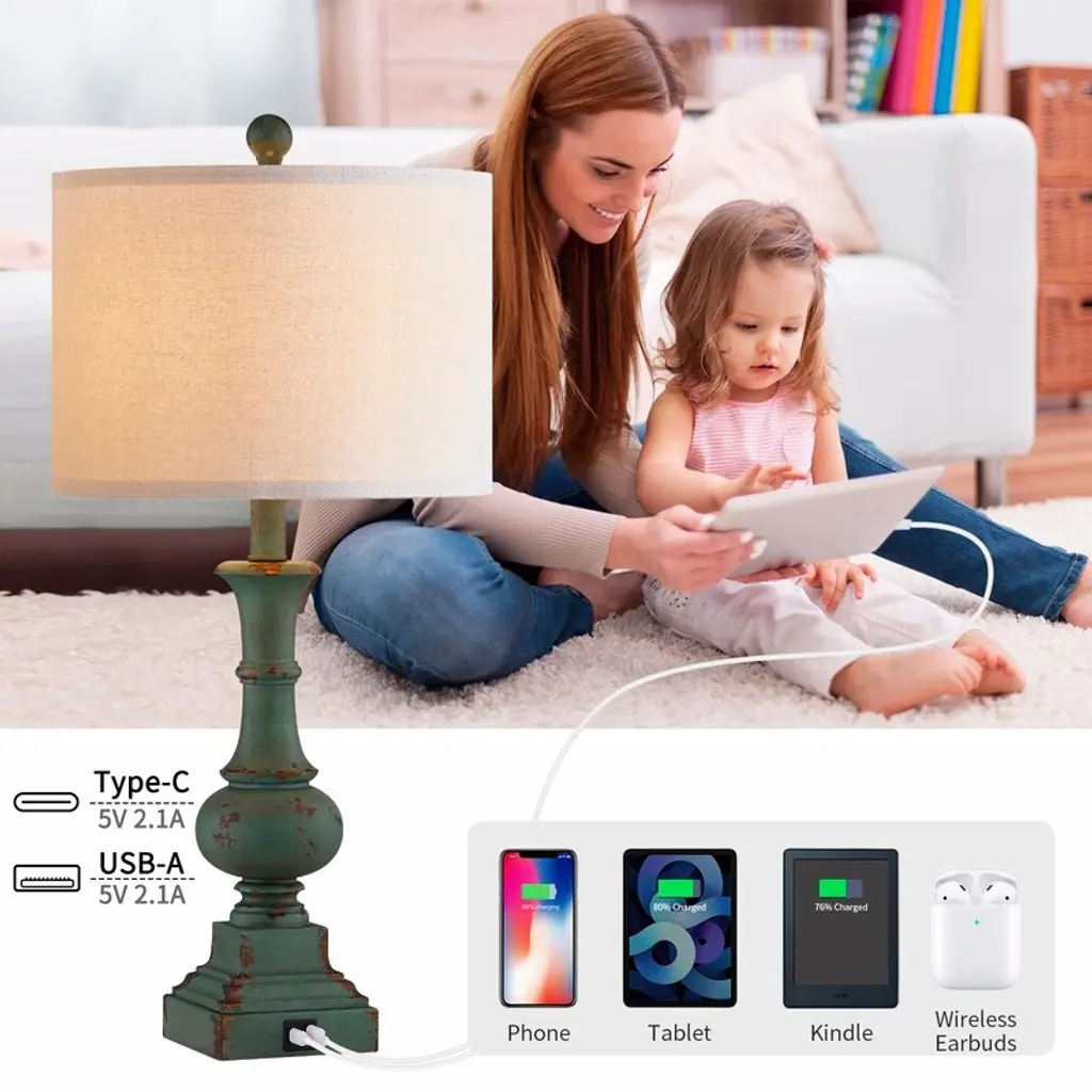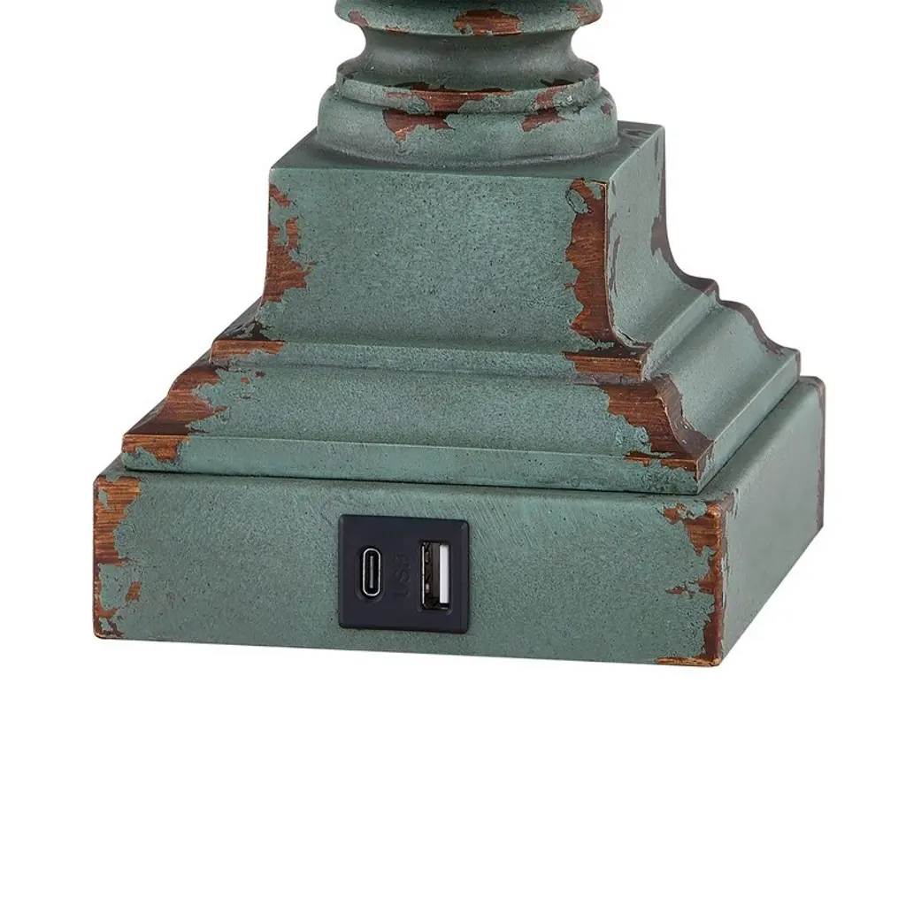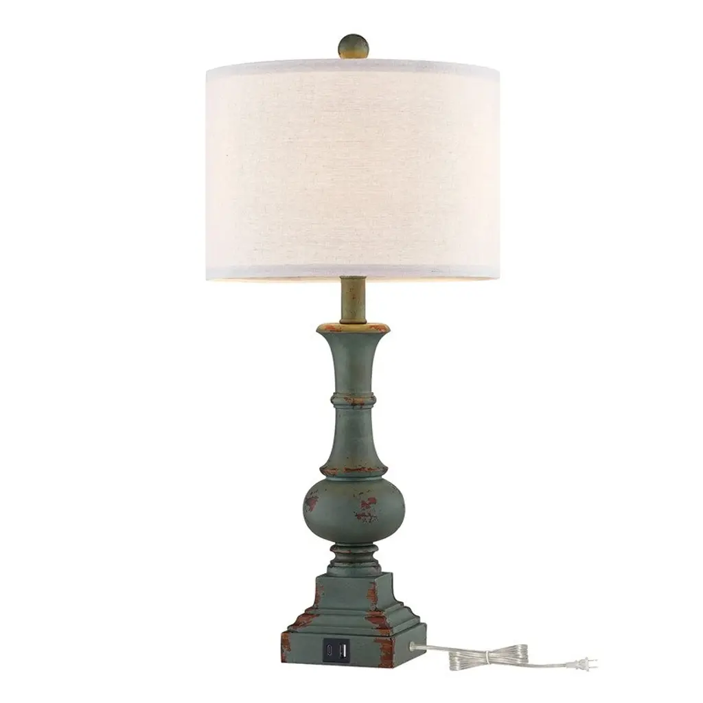 With a distressed dark green finish, this table lamp emanates a touch of farmhouse and antique spice. Featuring fabric drum shade, it will provide comfortable light for your bedside or reading nook. Plus, it features dual USB ports to charge multiple devices.Features:Dimension:Cleaning Note: