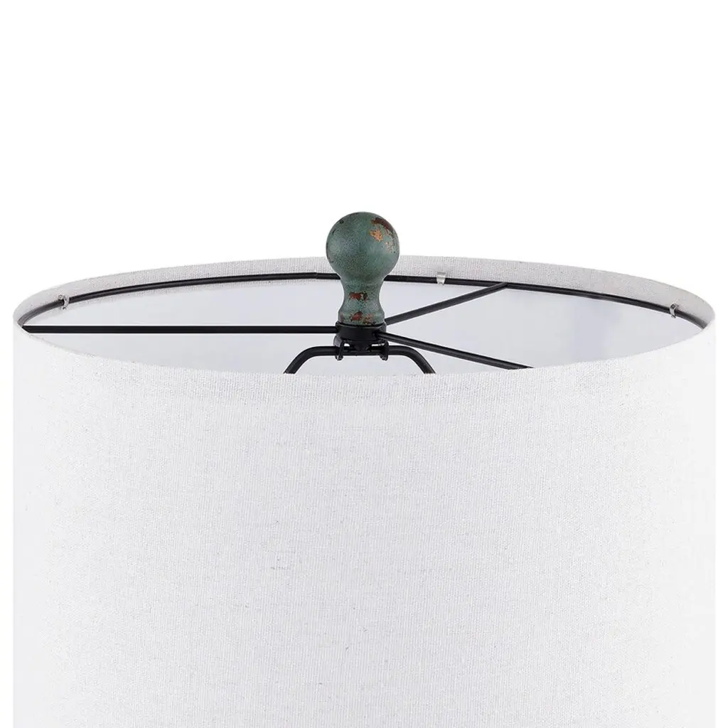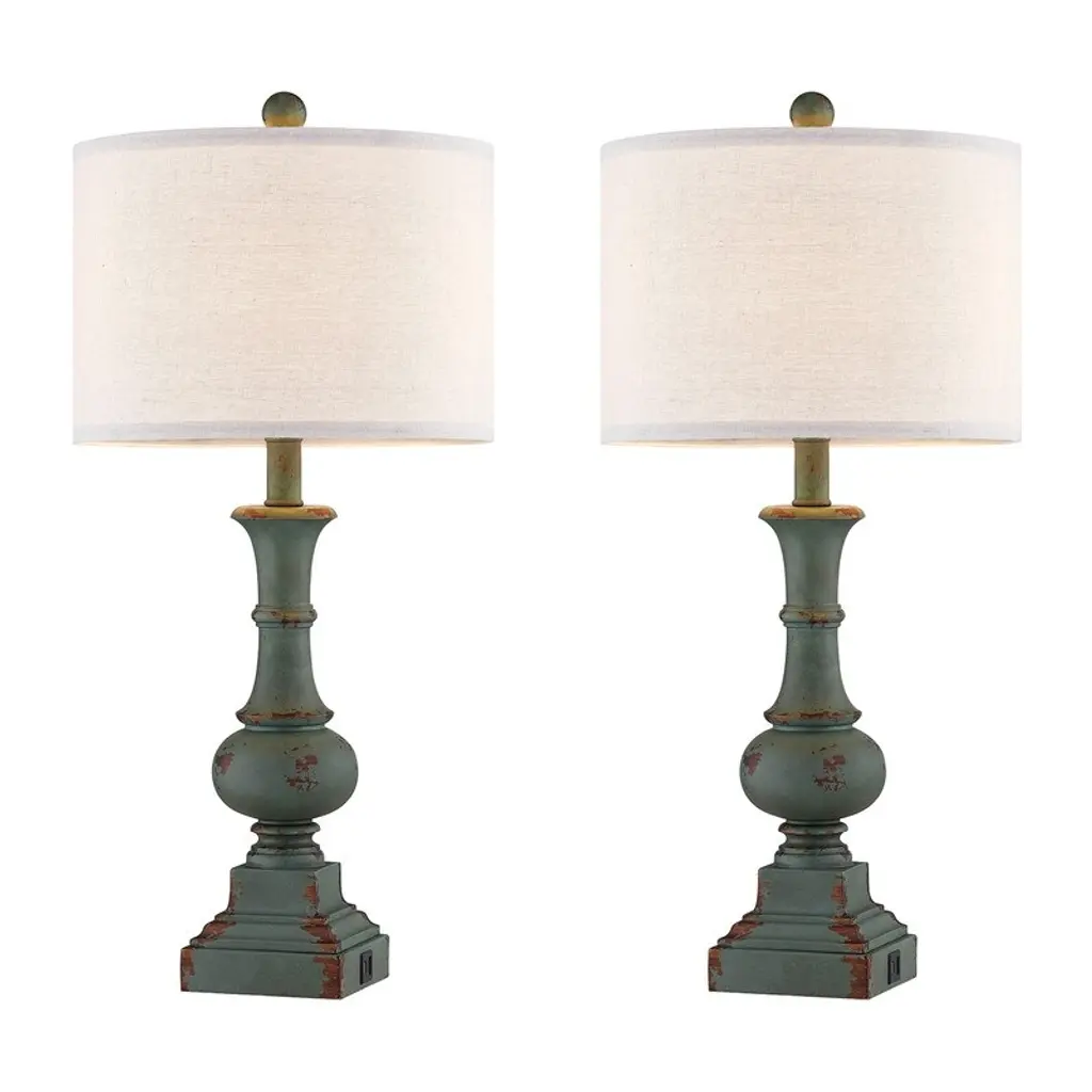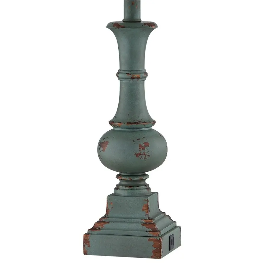 With a distressed dark green finish, this table lamp emanates a touch of farmhouse and antique spice. Featuring fabric drum shade, it will provide comfortable light for your bedside or reading nook. Plus, it features dual USB ports to charge multiple devices.Features:Dimension:Cleaning Note: