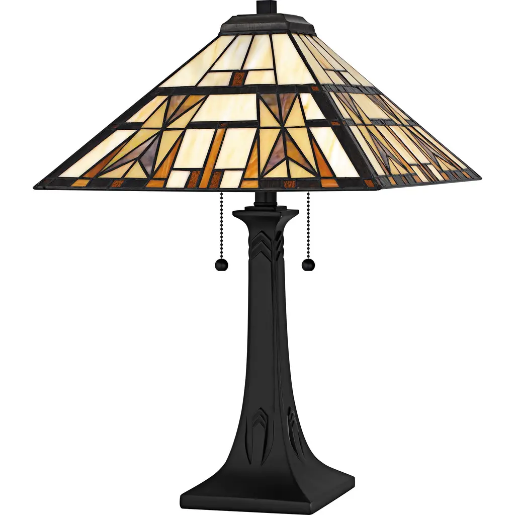 Add a touch of classic sophistication to your decor with the Kaylor table lamp. Featuring a matte black finish, this lamp effortlessly complements traditional interiors. The handcrafted Tiffany-style glass shade showcases intricate detailing and vibrant colors, creating a striking contrast against the sleek resin base. The combination of the rich glasswork and the matte black finish brings a timeless elegance to any room, making it perfect for enhancing your living room, bedroom, or study.