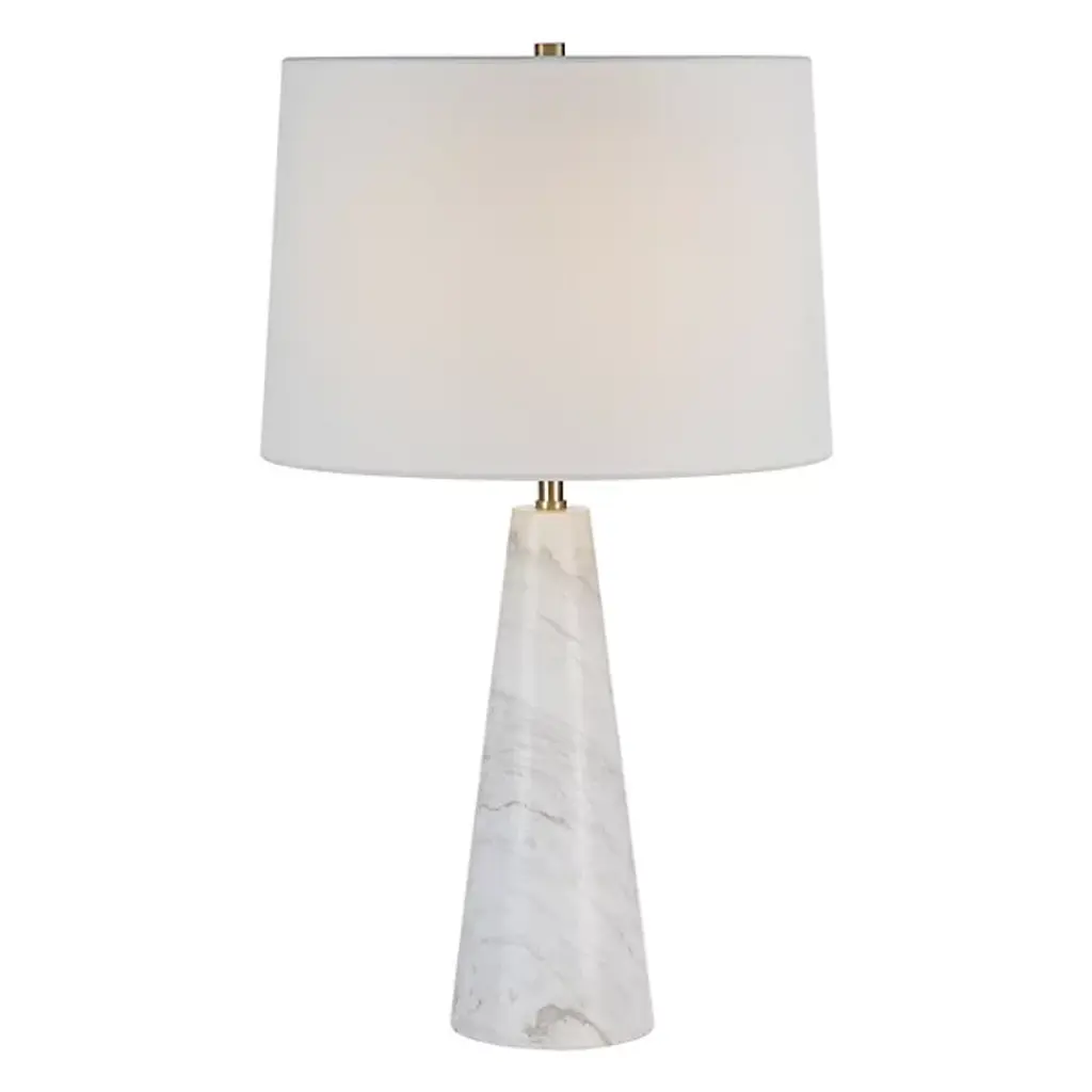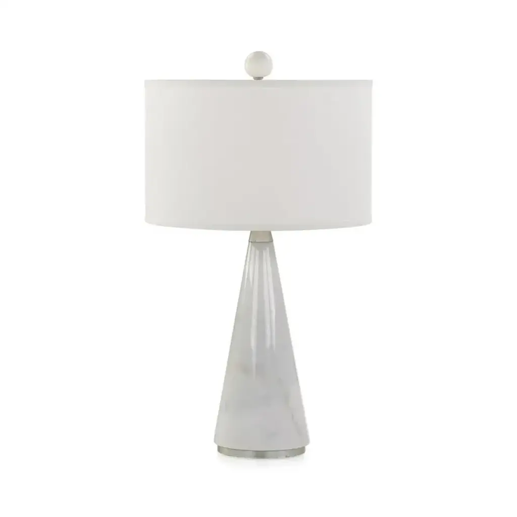 The Kegel Lamp combines simple, elegant shapes with stunning natural materials. Crafted from marble, the piece takes the shape of a tapered cone with accents of Antique Silver along the base and neck. Steel hardware in a Nickel finish and a ball shaped finial complete the look of this three-way table lamp.