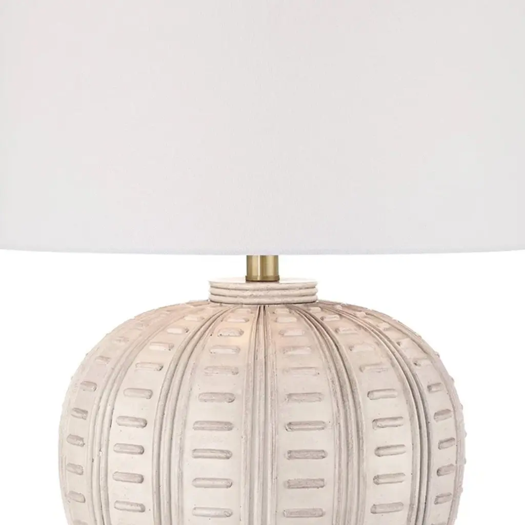 PRODUCT DETAILS: 24" high overall. Base is 6 1/2" wide. Drum shade is 16" wide across the top and bottom x 10" high. Weighs 8.7 lbs. Uses one maximum 150 watt standard-medium base 3-way light bulb (not included). 3-way socket switch. Casual style for coastal and modern room decor. Sand beige color lamp base with a decorative vertical and horizontal pattern. Cast resin construction. White fabric drum shade. 8-foot long cord.