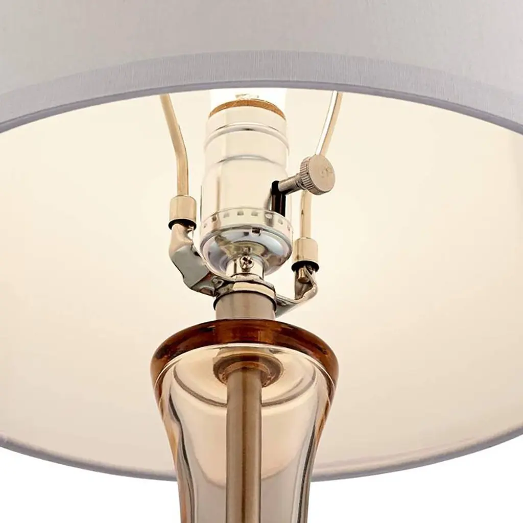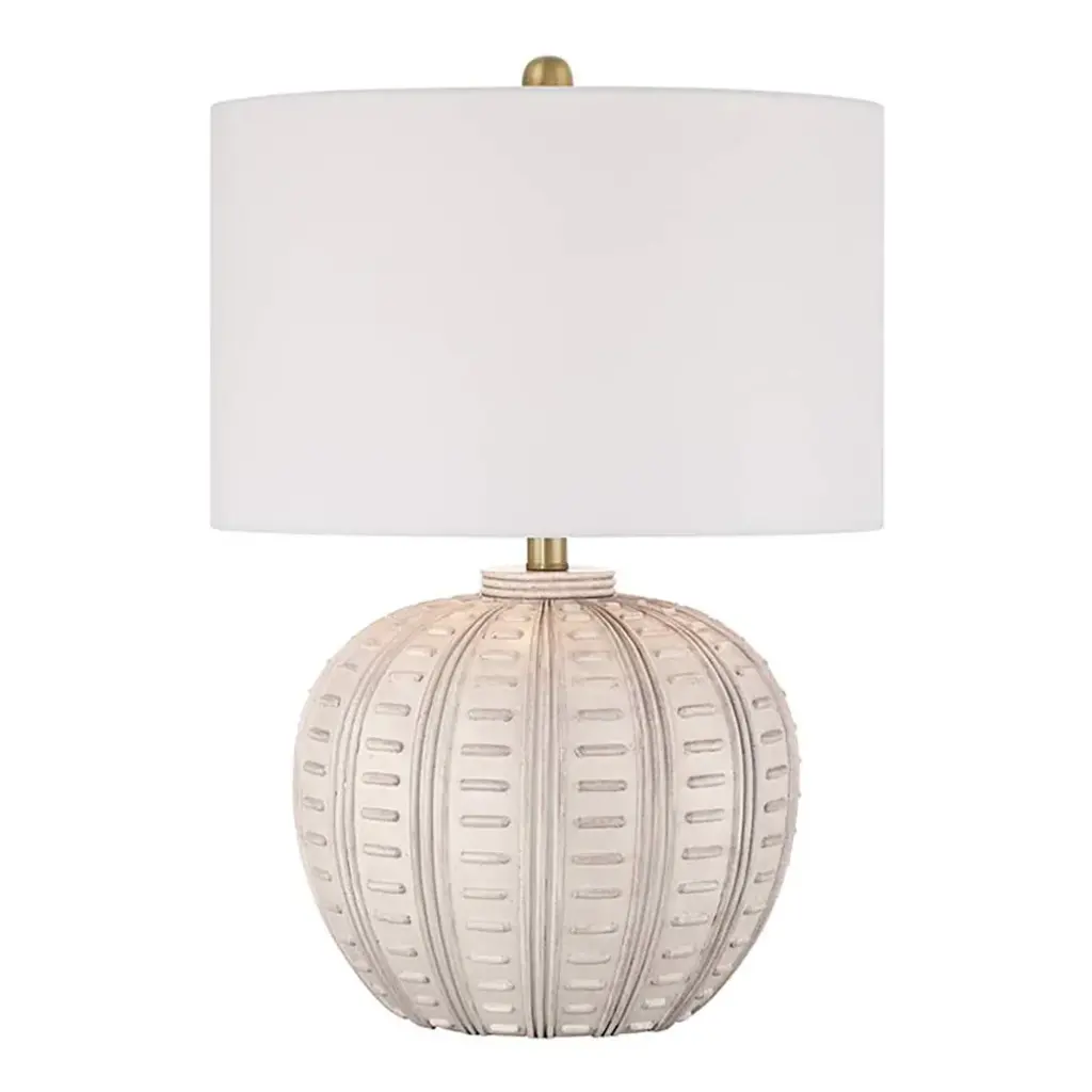 Product Details 24" high overall. Base is 6 1/2" wide. Drum shade is 16" wide across the top and bottom x 10" high. Weighs 8.7 lbs. Uses one maximum 150 watt standard-medium base 3-way light bulb (not included). 3-way socket switch. Casual style for coastal and modern room decor. Sand beige color lamp base with a decorative vertical and horizontal pattern. Cast resin construction. White fabric drum shade. 8-foot long cord.