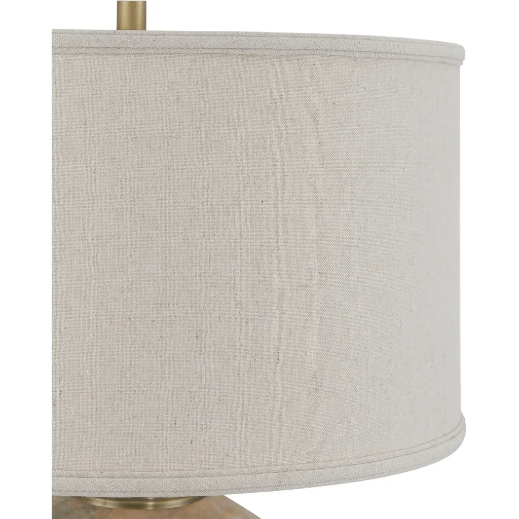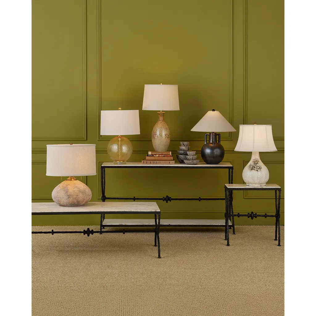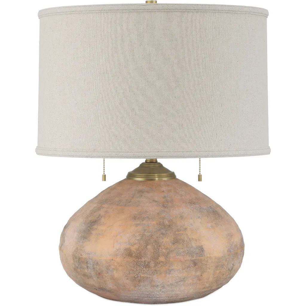 The Kenmare Table Lamp features an earthen-toned terracotta body finished with a textured antique brown glaze that enhances its ribbed surface and gives it the appearance of a timeworn artifact. The aged look is balanced by a tailored shade, detailed with a double layer of self-trim along the top and bottom edges. The metal hardware, finial, and dual pull-chains in an antique brass finish complete the design.
