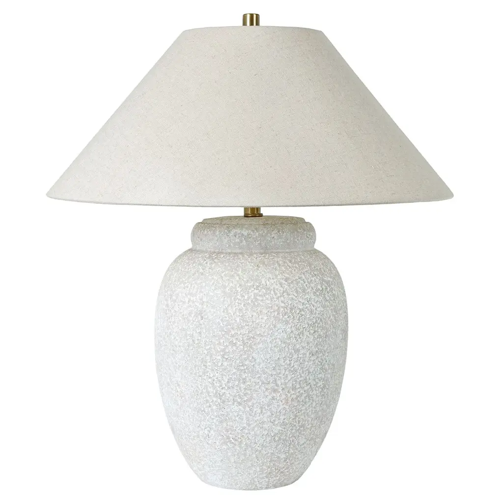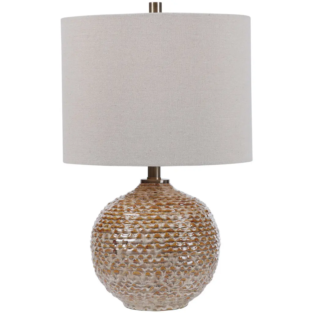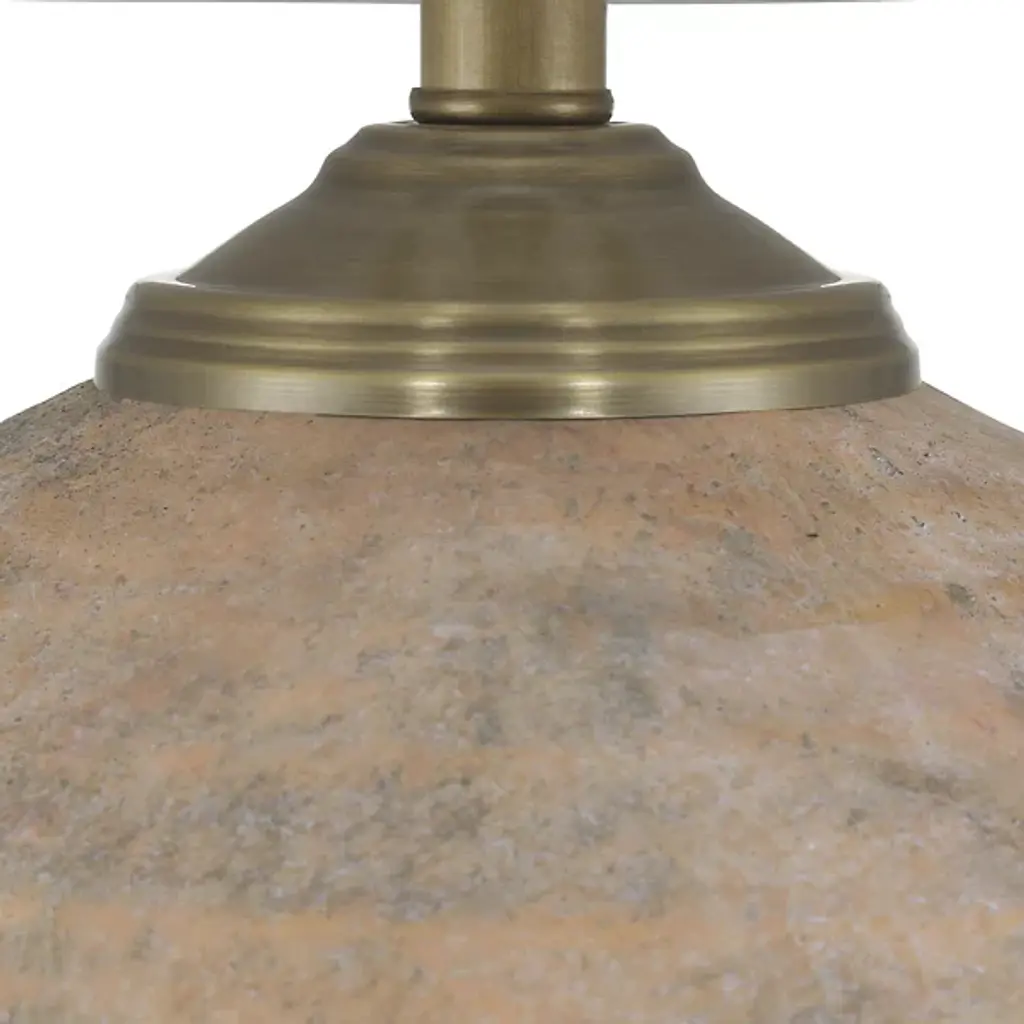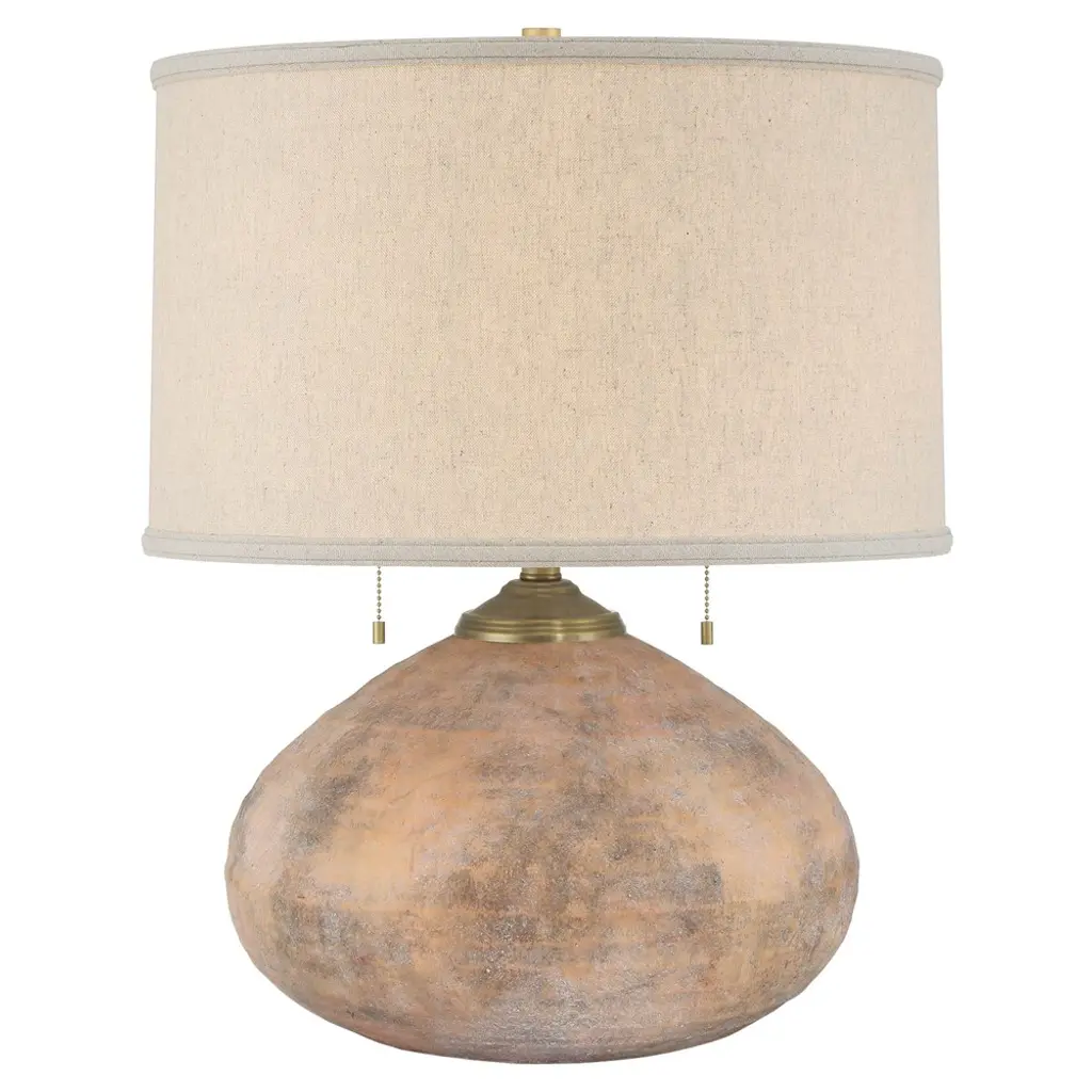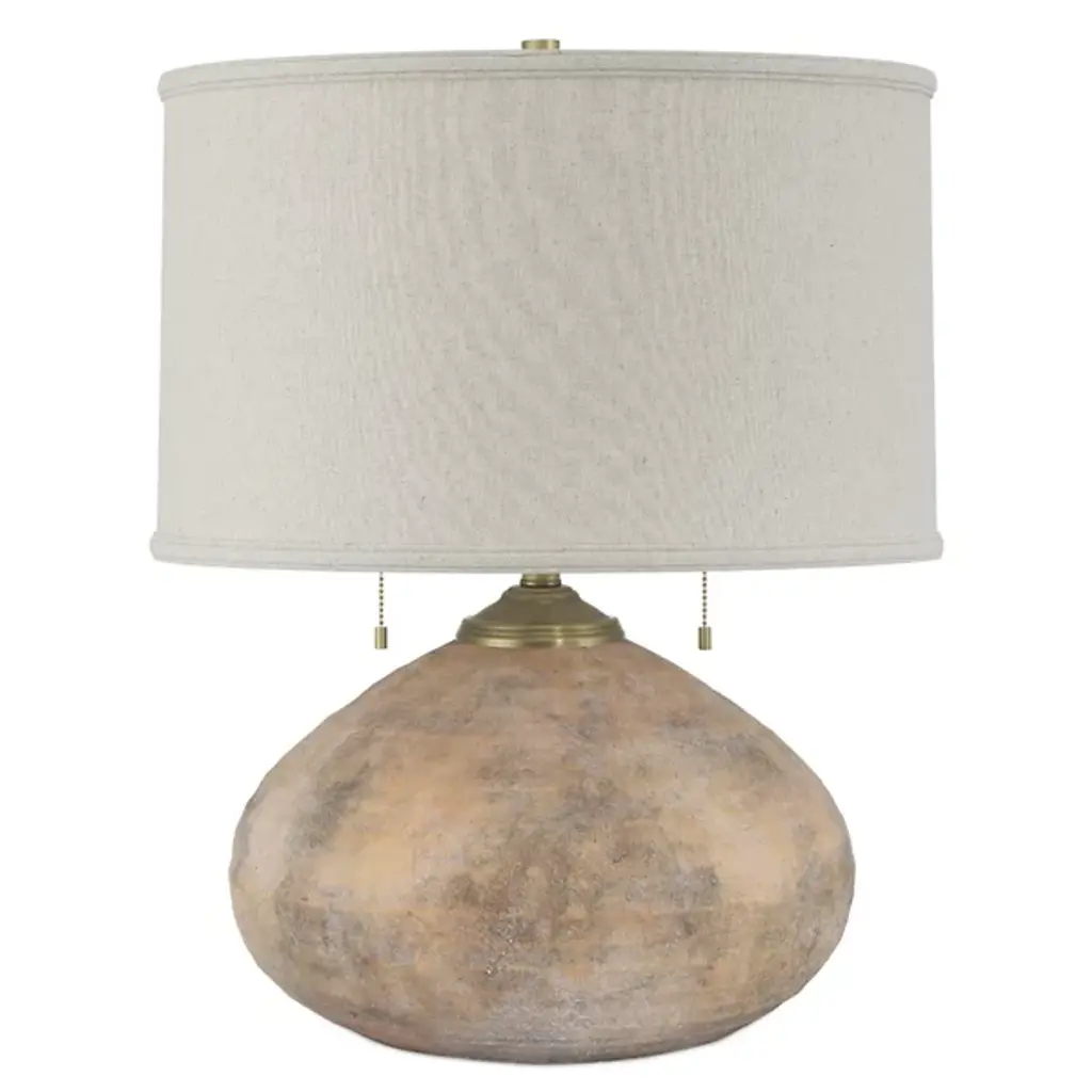 The Kenmare Table Lamp from Currey & Company features a terracotta body with ribbed surface texture that enhances its earthen character. The textured glaze gives the lamp the appearance of a discovered artifact while maintaining contemporary functionality. A tailored shade with double-layer self-trim along the edges provides contrast to the rustic base. Dual pull-chains offer convenient lighting control for various tasks and moods. This desk lamp works effectively in living rooms, bedrooms, or studies where its combination of ancient-inspired form and modern practicality creates reliable illumination for reading or ambient lighting needs.