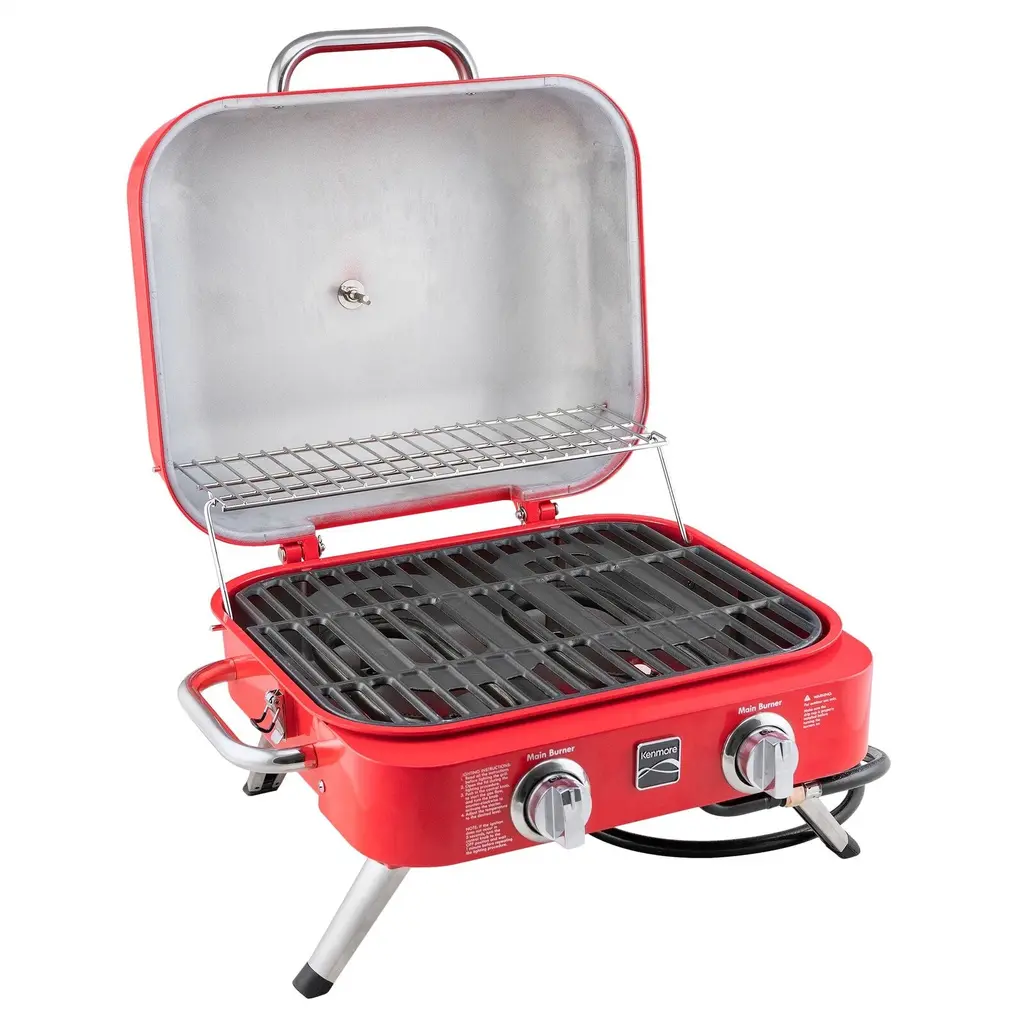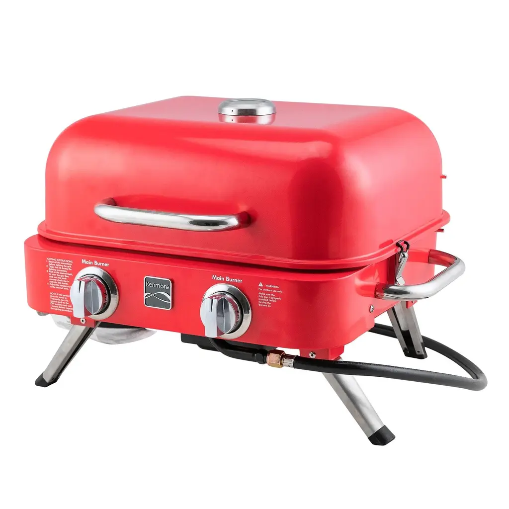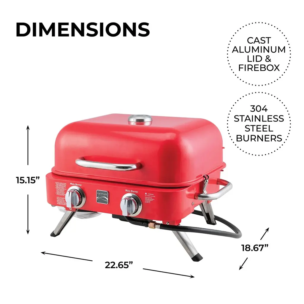 Elevate your outdoor cooking experience with the new Kenmore 2-Burner Retro Portable Gas Grill. This two-burner small propane gas grill is designed for on-the-go grilling excellence, boasting a generous 262 square inches of barbeque grilling surface—perfect for sizzling up to 9 burgers at once. With its sleek retro design and tabletop versatility, this small compact BBQ grill not only delivers style but also functionality.Equipped with electronic ignition and a warming rack, the Kenmore 2-Burner portable grill offers a total of 14,000 BTUs of cooking power. Its compact size and side handles make it an ideal companion for camping, glamping, tailgating, outdoor adventures, parks, picnics, and BBQs on the go. Whether you're embarking on family escapades or celebrating outdoor events, this portable outdoor gas grill ensures a memorable and flavorful experience.Experience the convenience of quick and efficient barbecue grilling wherever your journey takes you. Invest in the Kenmore 2-Burner Retro Portable Gas Grill for a perfect blend of style, portability, and impressive outdoor cooking capabilities.