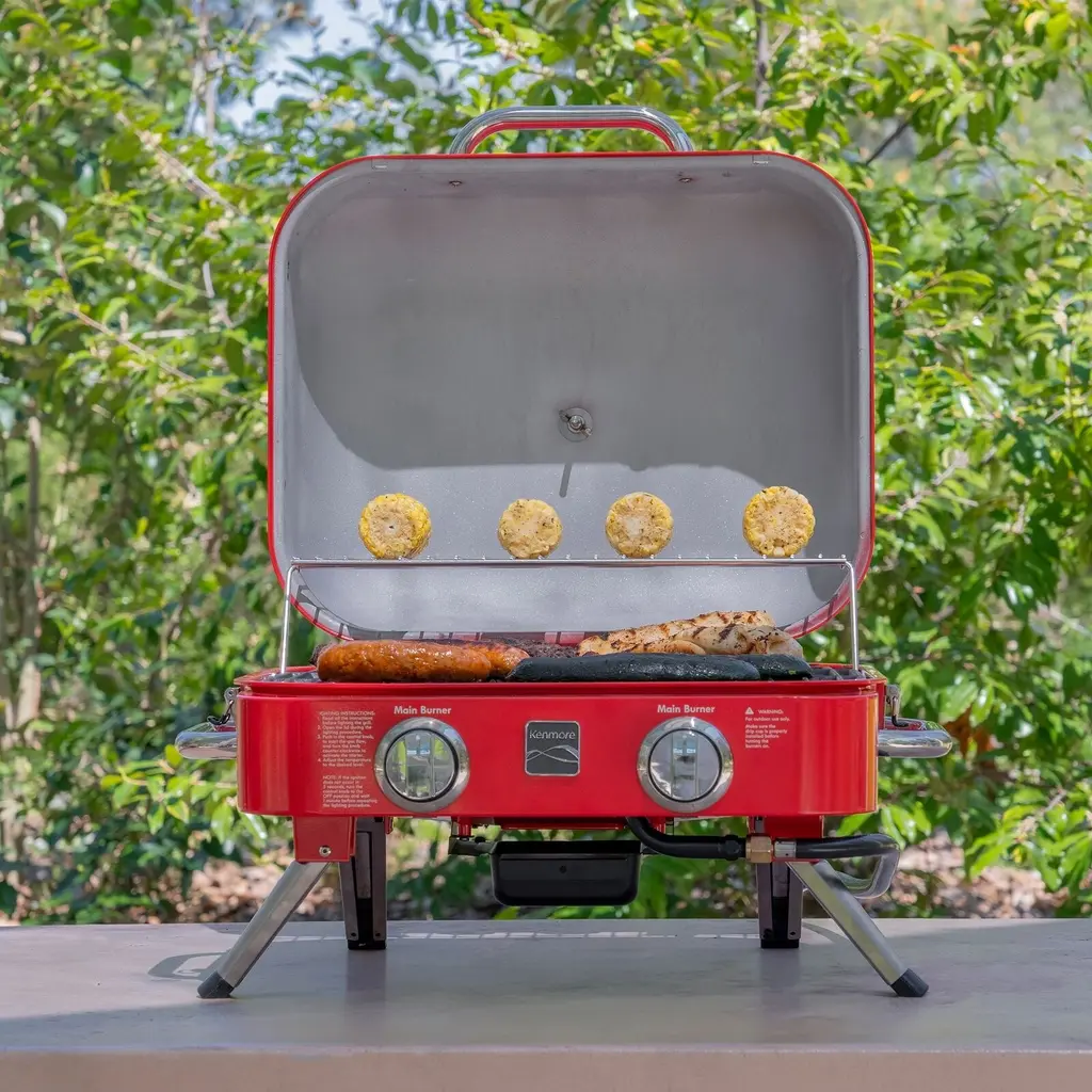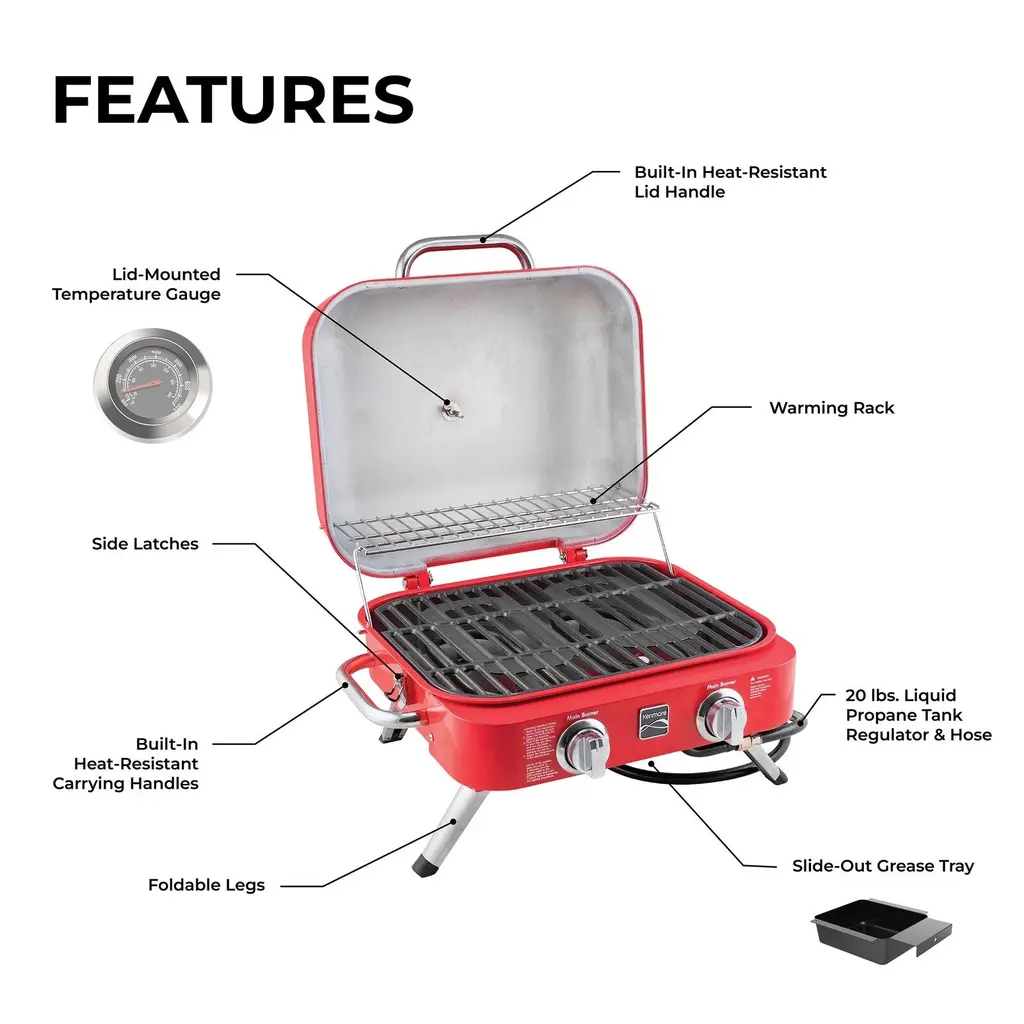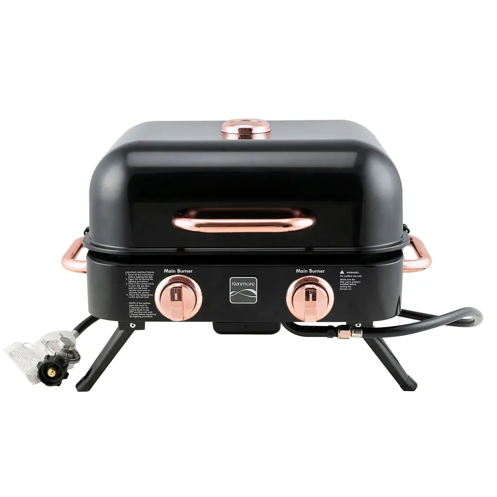 Elevate your outdoor cooking experience with the new Kenmore 2-Burner Retro Portable Gas Grill. This two-burner small propane gas grill is designed for on-the-go grilling excellence, boasting a generous 262 square inches of barbeque grilling surface—perfect for sizzling up to 9 burgers at once. With its sleek retro design and tabletop versatility, this small compact BBQ grill not only delivers style but also functionality.Equipped with electronic ignition and a warming rack, the Kenmore 2-Burner portable grill offers a total of 14,000 BTUs of cooking power. Its compact size and side handles make it an ideal companion for camping, glamping, tailgating, outdoor adventures, parks, picnics, and BBQs on the go. Whether you're embarking on family escapades or celebrating outdoor events, this portable outdoor gas grill ensures a memorable and flavorful experience.Experience the convenience of quick and efficient barbecue grilling wherever your journey takes you. Invest in the Kenmore 2-Burner Retro Portable Gas Grill for a perfect blend of style, portability, and impressive outdoor cooking capabilities.