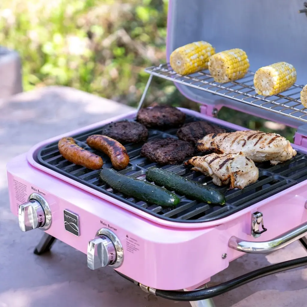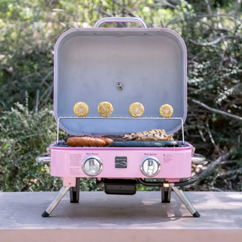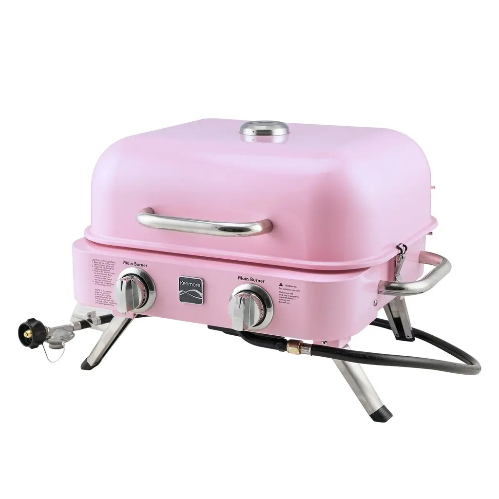 Elevate your outdoor cooking experience with the new Kenmore 2-Burner Retro Portable Gas Grill. This two-burner small propane gas grill is designed for on-the-go grilling excellence, boasting a generous 262 square inches of barbeque grilling surface—perfect for sizzling up to 9 burgers at once. With its sleek retro design and tabletop versatility, this small compact BBQ grill not only delivers style but also functionality.Equipped with electronic ignition and a warming rack, the Kenmore 2-Burner portable grill offers a total of 14,000 BTUs of cooking power. Its compact size and side handles make it an ideal companion for camping, glamping, tailgating, outdoor adventures, parks, picnics, and BBQs on the go. Whether you're embarking on family escapades or celebrating outdoor events, this portable outdoor gas grill ensures a memorable and flavorful experience.Experience the convenience of quick and efficient barbecue grilling wherever your journey takes you. Invest in the Kenmore 2-Burner Retro Portable Gas Grill for a perfect blend of style, portability, and impressive outdoor cooking capabilities.