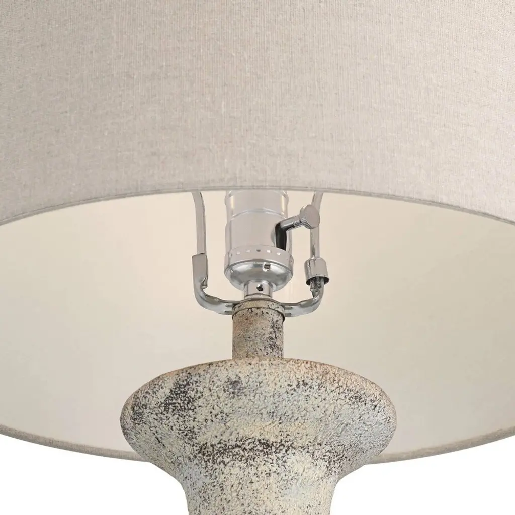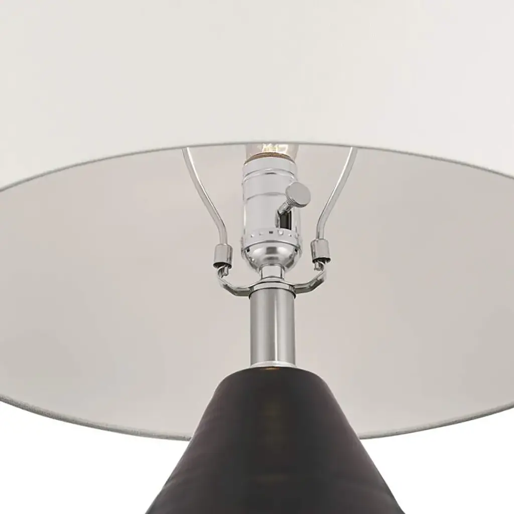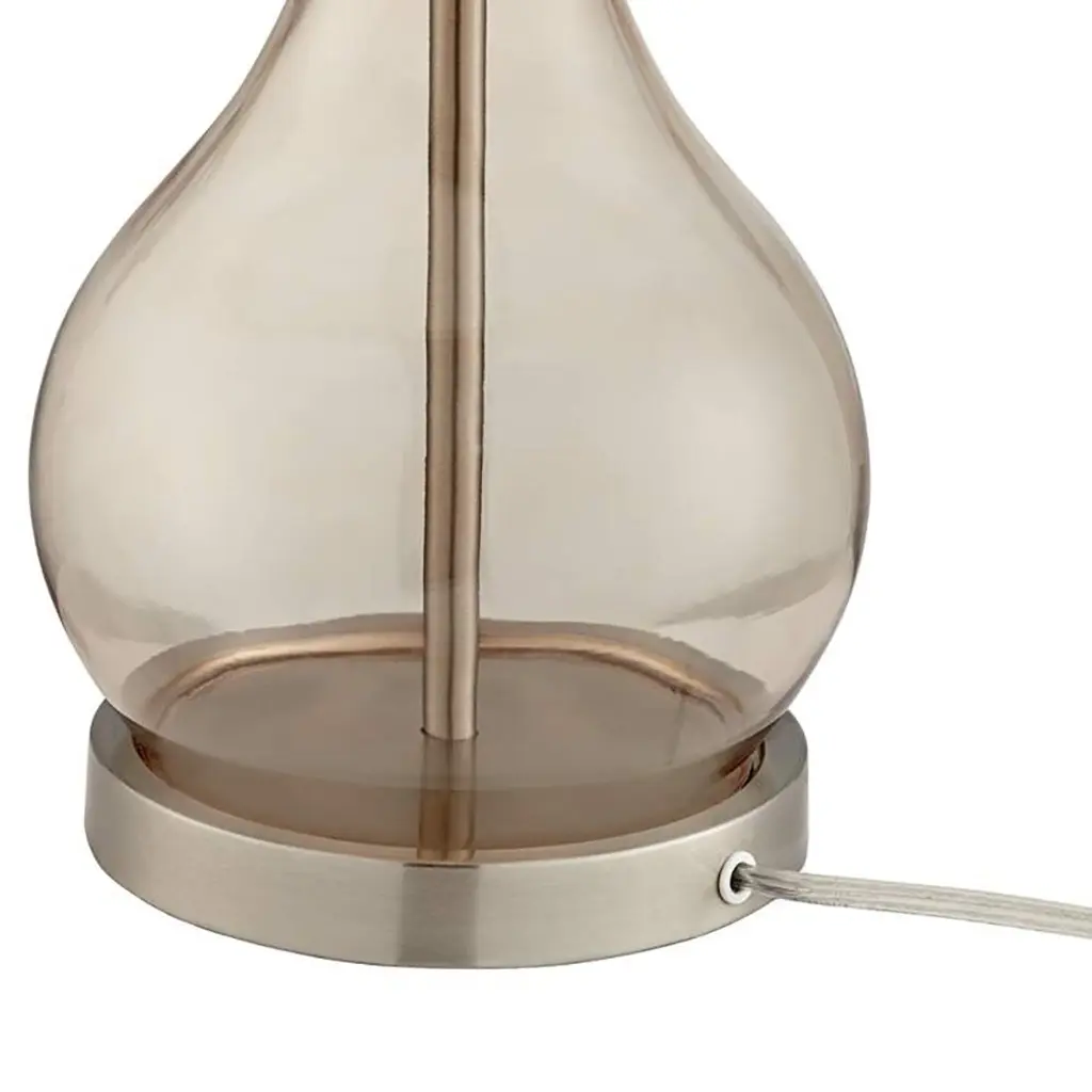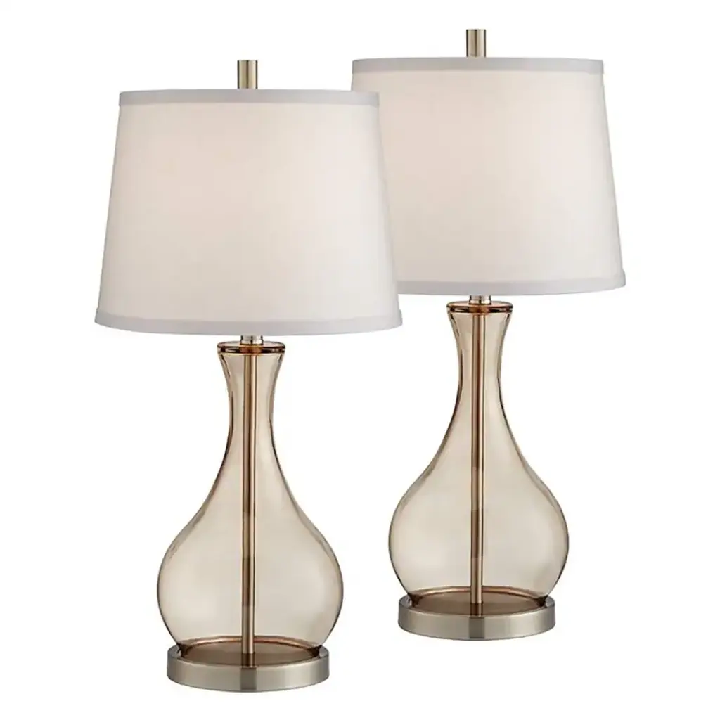 Product Details Set of 2 glass lamps. Each is 24 1/2" high overall. Shades are 10" across the top x 12" across the bottom x 12" high. Each lamp uses one maximum 100 watt standard-medium base light bulb (not included). On-off socket switches. Kent glass table lamps set. Contemporary style Translucent champagne tinted glass bases with a gourd profile. Silver finish accents. Glass and metal construction. Cotton-linen blend fabric lamp shades. 8-foot long cords. The Kent table lamps set is the easy way to add lighting to bedside tables or living room areas. Each lamp has a gourd profile and comes in a champagne tinted glass body with silver finish metal accents. White cotton-linen shades on top have a contemporary tapered profile.
