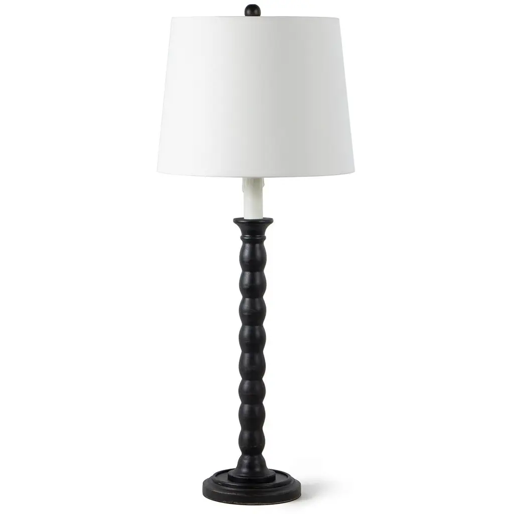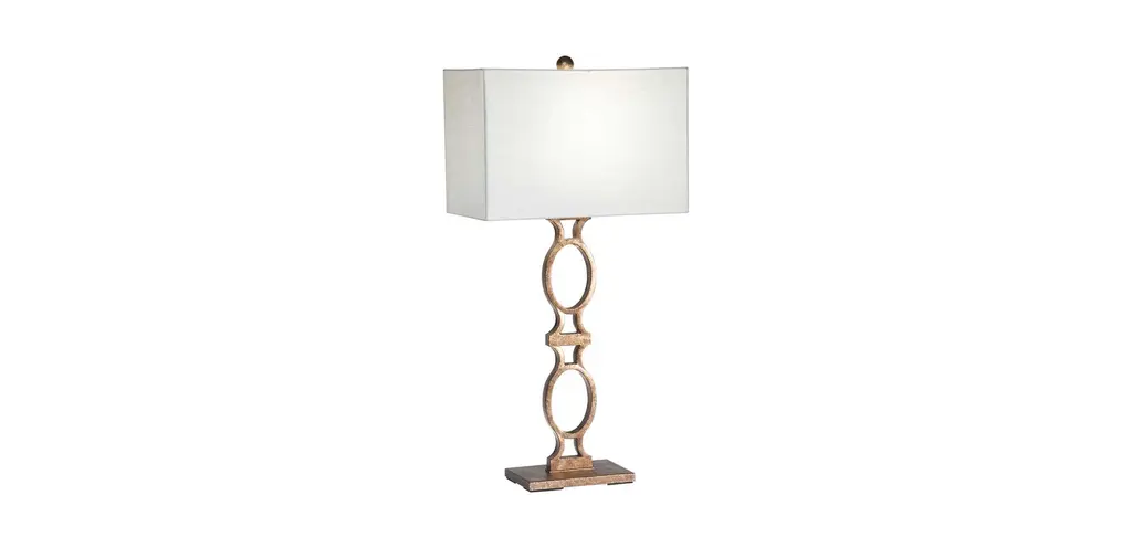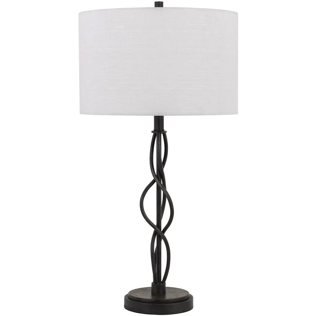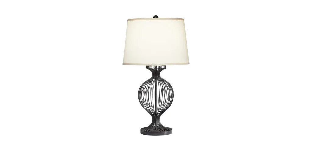 Black ironwork curved in a finial shape, reminiscent of antique bird cages, gives the Kenzie lamp its light, open feel. Topped with a welted, natural-linen shade, the lamp has the timeless appearance of a treasured flea market find.