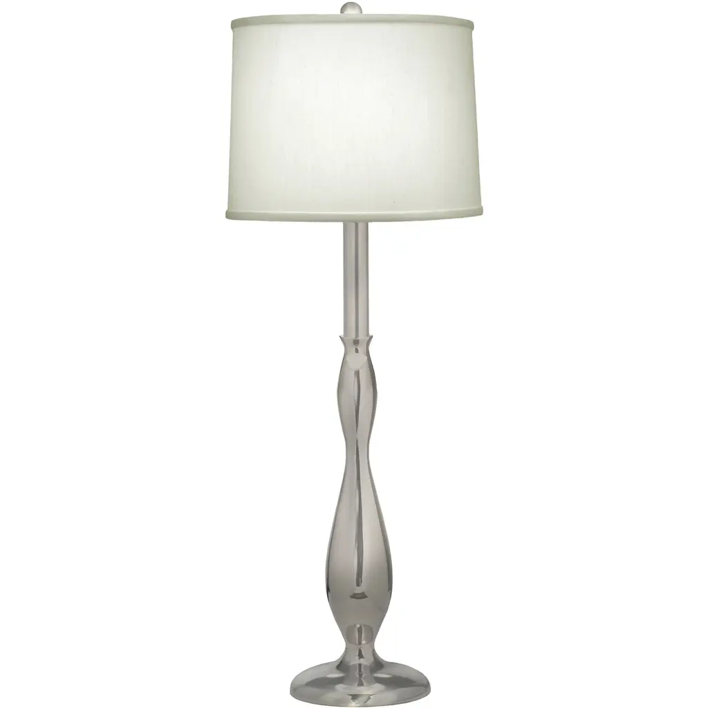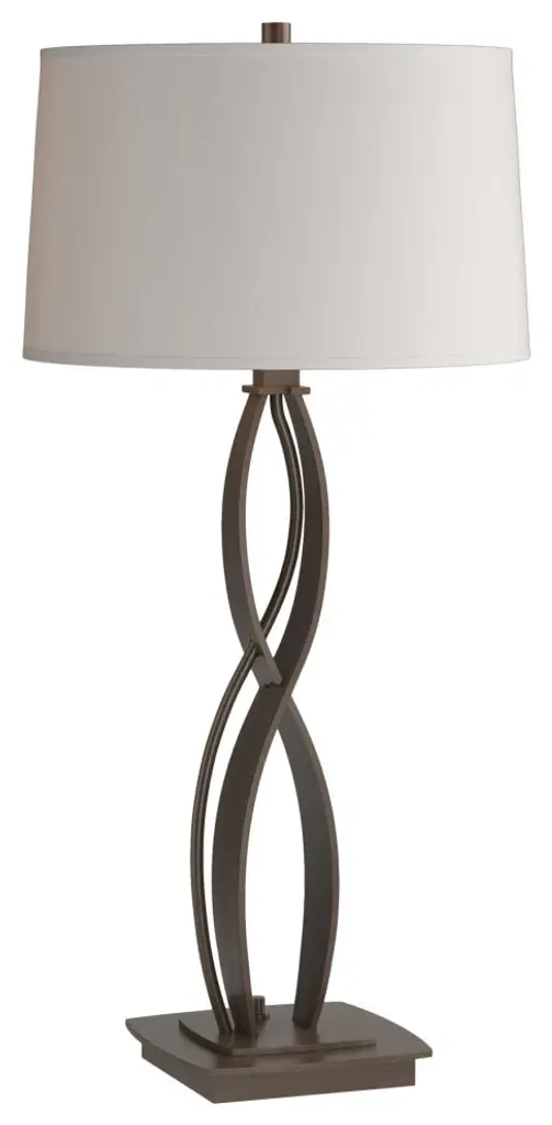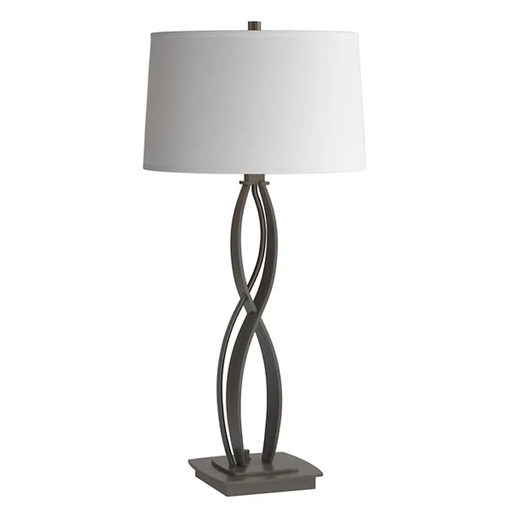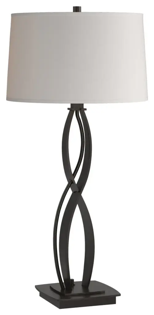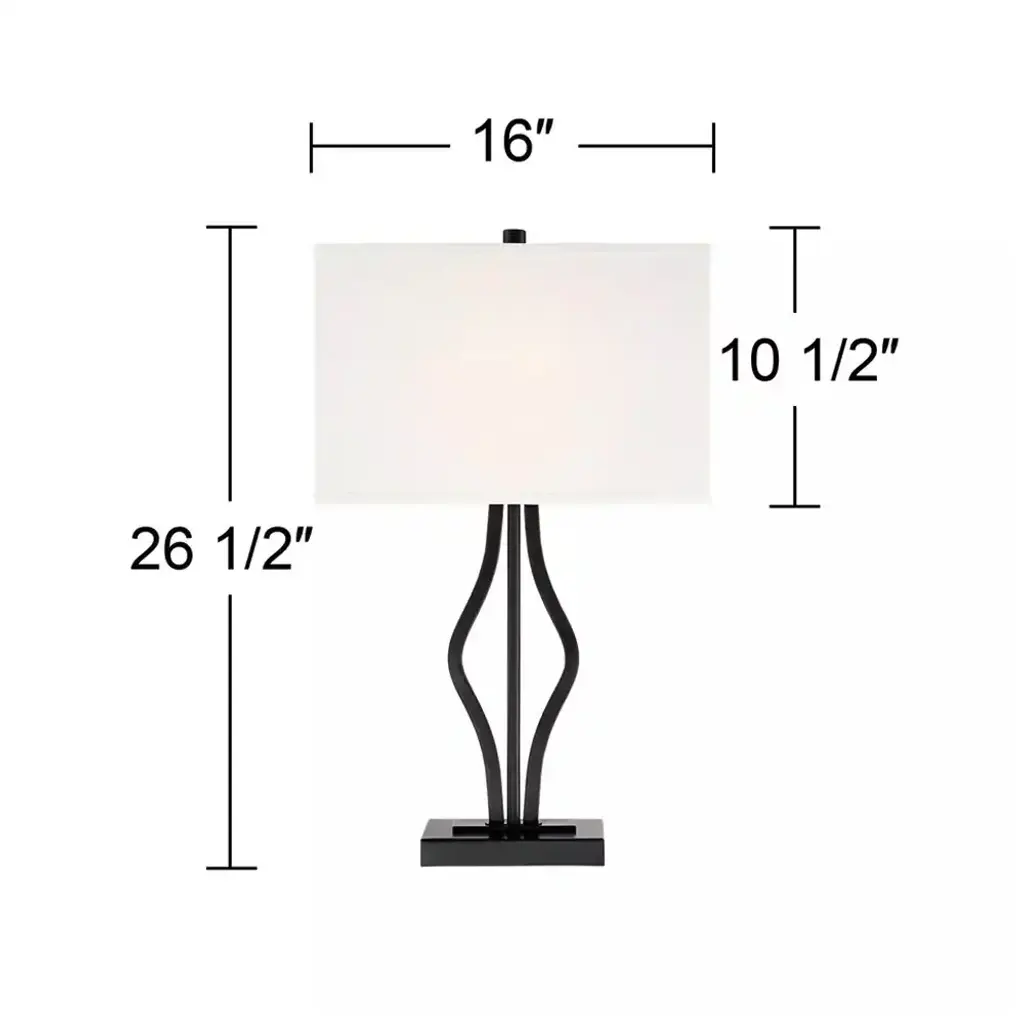 Black ironwork curved in a finial shape, reminiscent of antique bird cages, gives the Kenzie lamp its light, open feel. Topped with a welted, natural-linen shade, the lamp has the timeless appearance of a treasured flea market find.