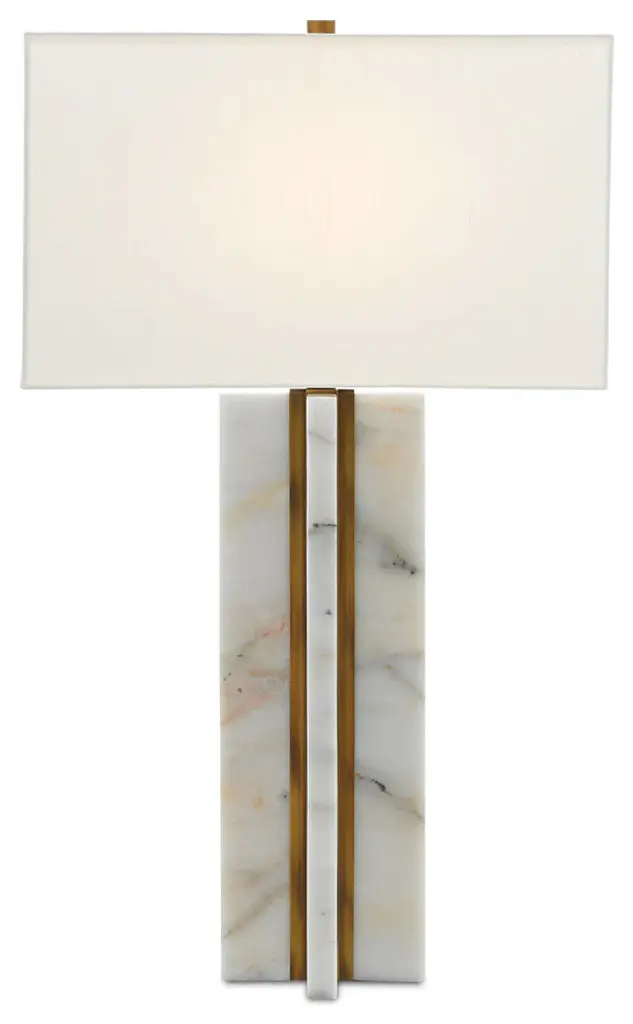 Slabs of marble intersected by metal in an antique brass finish have never looked so modern as they do in the Khalil table lamp. The tones in the patinated metal bring out the salmon-colored tones in the stone to make this piece feel warmly modern. The heft of the off-white shantung shade with its clean-lined rectangular shape adds to the smartness of this lamp, which stands 32" tall. This is one of our creations that spans many stylistic notes, from mid-century modern to contemporary.Fixture Type: PortableNumber of Lights: 1 LightBulb Type: A Standard BulbMaximum Watts per Item: 150Maximum Watts per Socket: 150Socket Type: Standard Base E26Voltage: 120vSwitch Type: Turn KnobWire Color: SilverCord Length: 8''Harp Finish: BrassHarp Size: 9Shade Detail: Off White ShantungShade Height: 11.5"HShade Top Diameter: 19/12Shade Bottom Diameter: 19/12"Neck Height: 2"Body Diameter: 7Body Height: 20.25"