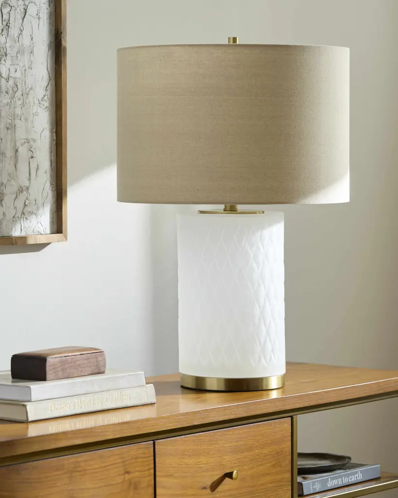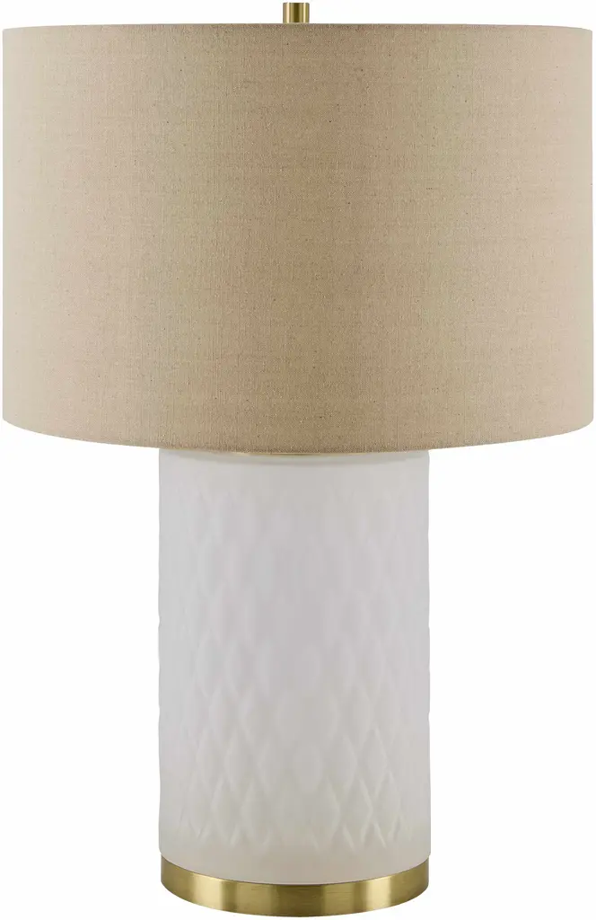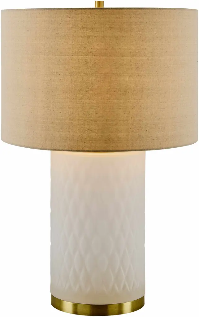 Collection: Khelyulya Colors: Light Gray, Metallic - Brass, Beige, White, Translucent Material: Body: Glass / Base: Iron / Shade (Outside): Linen / Finial: Iron Styles: Traditional Made In: China Lighting Type: Accent Table Lighting Base: Iron Base Color: Metallic - Brass Shade Material: Linen Shade Color: White, Beige Cord Length: 6' Switch Type: Rotary Number of Bulbs: 1 Socket Type: E-26 Bulb Wattage: 100W