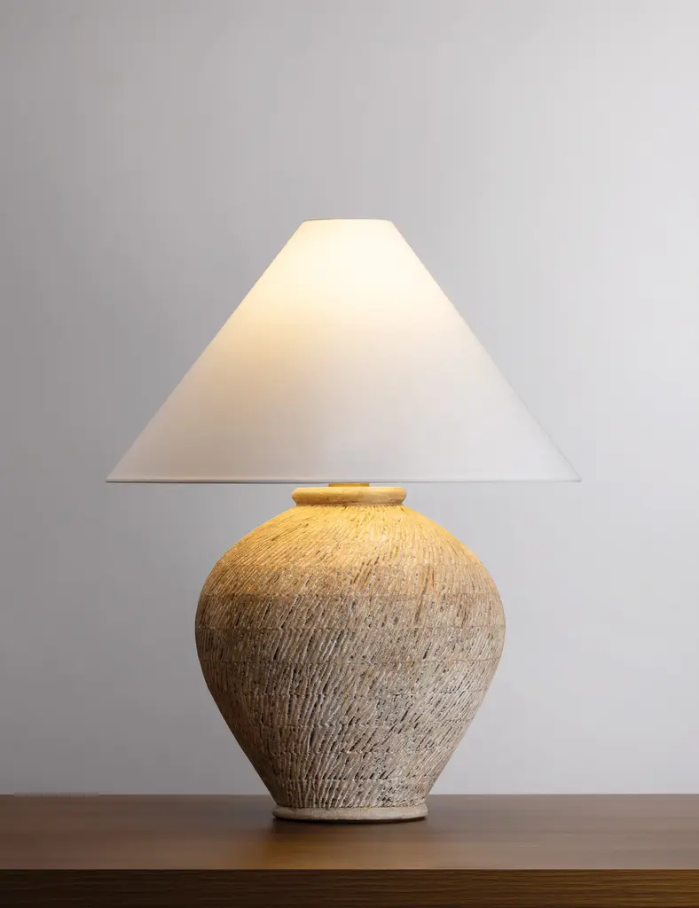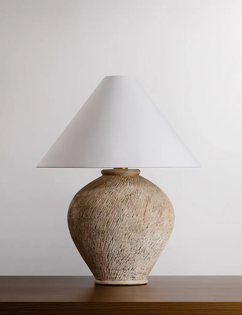 The Kienan lamp brings fresh appeal to a timeless look. The etched design catches the light, offering a subtle dose of texture. The earthy tones of the ceramic base bring organic warmth to modern and transitional edits alike.