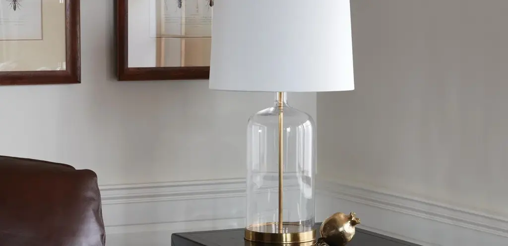 Kiera is a clean, clear classic with a mouth-blown glass body, a pure brass wiring rod and base, an ivory linen shade, and your choice of a brass or nickel-plated finish.