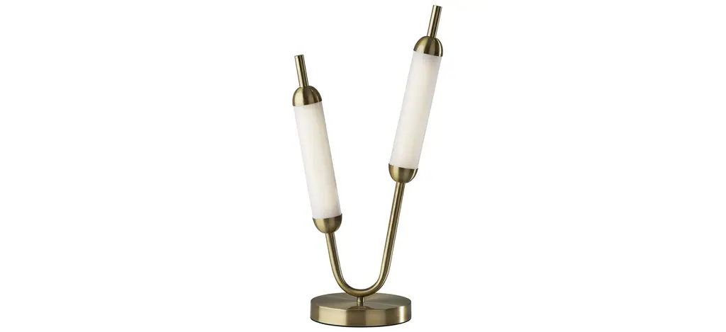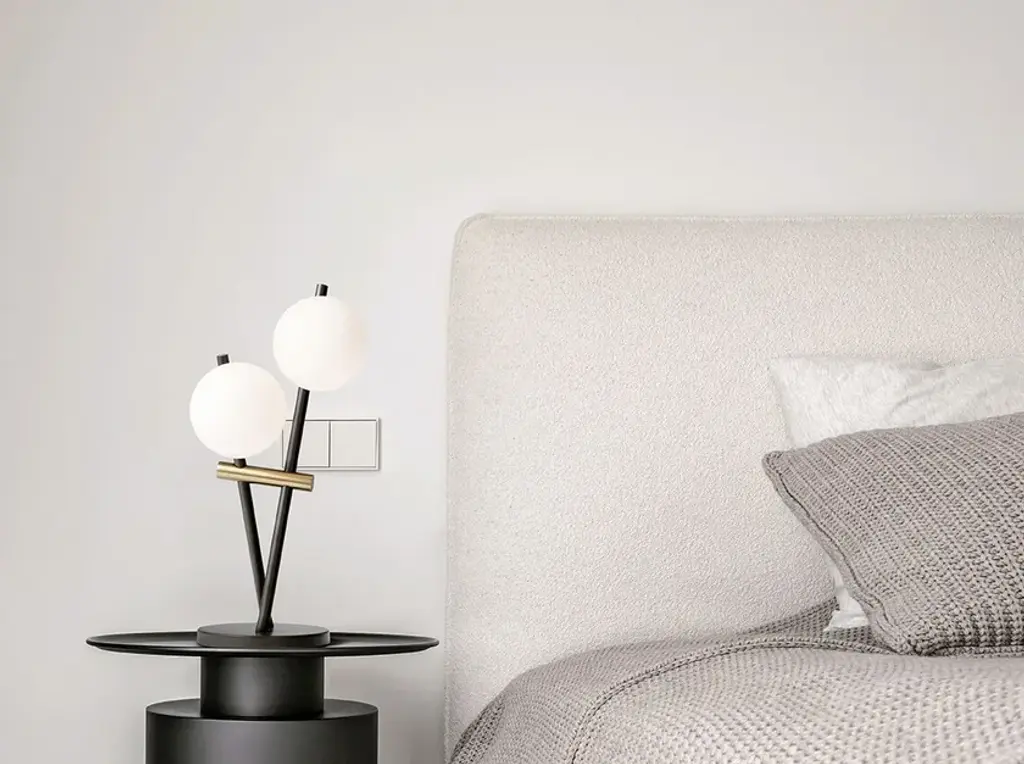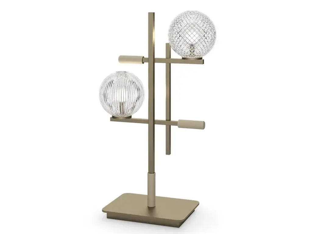 Metal table lamp from the KIKA collection, in Liquorice Black with Brushed Gold detail. Milk-white blown glass. Lamp equipped with Dimmer.Light source: G9 LED, Power: 2 x max. 10W - DIMMThe balance of randomness. In the KIKA collection, the random positioning of the opaline glass spheres on the thin liquorice rods is designed to find harmony in the chaos and thus give balance to the composition, while also enlarging the illuminated space. The thick central rod in brushed gold lends preciousness and connects all the elements, acting as a spokesperson for the connection between different natures.