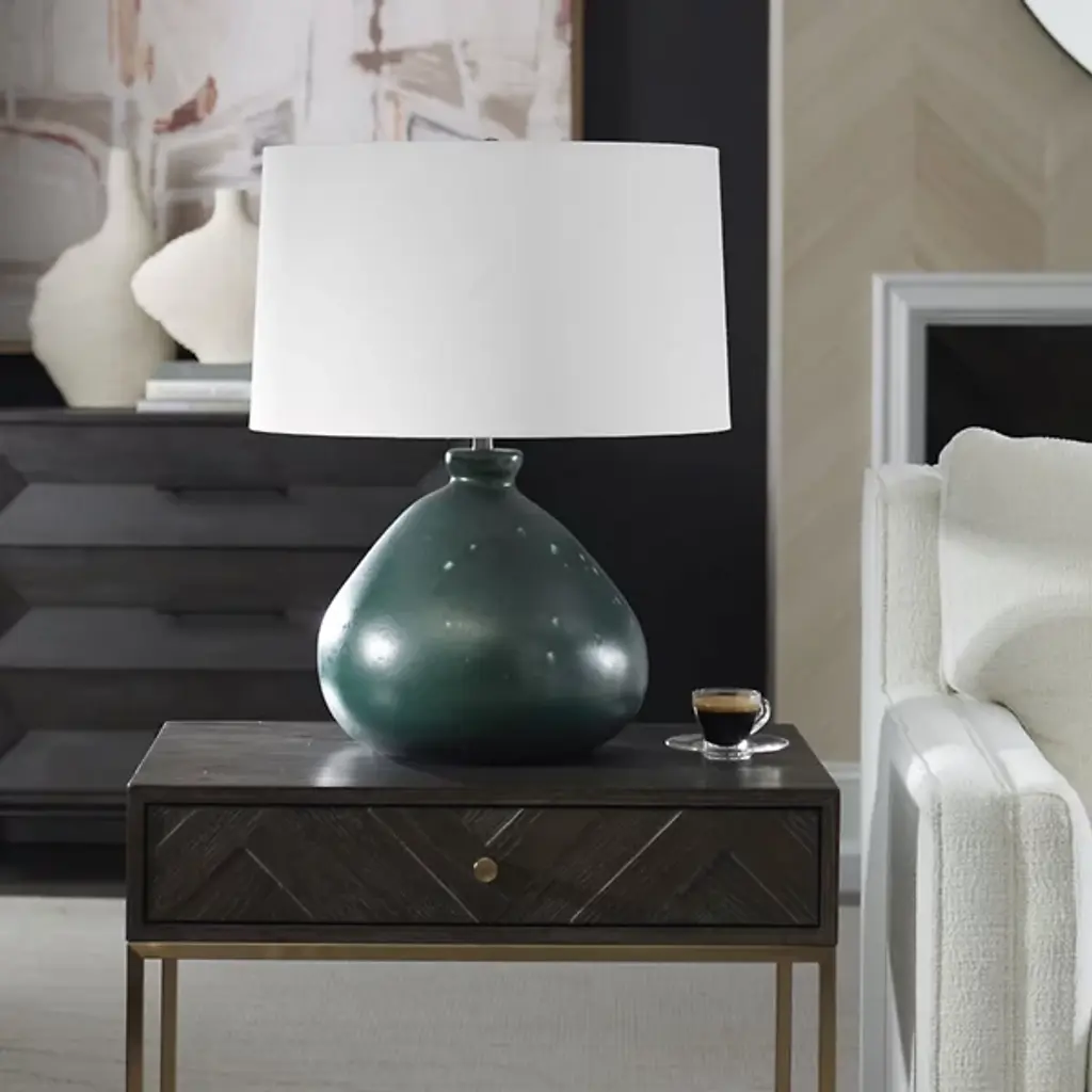 The Killarney Table Lamp from Uttermost showcases an organic-shaped ceramic base with layered glazes. Designed by Grace Feyock, this piece features subtle undertones that peek through the primary finish, giving it depth and character. Its round linen shade softens the light, providing gentle illumination that enhances the lamp's handcrafted appeal. This lamp brings natural inspiration to living spaces, reading nooks, or bedrooms, offering a balance of artistic expression and practical lighting that works in various settings.