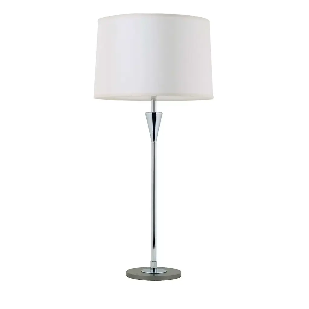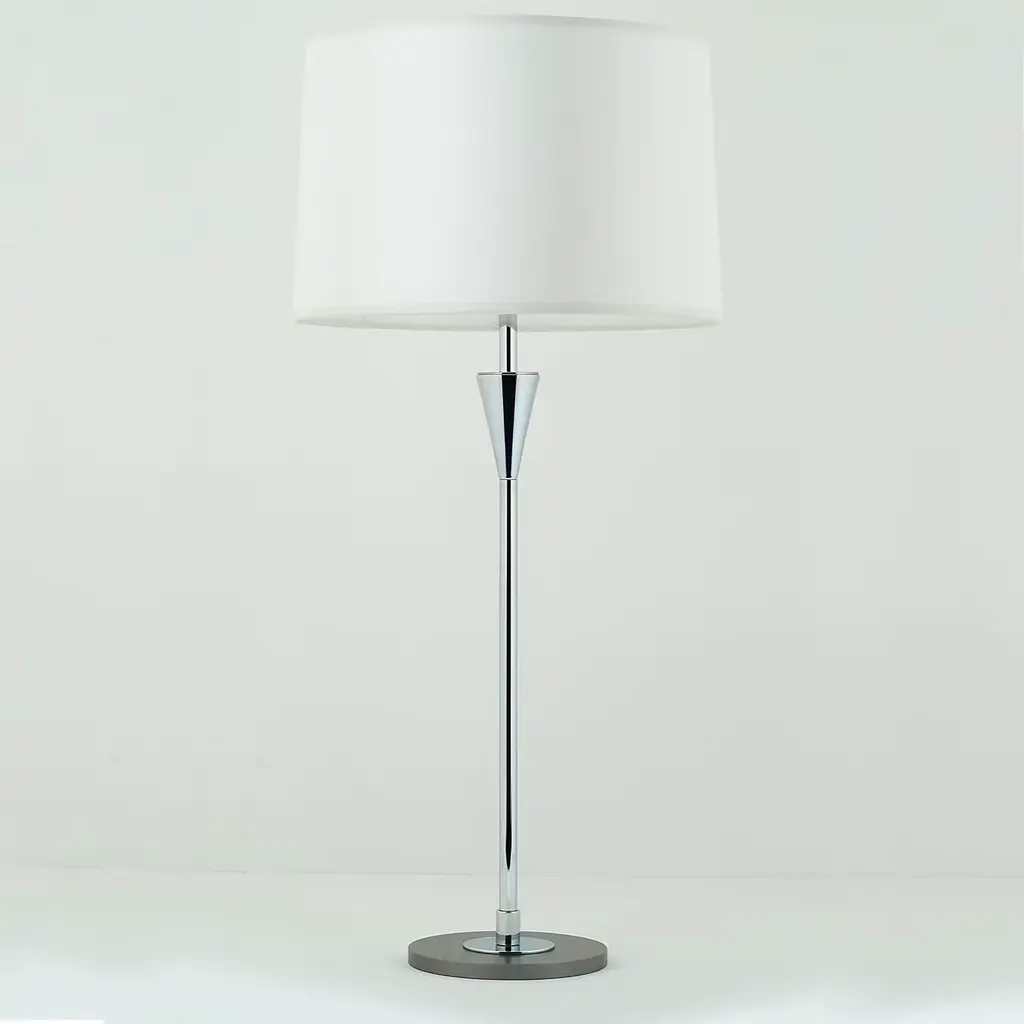 This sleek, minimalist table lamp boasts an eclectic mix of materials balanced in a contemporary design of great visual impact. Marked by a slender profile, this lamp is crafted entirely of chrome-finished brass with a cylindrical stem and showcases a drum shade of crisp white fabric. The fluted accent on the stem adds a thoughtful detail to this exquisite design that will be perfect on a console in a foyer or on a side table in a bedroom, imbuing any room with an intimate atmosphere and chic style. The lightbulb is E27 max 75W.