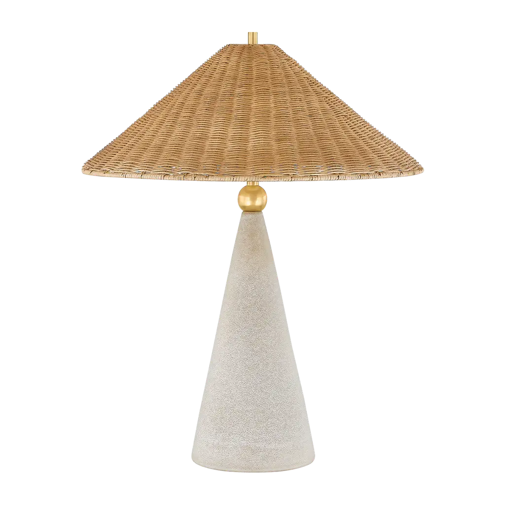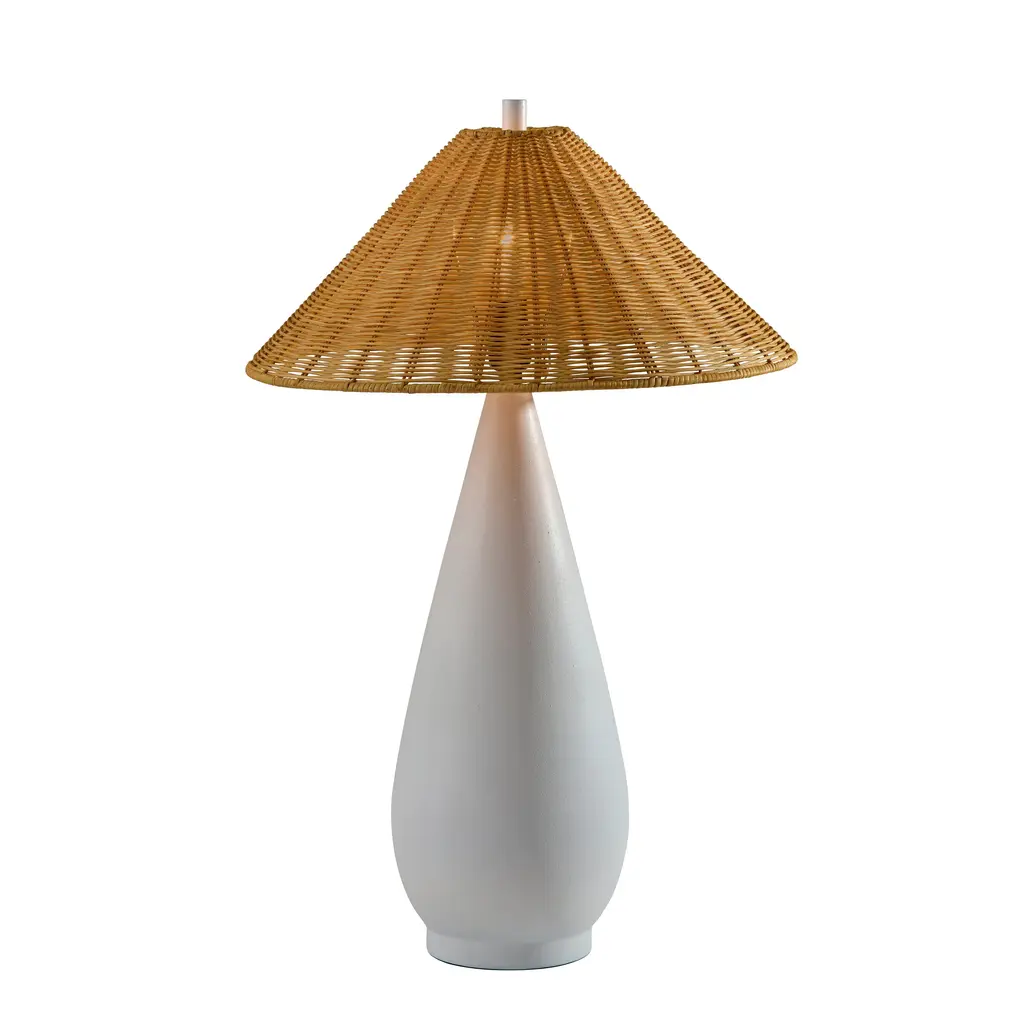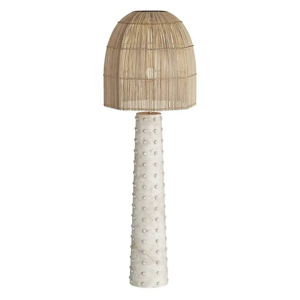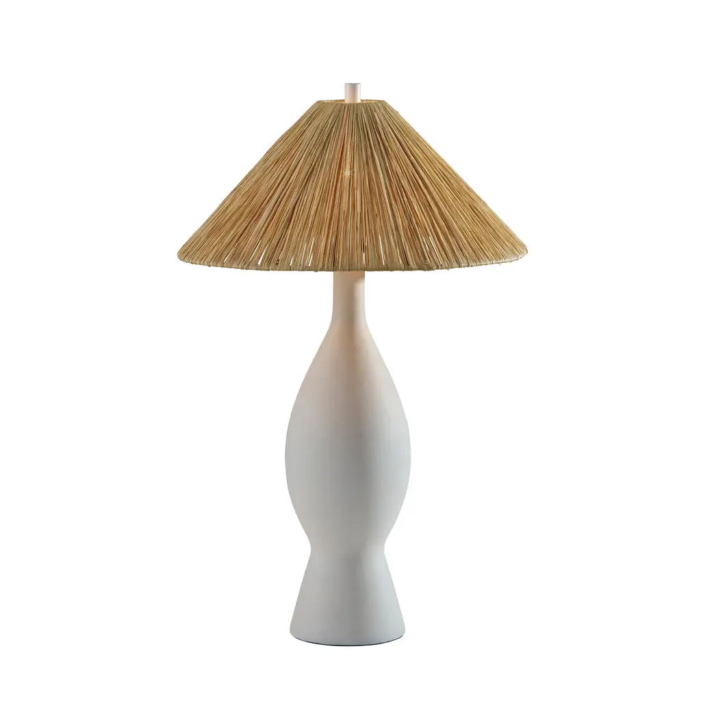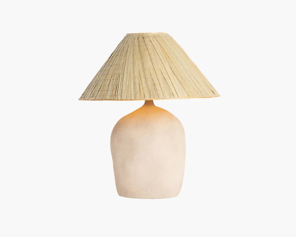 Finished in a neutral sand, a shapely talavera table lamp is topped with a natural palm shade, for a light, textural look. Overall dimensions: 22" Diam. x 26" H Shade: 22" Diam. x 10" H Weight: 12lbs Cord length: 7.25' E26 socket, LED bulb included. 60 watts or less recommended. Receives UPS delivery