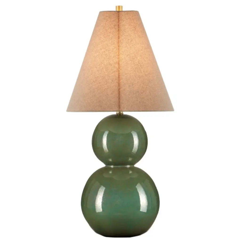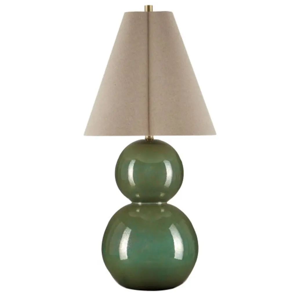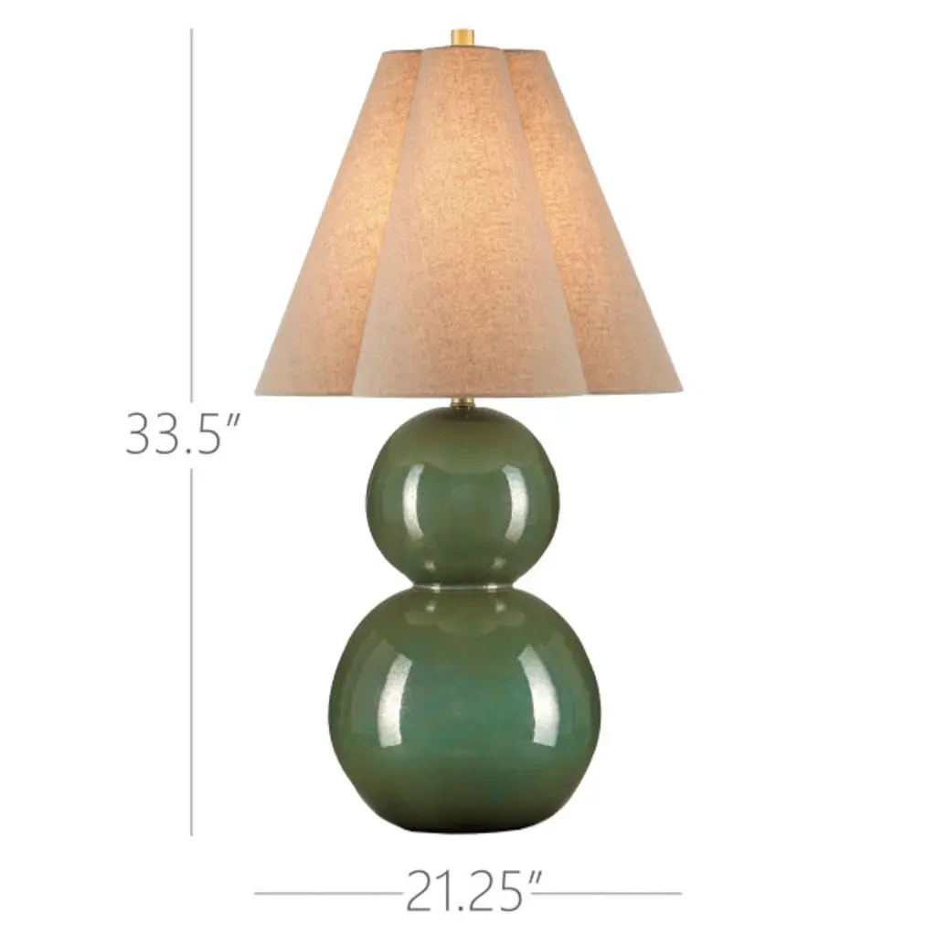 The Kindred Table Lamp features a double stacked-orb silhouette crafted from ceramic with a rich, mottled effect. The surface has a high-gloss sheen that adds striking luminosity. A clover-shaped shade that tapers upward brings an unexpected touch to the design. At 34.5 inches tall, this well-proportioned lamp is sized to stand out, making it a bold accent.
