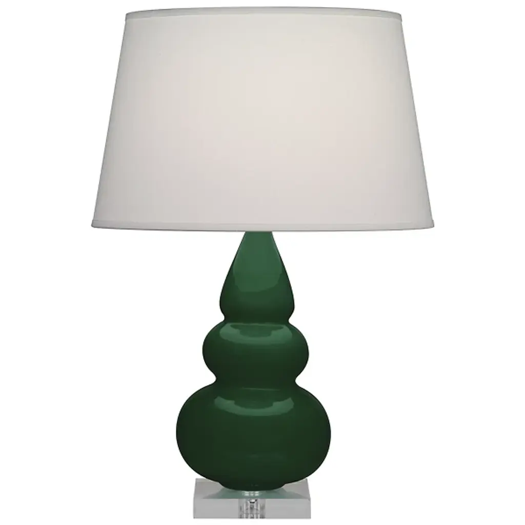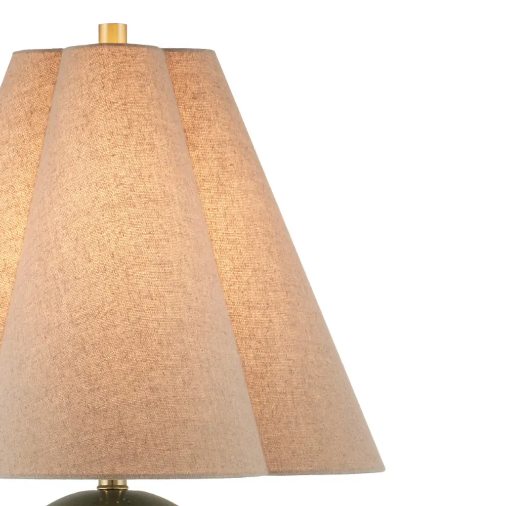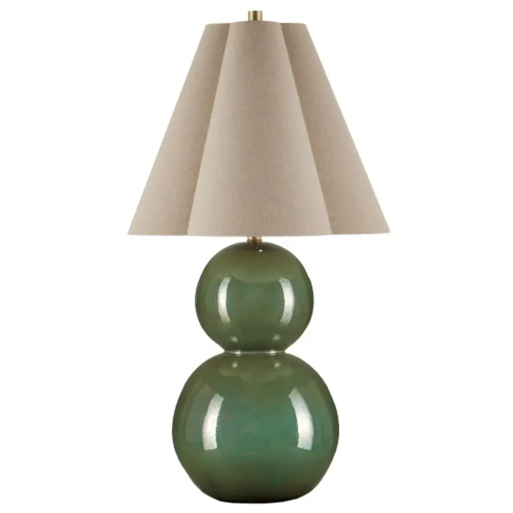 The Kindred Table Lamp features a double stacked-orb silhouette crafted from ceramic with a rich, mottled effect. The surface has a high-gloss sheen that adds striking luminosity. A clover-shaped shade that tapers upward brings an unexpected touch to the design. At 34.5 inches tall, this well-proportioned lamp is sized to stand out, making it a bold accent.