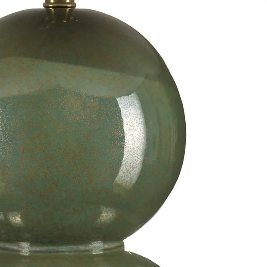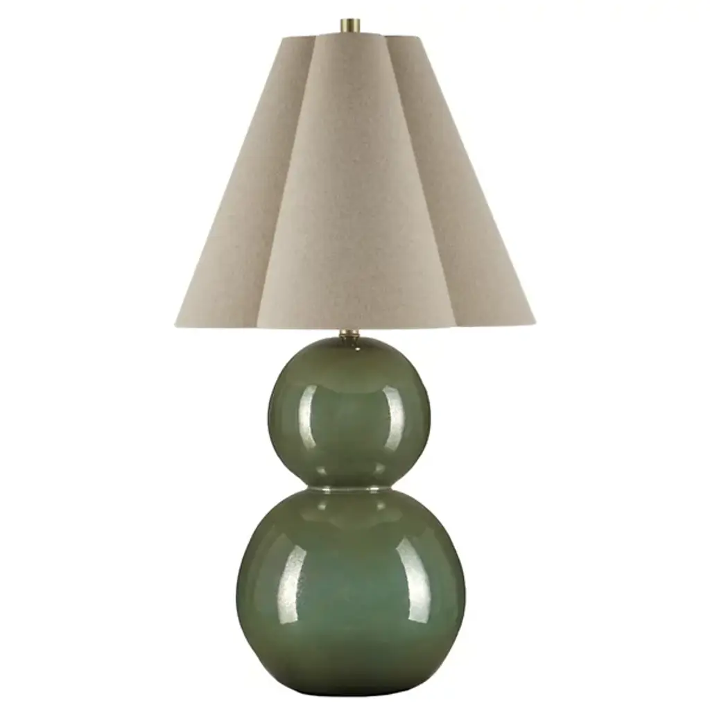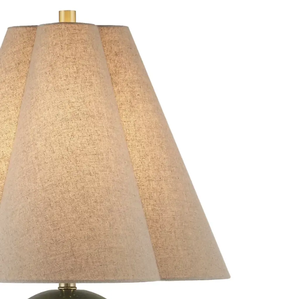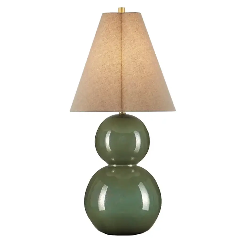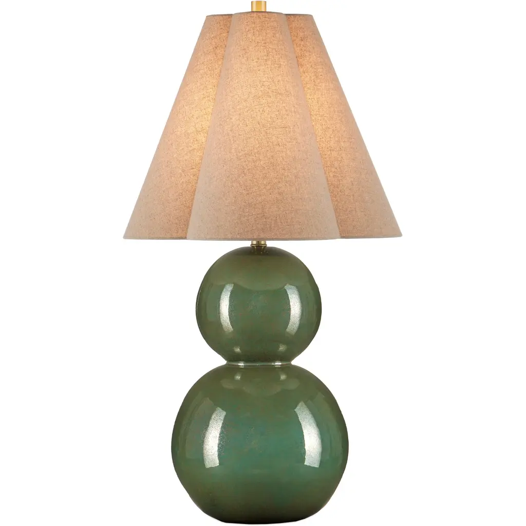 The Kindred Table Lamp from Currey & Company features a sculptural base created by stacking two ceramic spheres, offering unexpected proportions. The glazed surface produces a mottled pattern that shifts between different textures, adding depth to the rounded forms. Light reflects across the curved ceramic, enhancing the lamp's presence in any room. A natural linen shade tapers upward in an unusual clover shape, adding geometric interest to the design while softening the overall appearance of this substantial piece, which fits well in home offices, studies, or other living areas.