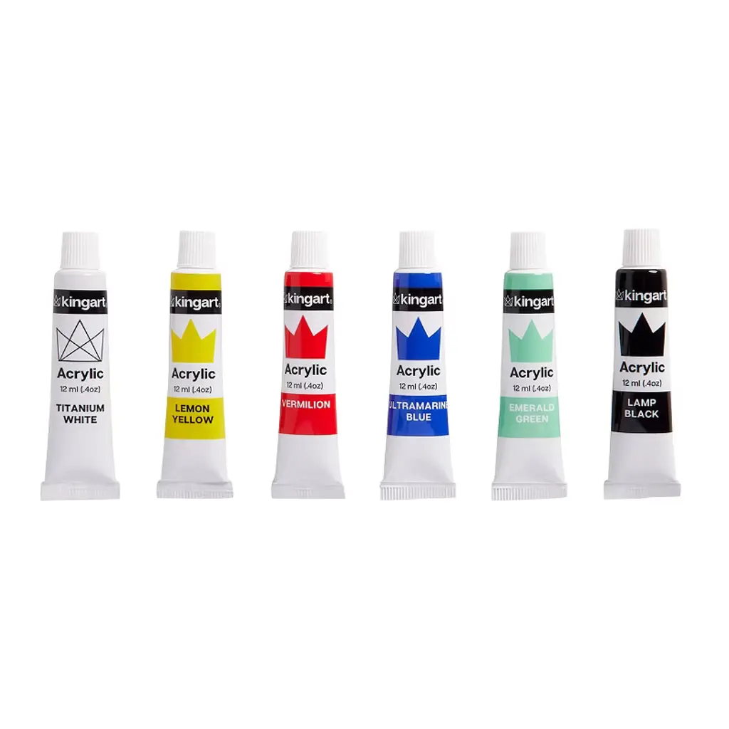 KINGART® Studio Acrylic Painting Set with Tabletop Easel and Canvas Panels, 15 Piece Set 6 Tubes Acrylic Paint 12ml 1 Plastic 6-well Palette3 Bristle Paint Brushes - Flat -6, Round - 2, 42 - 8x10" Pure Cotton Canvas Panels2 - 5x7" Pure Cotton Canvas Panels1 Tabletop A-Frame Easel ** Picture of Paintings not included All the essentials for getting started in acrylic painting No matter the space that you have to work in, this compact art set is sure to be a perfect fit. Small tabletop easel holds up to 12" canvas and folds down for easy storage. Bring your artwork to life with bristle brushes and superior performance acrylic artist paints. They're water-based for easy use and clean-up, and every color is made with high quality pigments that lay down brilliantly and stay that way. Need to Know: Professional Quality 100% Cotton 8-Ounce Triple Primed Artist Canvas Panels - Hand stretched over high quality rigid cardboard. Includes: (2) 8x10" and (2) 5x7" panels 6-Color Acrylic 12ml Artist Paint Tubes. Color Palette: Titanium White, Lemon Yellow, Vermilion, Hooker's Green, Cobalt Blue, Lamp BlackWood Mini Table Easel with Single Tripod Back Leg & Chain Support - Easel Size: 9 1/2" Wide x 8" Deep X 12" High -- Holds Canvas up to 12"With so many different pieces, you'll have everything you need to create your masterpiece. Conforms ASTM D4326 The KINGART® Heritage No Rules. Just Art. Not just a tagline on KINGART packages but a belief fundamental to our core mission to support the need for individual expression with creative materials covering a host of visual media. Founded in 2017, the DNA of the KINGART® brand has a rich heritage and our family has been exceeding the needs of the most ambitious artists and enthusiasts for three generations. We delight in challenging the status quo and putting our experience to work for you because art is for everyone!