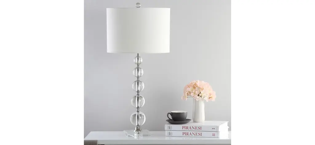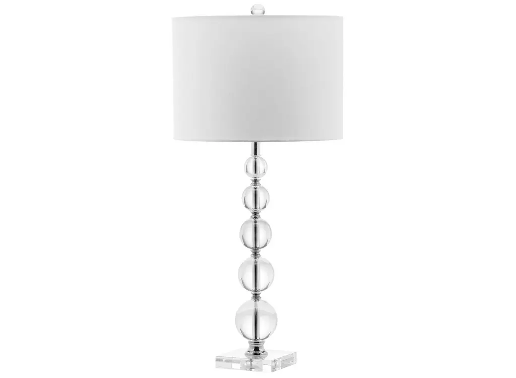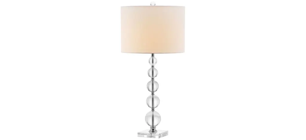 Dress up a hallway console or living room table with the glamorous Kingship Stacked Crystal Ball Lamp. With an off white linen drum shade and five graduated clear crystal balls floating on a square see through stand, this transitional design bridges classic and contemporary interior decorating styles.