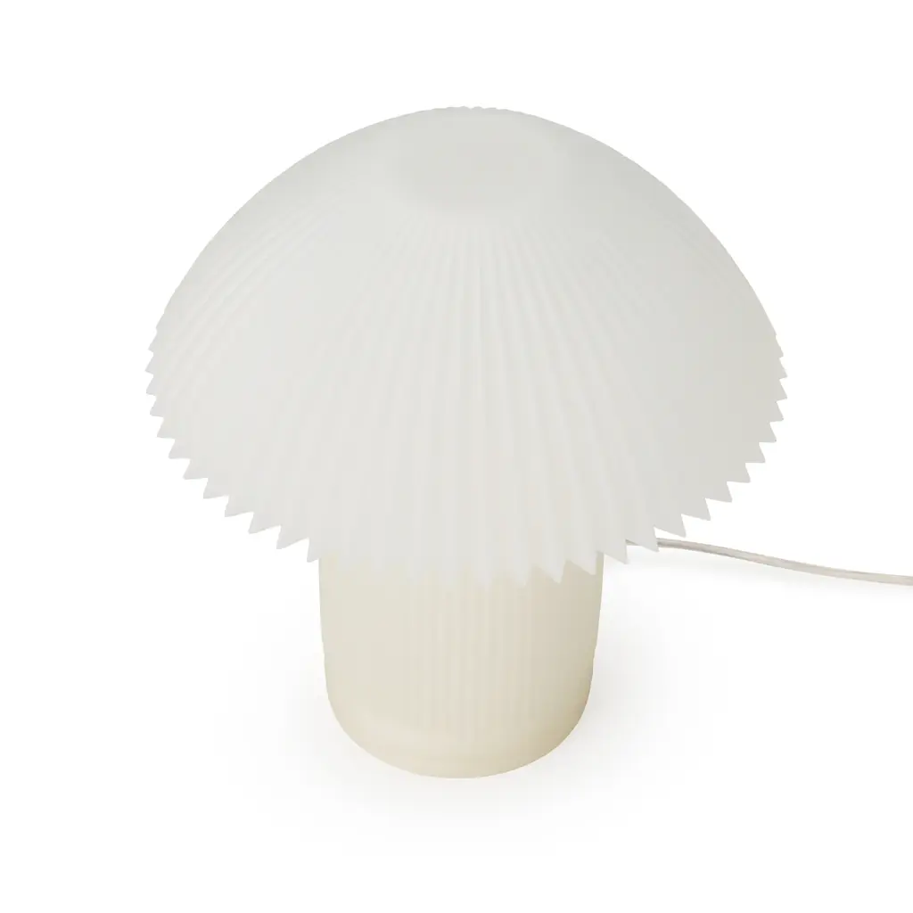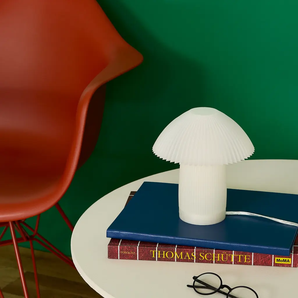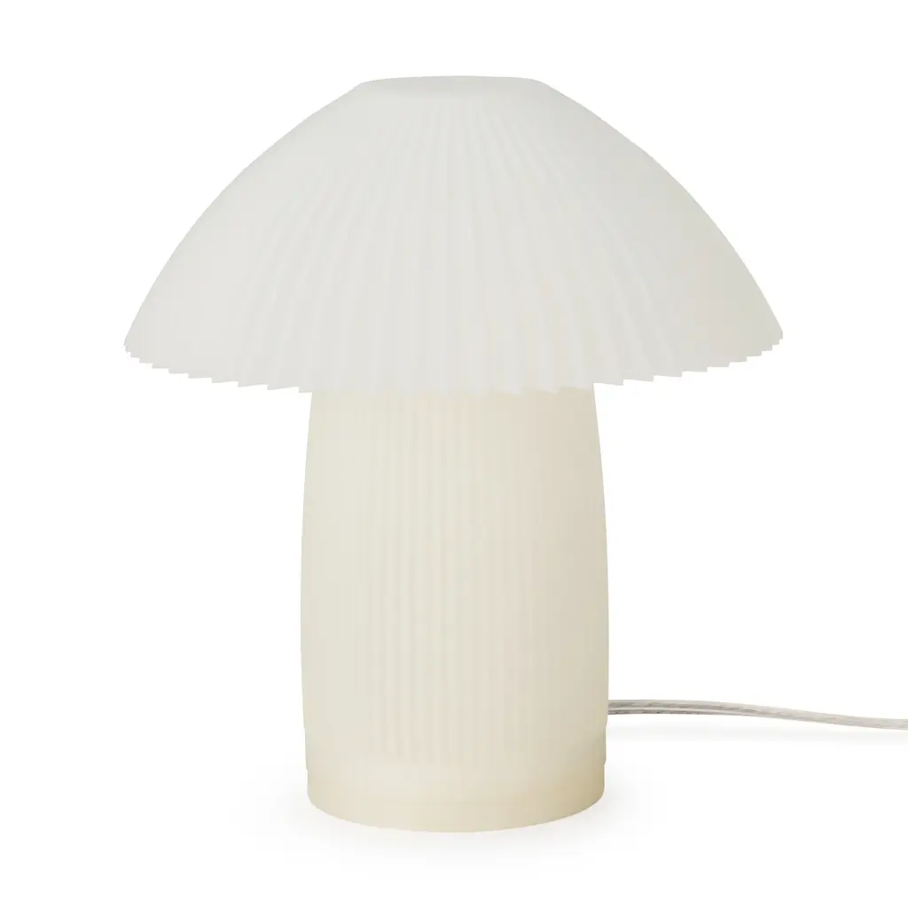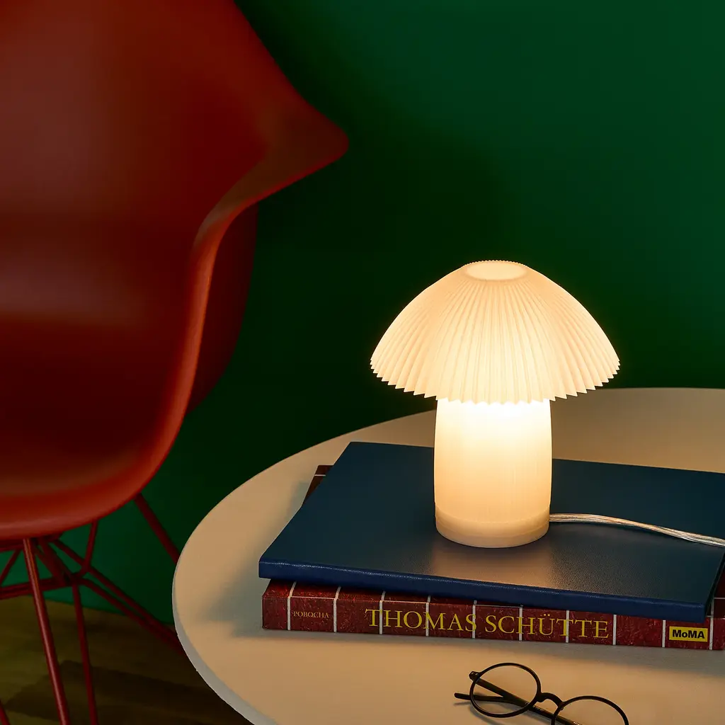 MoMA Exclusive: From the designer of the best-selling Wavy Lamp, Sean Kim, comes this lamp with a design inspired by mushrooms and pleated fabric. (“Kinoko” is Japanese for “mushroom.”) Using the 3D-printing technique Kim is known for at the Brooklyn-based brand Wooj, the Kinoko Lamp is composed of recycled PLA plastic in an accordion pattern. The quality of the light it emits is soft and diffuse, thanks to the carefully engineered 3D-printed plastic. Made in Brooklyn, it uses an LED 2W E12 bulb (included) The Kinoko Table Lamp measures 7.5h x 6.5"diam. and is powered by standard plug-in with an 8"l cord. Some assembly required. For instructions on how to change the lightbulb, click here.