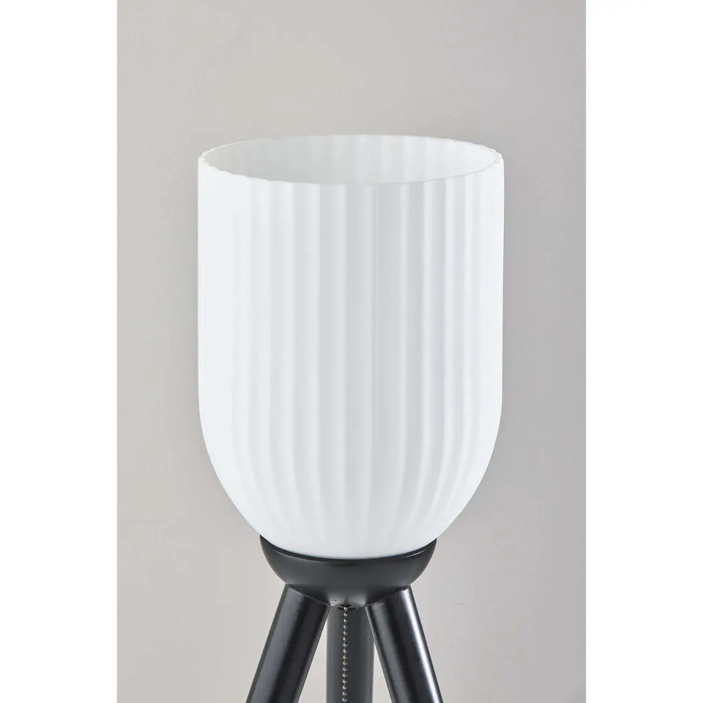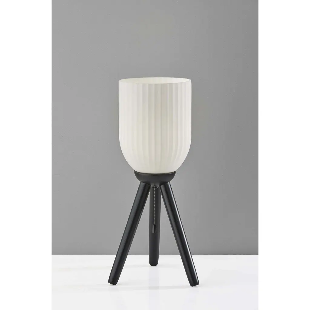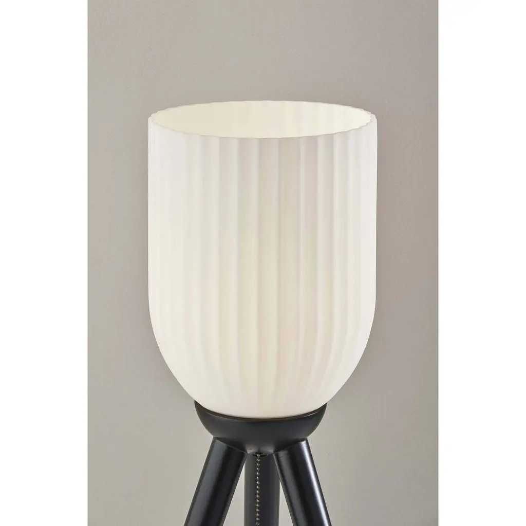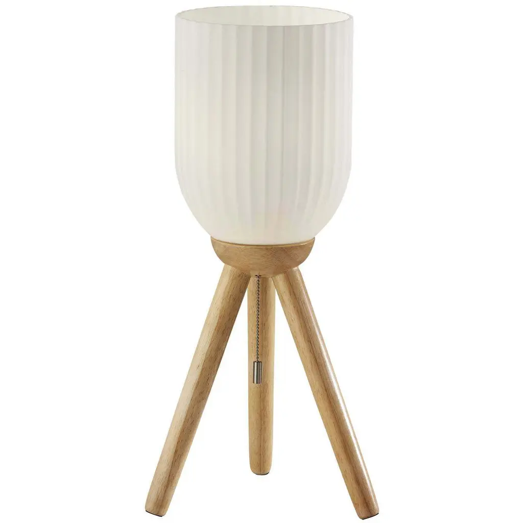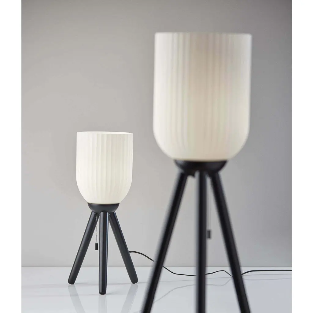Illuminate your space with the Kinsley table lamp's stunning mix of materials and geometries. A black wood tripod base supports a tall, cylindrical glass shade. The frosted ribbed glass softly disperses the light from a 60W bulb outward. The lamp is easily turned on or off with a pull chain switch suspended from the base of the glass shade. To complement coastal or farmhouse styling, the table lamp is also available with a natural wood base. Complete your décor with the coordinating Kinsley floor lamp.