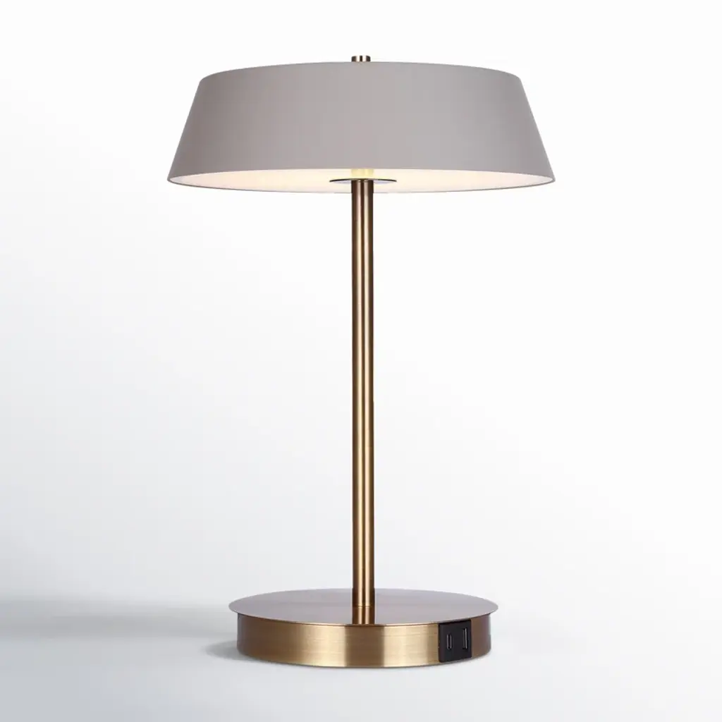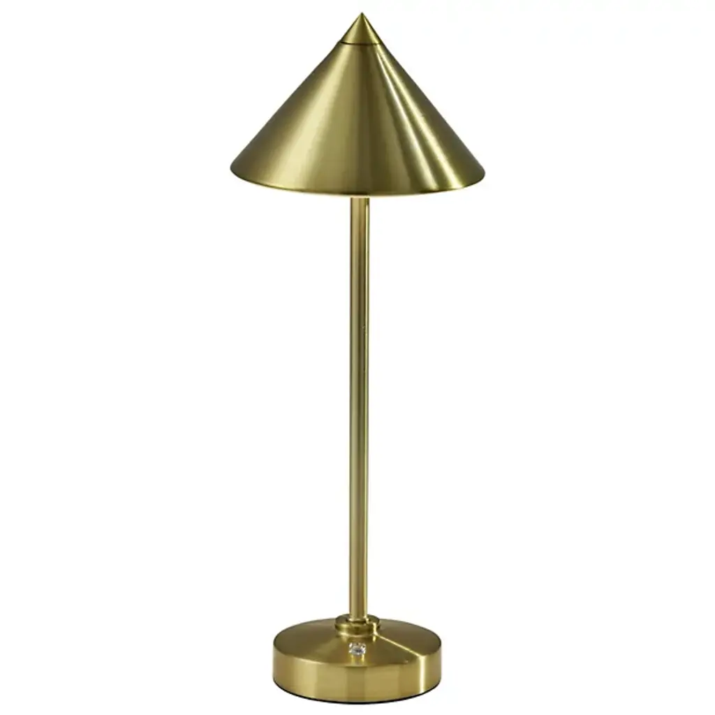 Petite cordless table lamps are one of our favorite new ways to light a dining table, bar cart or small nightstand. Our Kit LED Lamp turns that versatile, go-anywhere function into fabulous. The round stepped base and slender stick stem are crowned with a pretty scalloped metal shade in matching color. On/off button is hidden in the top. LED light has three brightness levels and burns for up to six hours fully charged. Kit Scalloped LED Lamp features: