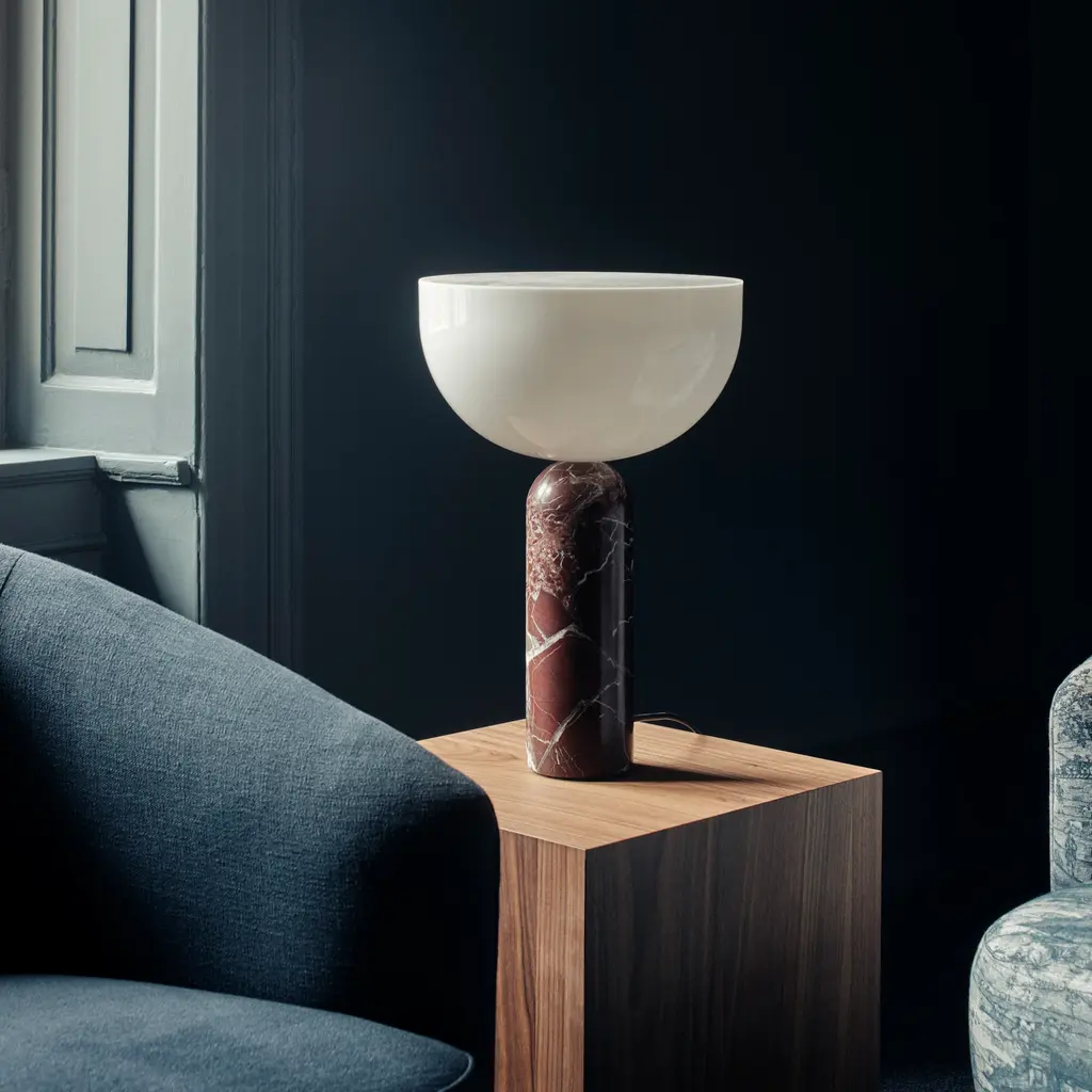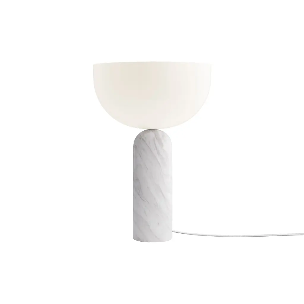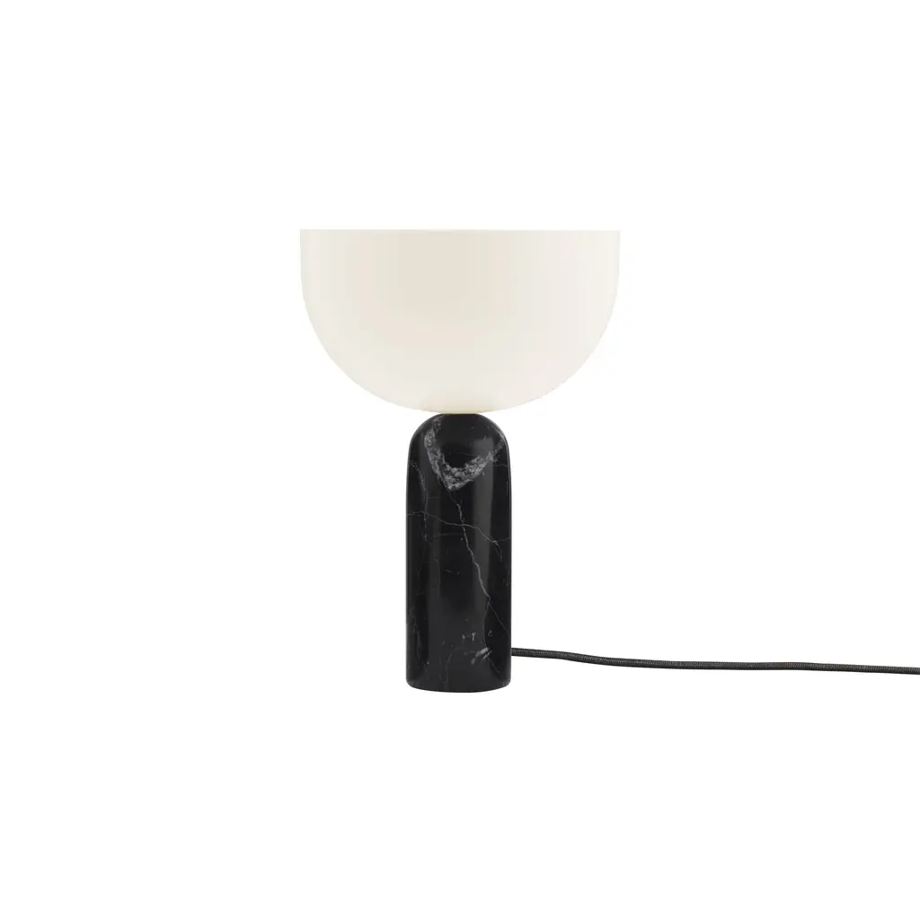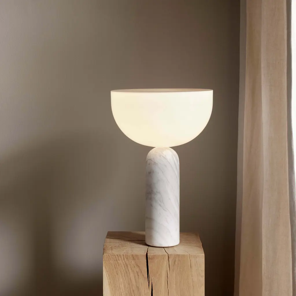The Kizu Table Lamp by Lars Tornøe is characterized by two sculptural forms that seem to balance weightlessly on top of each other. The hemisphere-shaped, glare-free acrylic diffuser appears to float atop a rounded marble base, producing a striking visual effect. Available in white, black, and Gris du Marais marble finishes, and in two sizes.