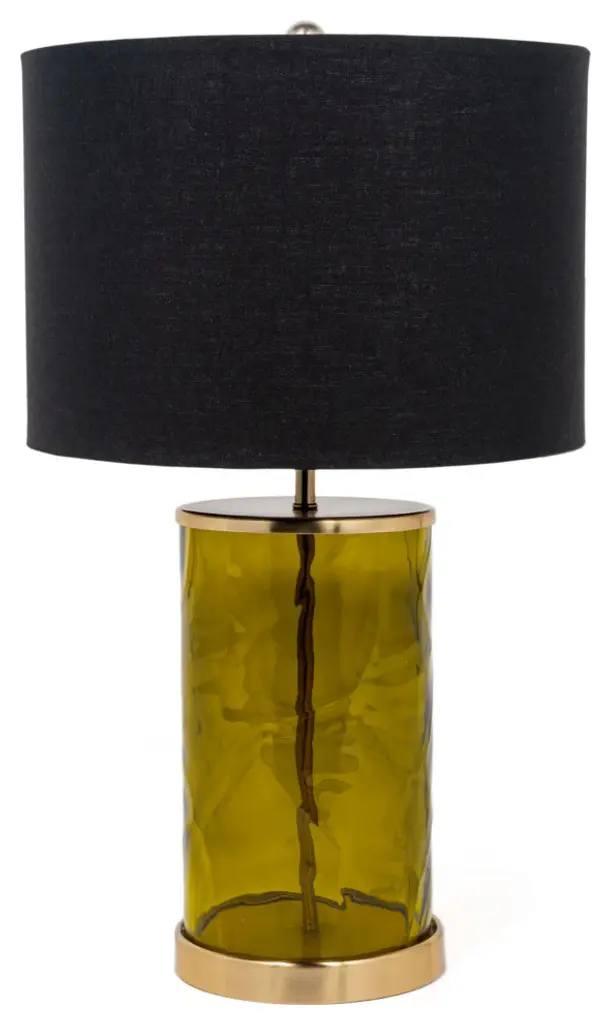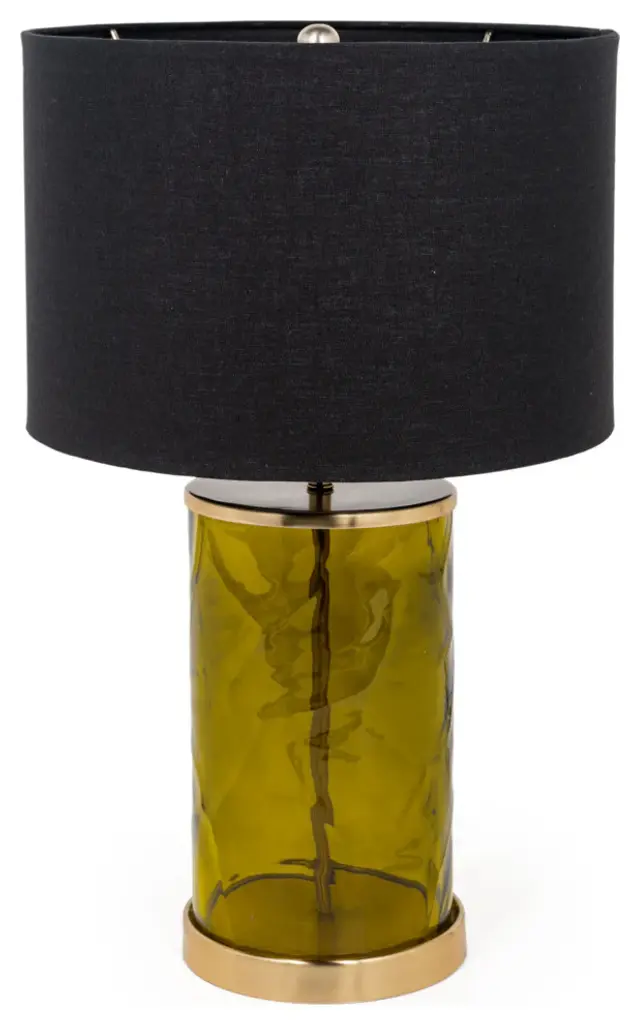 Introducing the perfect blend of elegance and sophistication, this table lamp is sure to elevate the style of any room. The hand-blown green glass base gives off a unique and artistic vibe, while the black lampshade adds a touch of mystery and drama. The gold metal details add an air of luxury and glamour. Measuring 13 inches wide and 22 inches tall, this table lamp is the perfect addition to any living room, bedroom or office. Light up your space in style with this one-of-a-kind pieceProduct Size: 13" x 13" x 22"Base Size: 6.5" x 6.5" x 14"Hand Blown Green Glass BaseBlack ShadeClear CordGold Metal DetailsNot Included, Standard E26 bulb Type A 60WStyle: Contemporary, Modern