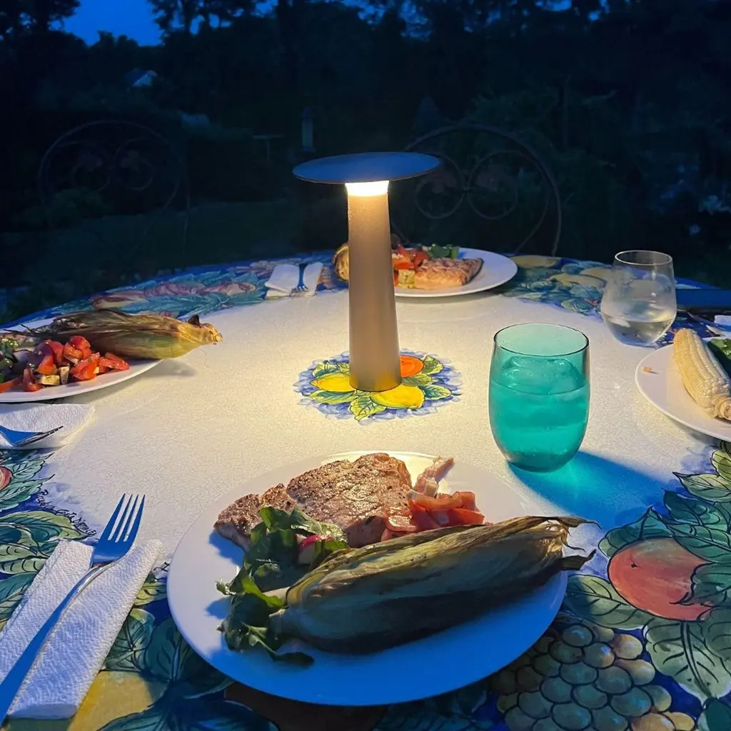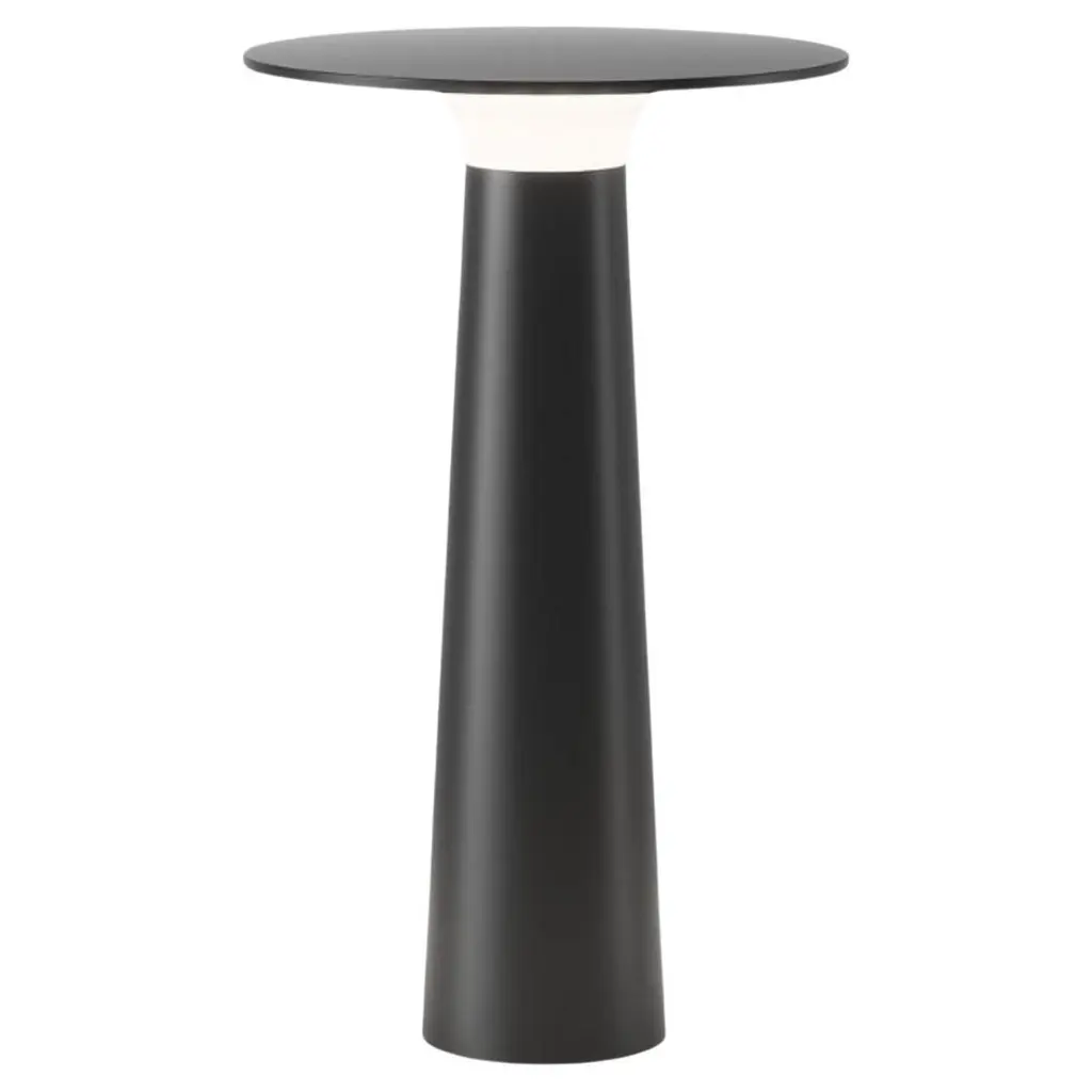 Klaus Nolting 'Lix' portable outdoor aluminum table lamp in sage for IP44de.Founded in 1933 in East Westphalia, Germany, IP44.DE has quickly become one of the most innovative outdoor lighting companies in Europe, producing innovative pieces manufactured with detailed precision to the highest quality standards. Combining beauty with durability, this family run business has seen its space defining designs illuminate noted commercial, public and residential projects all over the world.The 'Lix' portable rechargeable indoor/outdoor table lamp provides the perfect solution to your evolving outdoor luminary needs. Designed to go anywhere, the lamp's body is executed in durable die-cast aluminum fitted to a matte polycarbonate diffuser. The resulting output is a highly refined IP44-rated lamp with a glare-free light cast down and outward in all directions. Coupled with two internal lithium ion batteries, the 'Lix' is capable of providing up to 45 hours of continuous light.Price per item. Available in unlimited quantities and in choice of gold, bronze, pearl, black, ruby, sage or sun colors. This listing is for 'Lix' rechargeable indoor/outdoor table lamp in sage. Please note in stock lead time of 3-4 weeks. Out of stock can add an additional 8 weeks or more. Inventory availability & lead times are subject change without notice. Please contact us for current lead times prior to placing time sensitive orders.Illuminated via integrated internal LED providing 4.2 watts, 200 lumens at 2700k color. Powered by two 2600 mAh internal lithium-ion batteries and recharged with the included 3.9' black USB-C cable. Dimmable by touch with 4 preset levels. IP44 rated. Not UL listed, but recommended UL listing possible from an authorized 3rd party vendor for an additional fee. Contact us to facilitate.Made to order. All sales are final.