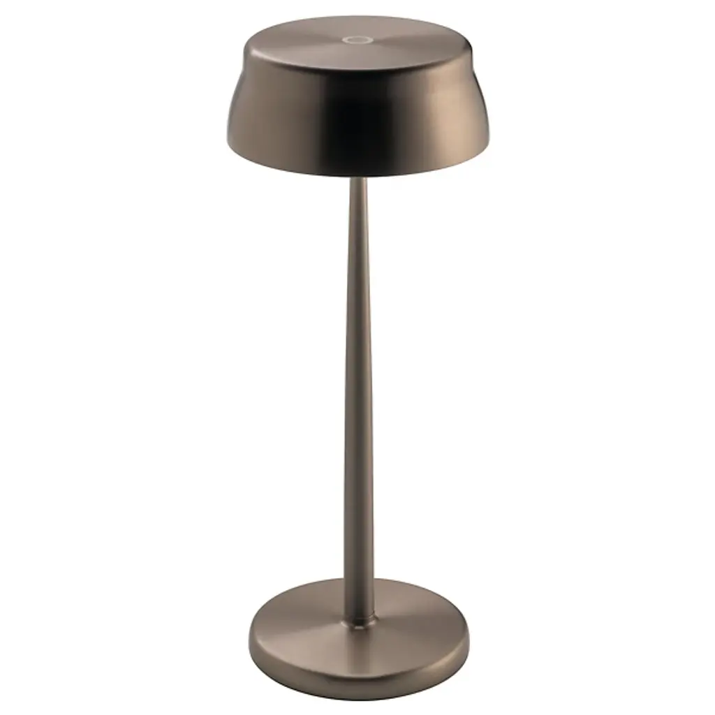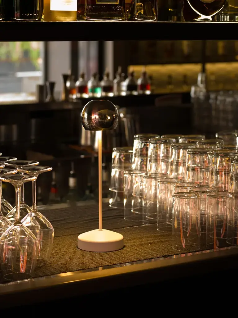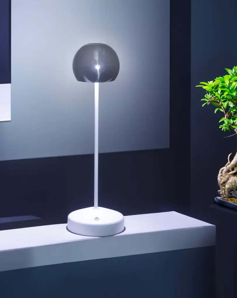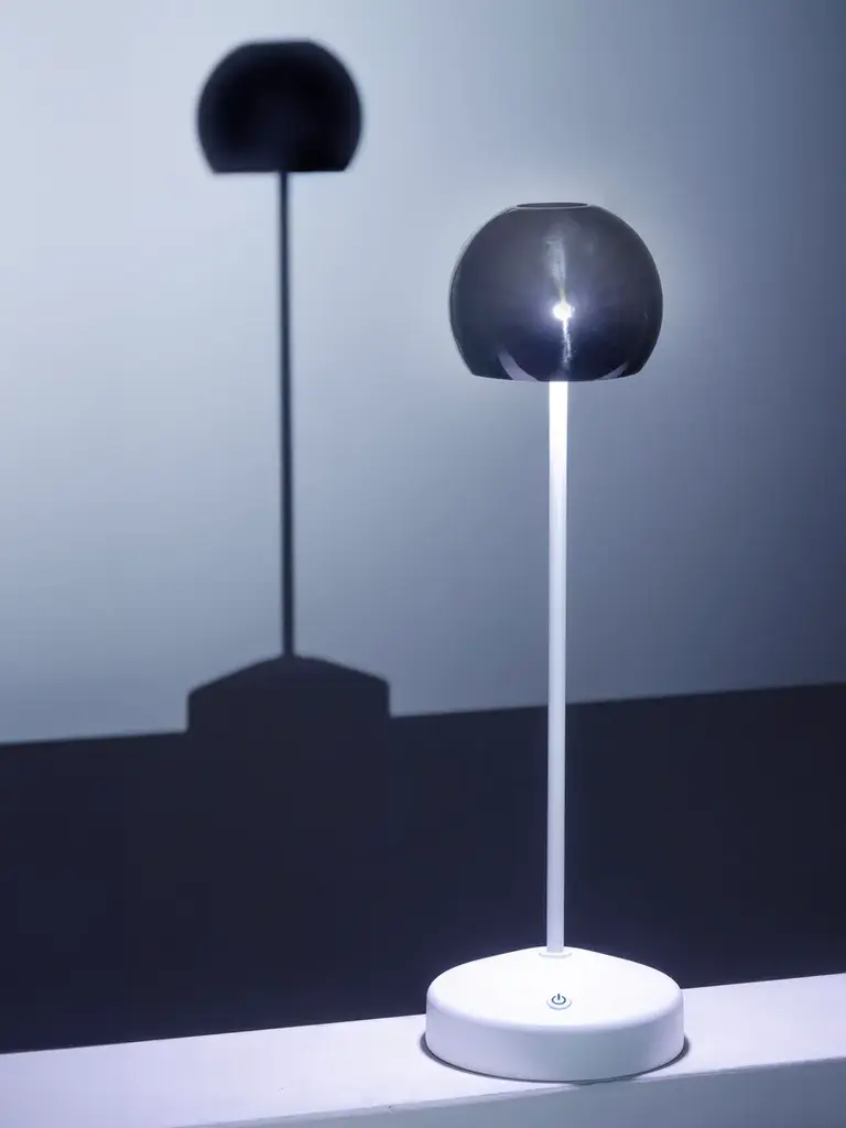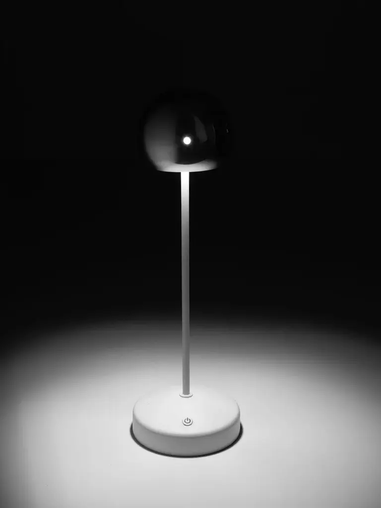 A rechargeable table lamp for tight-knit couples. KNOB can radiate its light in 4 different directions: a diffuse light to the bottom, illuminating the table with a warm glow; a soft light through two small side holes, so the two tablemates have their faces gently lit; a circle of light coming from the top cut, surrounding the love affair.Dimensions: stem: Ø 0,8 cm. H.35 cm. Diffuser: Ø 9 cm. H.7 cm. Base: Ø 11 cm. H.4 cmPower consumption: 3WNet weight: 0,6kg.