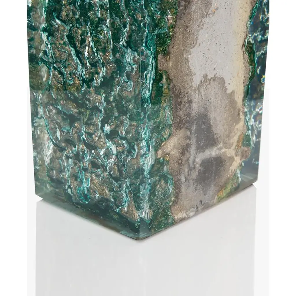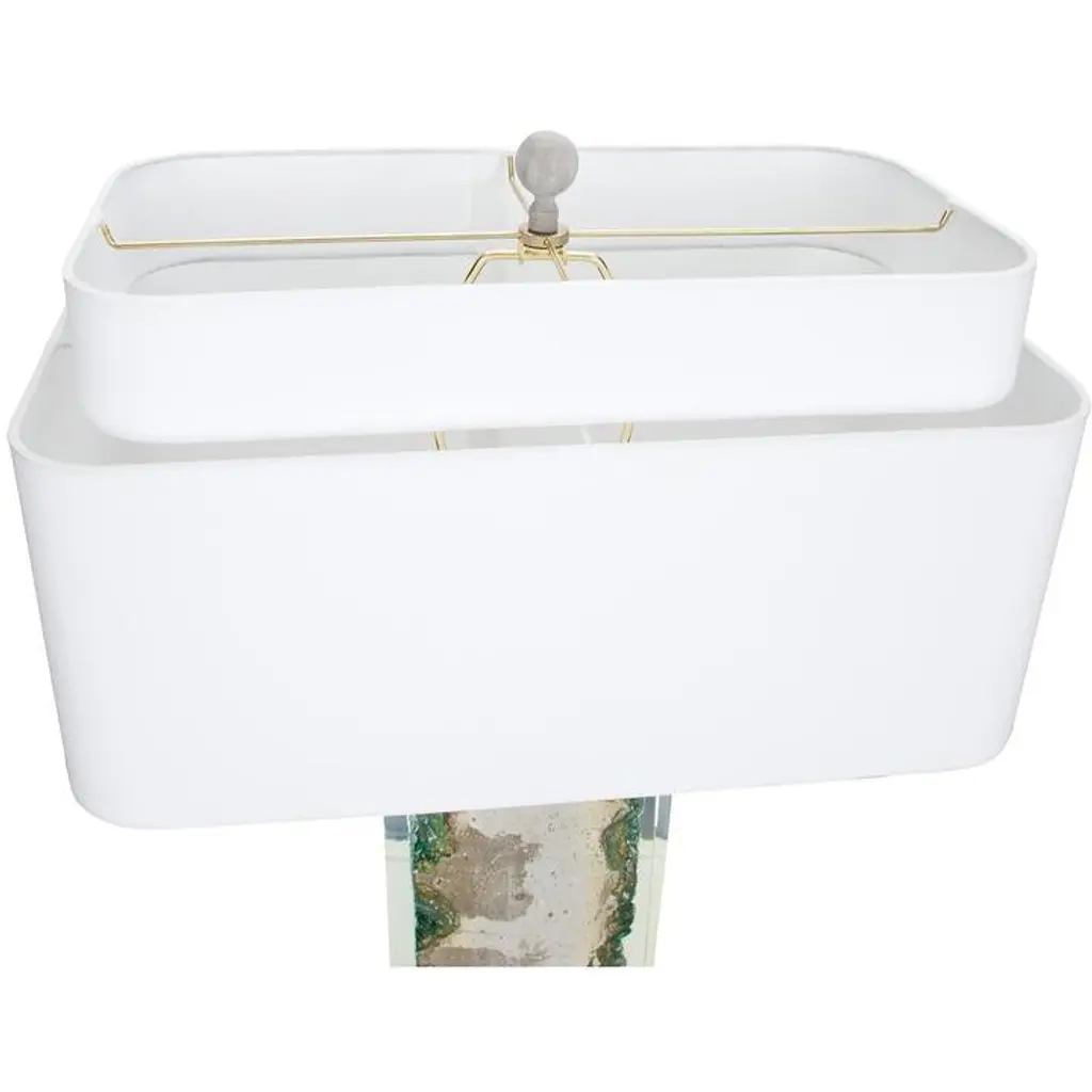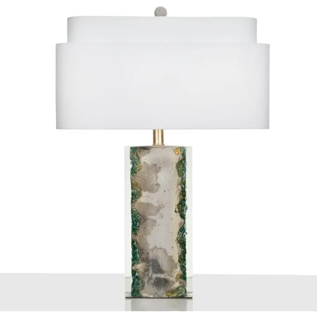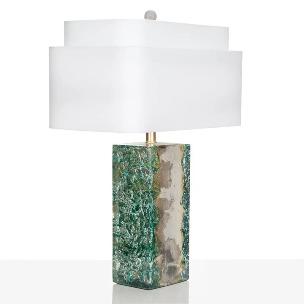 A work of art. We have taken a cement column, chipped away at the edges. Then covered the chipped edges with gold leaf...leaving them to oxidize. Once complete - we place in a mold with clear resin. Creating an individual work of art, where no two will be alike. Topped with a double layer rectangular hardback in white linen. Artisan-crafted in Vietnam, exclusively for Couture. Finish/Color:Grey Cement + Oxidized Gold Leaf + Clear Resin Lamp Width/Diameter:6.5" Height Base to Shade: 14.25" Lamp Depth: 4.75" Overall Height: 26" Voltage: 120Wattage: 100w Type: 3-way Shade Width/Diameter: 19" Shade Height: 9"Shade Details:17/9 x 17/9 x 2.5 top layer; 19/11 x 19/11 x 7.5"H bottom layer; Double Layer Hardback Shade in White Linen Hardback Shade