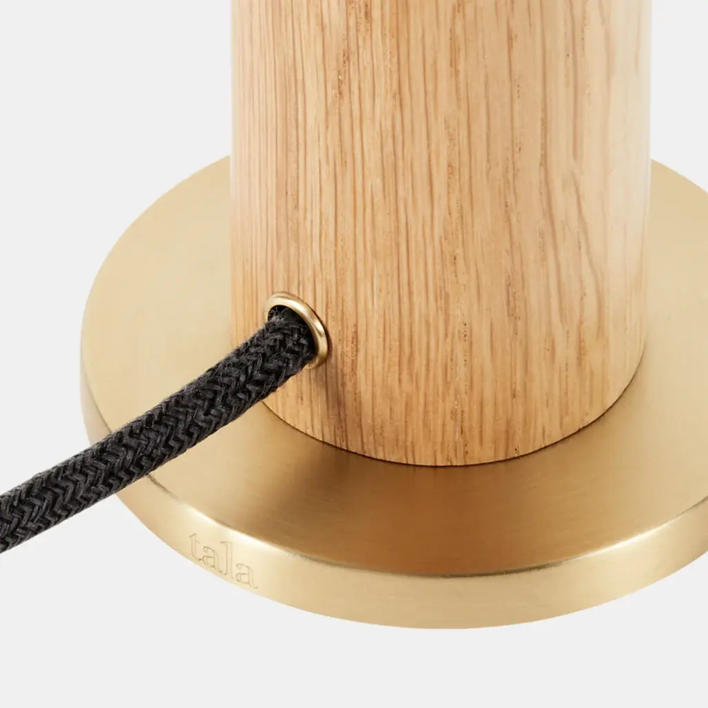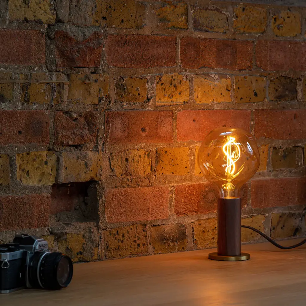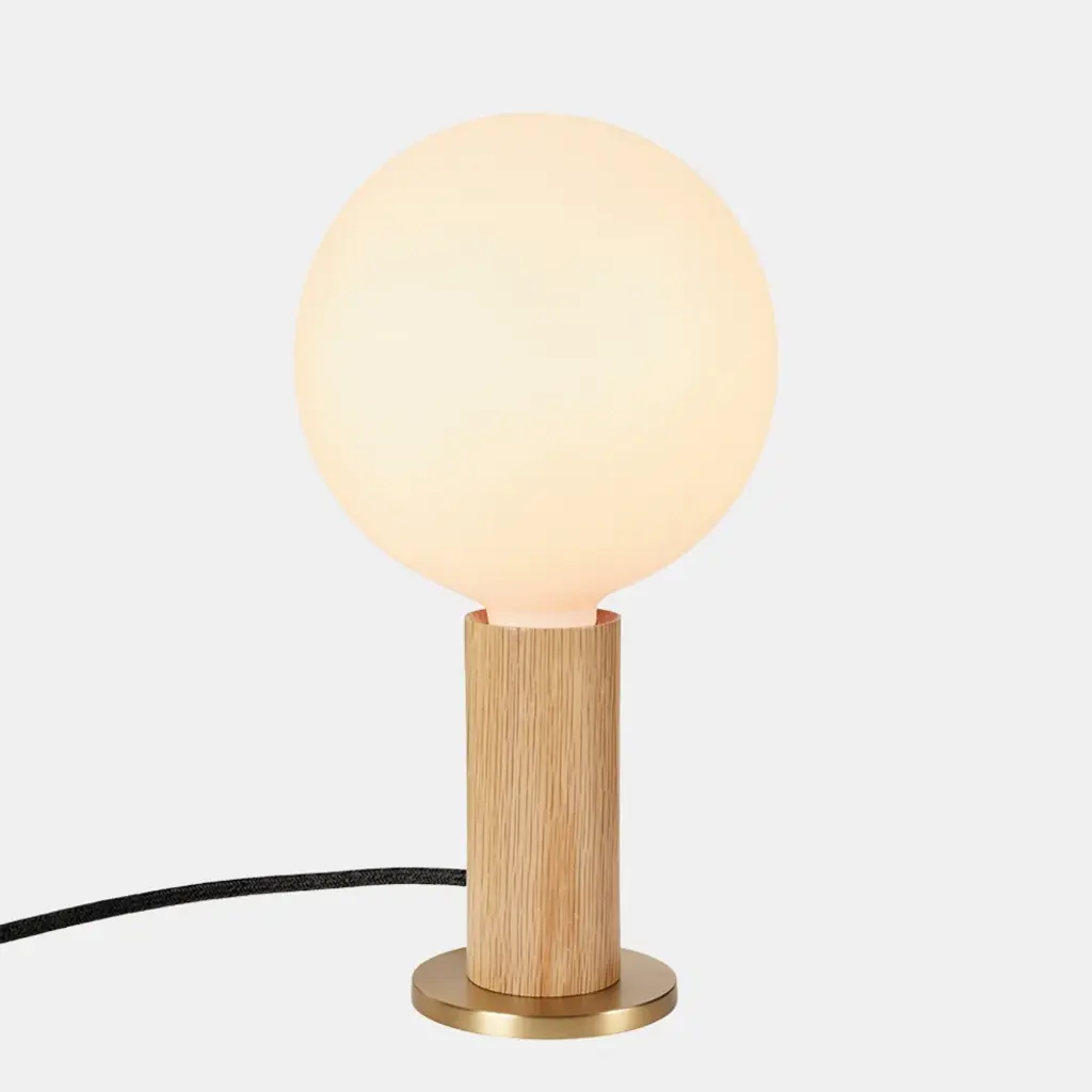 Designed to celebrate the beauty of the lightbulb, the Knuckle Lamp combines a solid wood base with a satin brass or gunmetal base ring for stability. The lamp is offered with two distinct bulb options—a matte white Sphere IV bulb or the unique Voronoi I bulb.